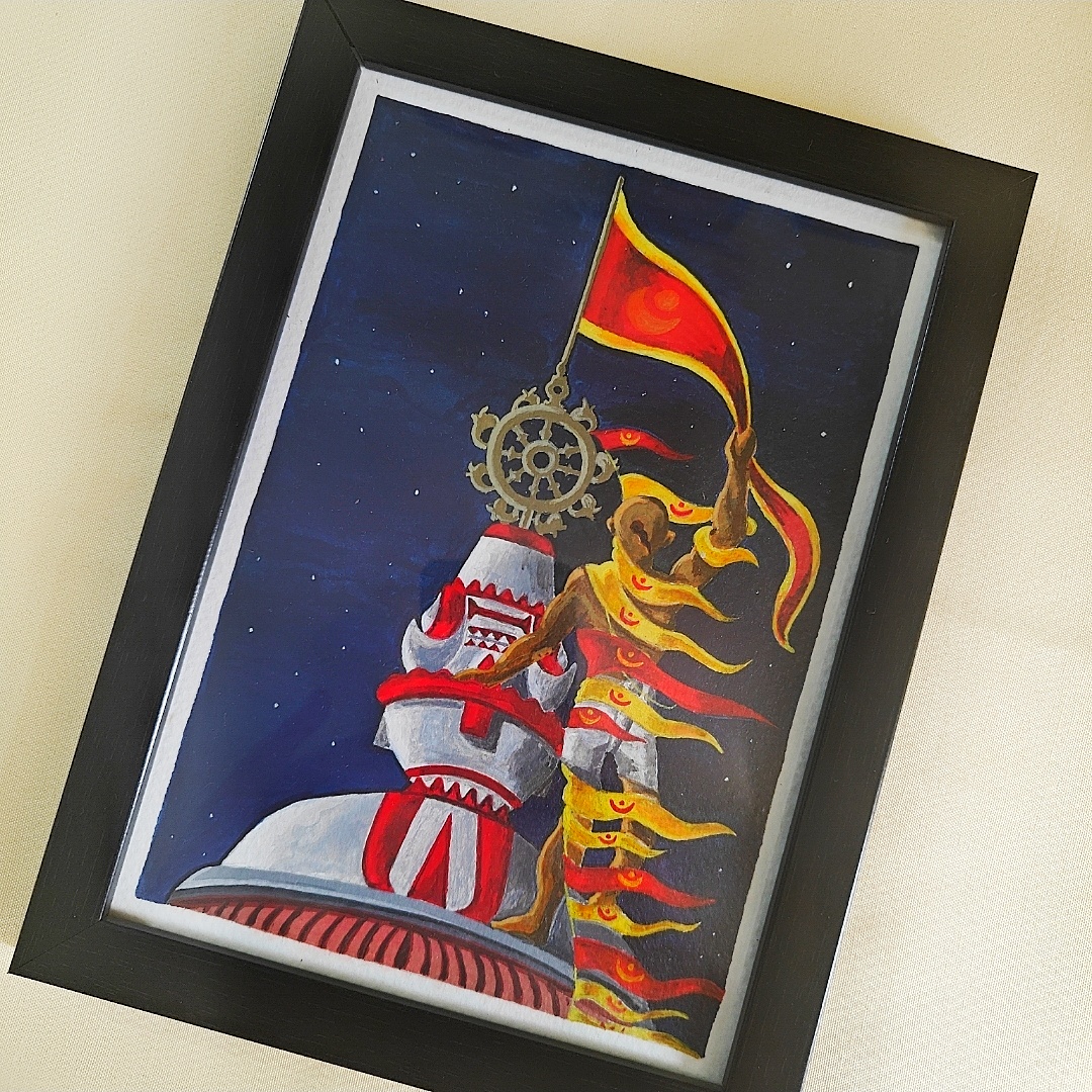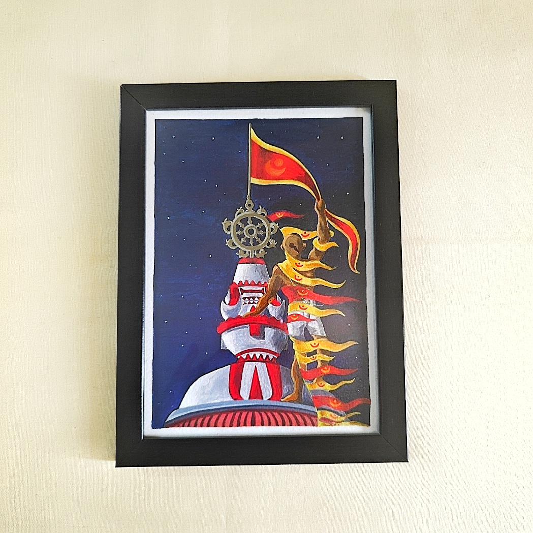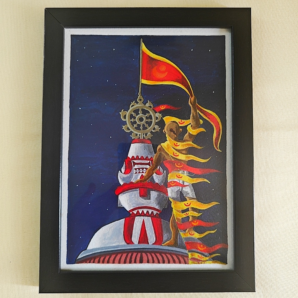 Witness the divine courage and unmatched devotion of the Dhwaja Sevak as he climbs the towering spire of the sacred Jagannath Temple in Puri. This striking acrylic painting captures a breathtaking moment under the night sky — where the sacred flag, fluttering beside the Nilachakra (blue wheel), becomes a symbol of unwavering faith. The sevak’s agility, the powerful motion of the flag, and the iconic temple dome are brought to life with rich colors and dynamic brushwork. Deep blues, reds, and golds contrast beautifully to convey both serenity and spiritual energy. Perfectly framed in black, this artwork radiates not just cultural pride but a sense of spiritual awe and heroism. A piece that transcends religious symbolism to celebrate timeless tradition and fearless service.
