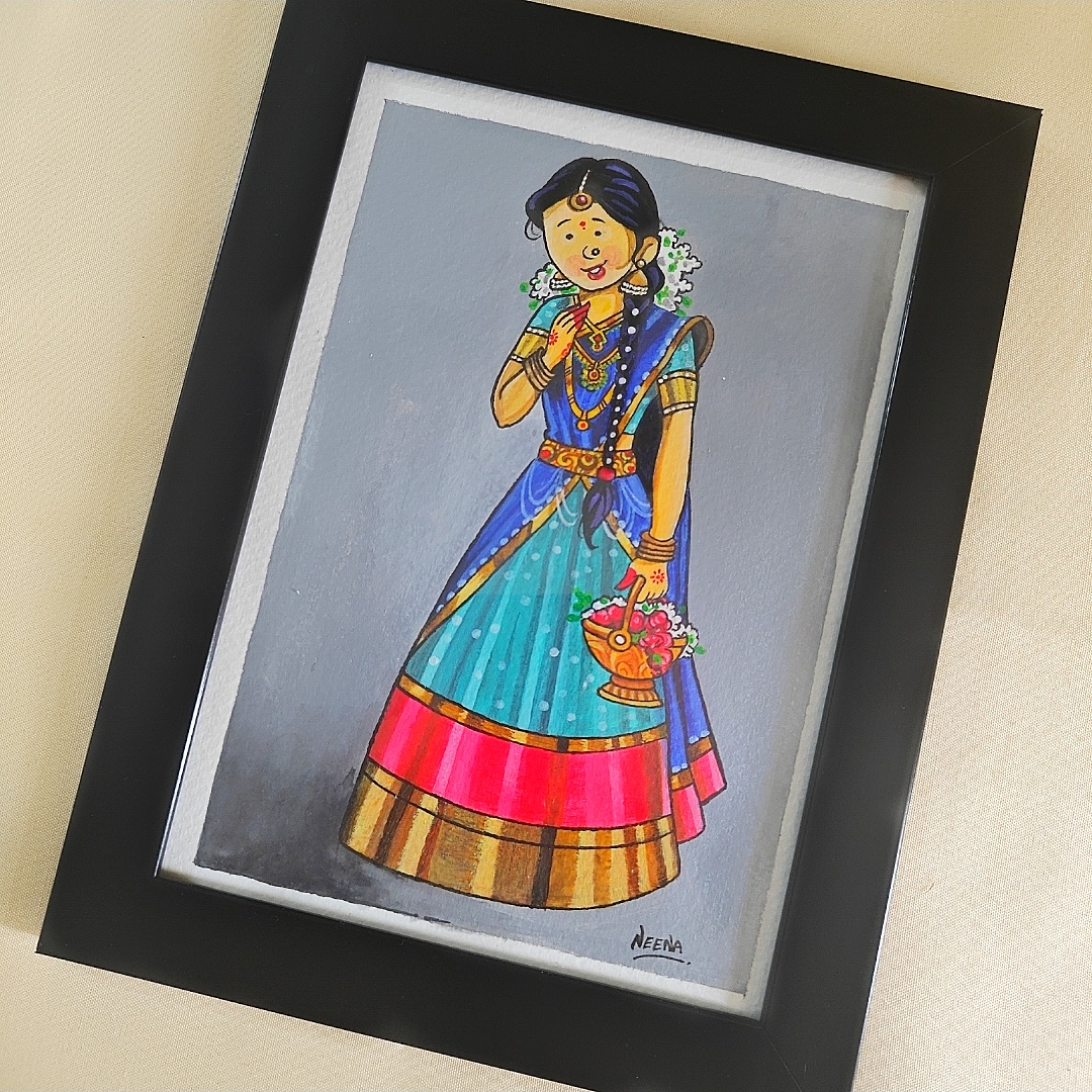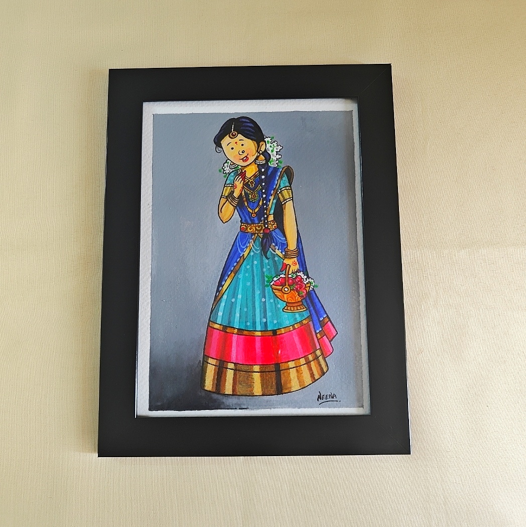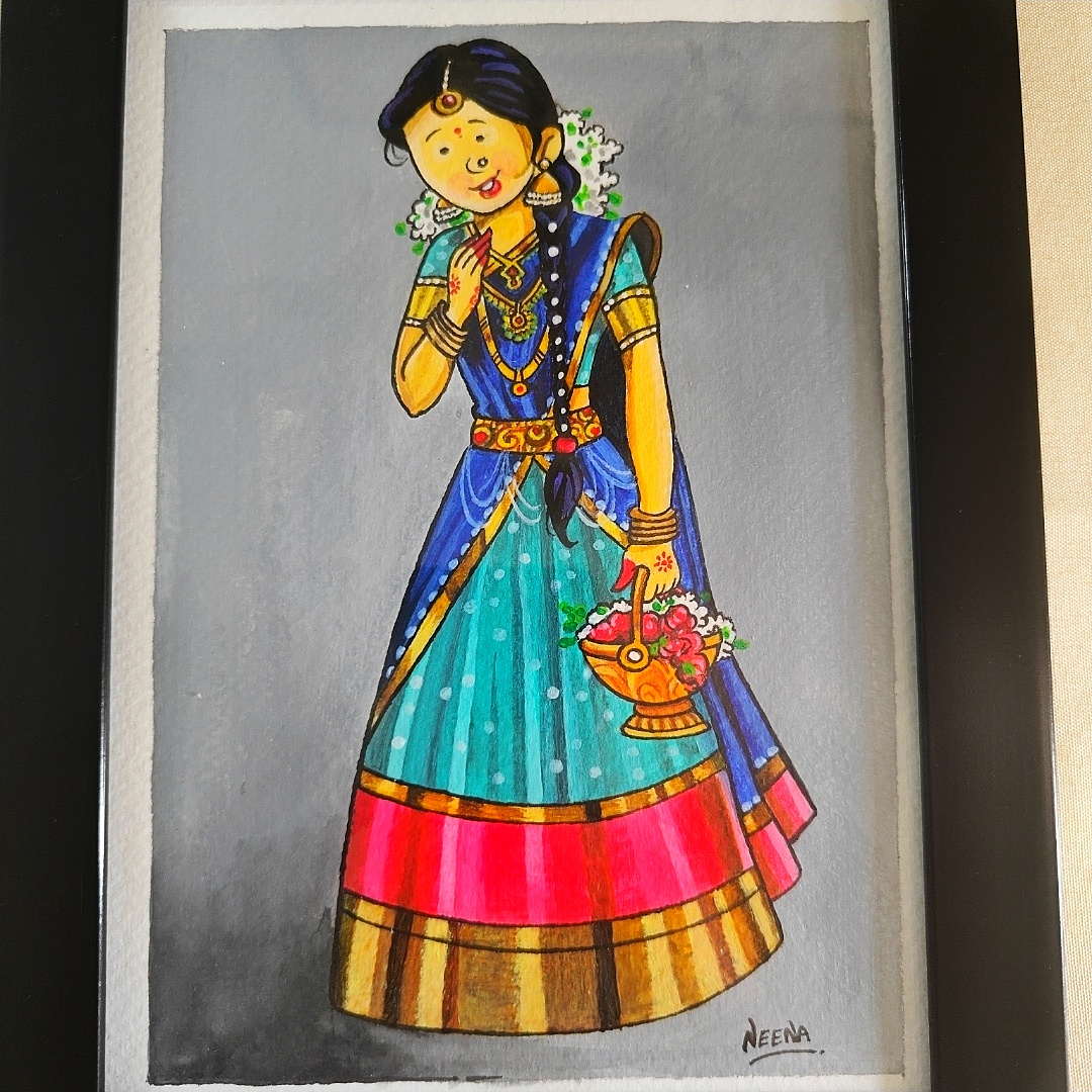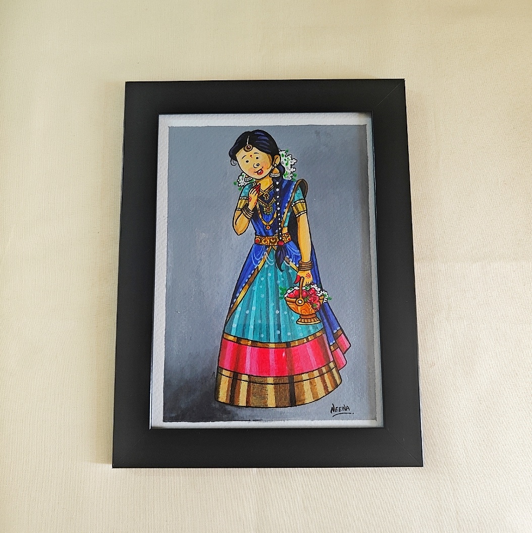 Celebrate Indian tradition and feminine grace with this captivating hand-painted artwork showcasing a beautiful woman in rich ethnic attire. From her delicately adorned saree to the pot of flowers she carries, every detail reflects the timeless charm and cultural elegance of Indian womanhood. A perfect addition to your home, studio, or as a heartfelt gift celebrating heritage and tradition.