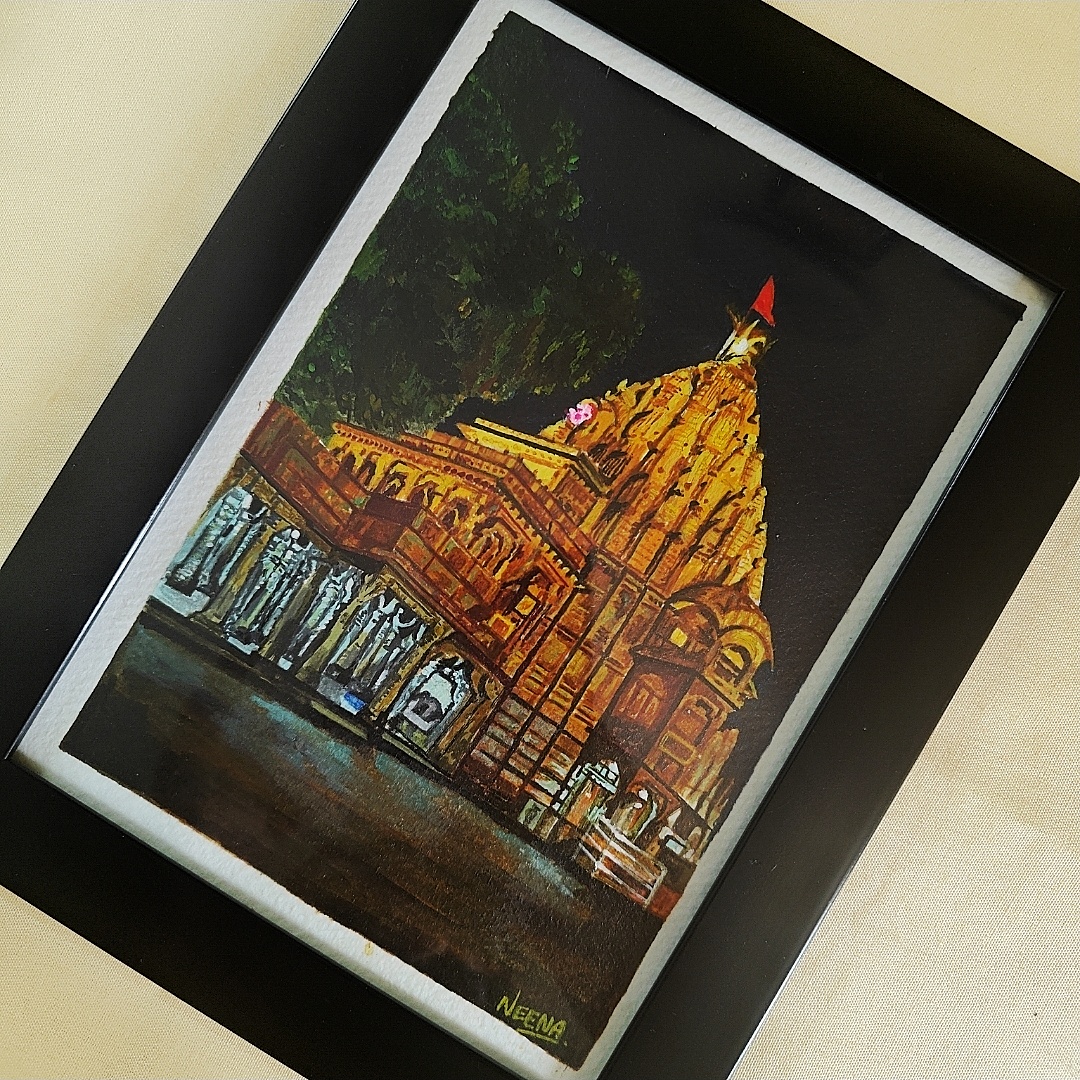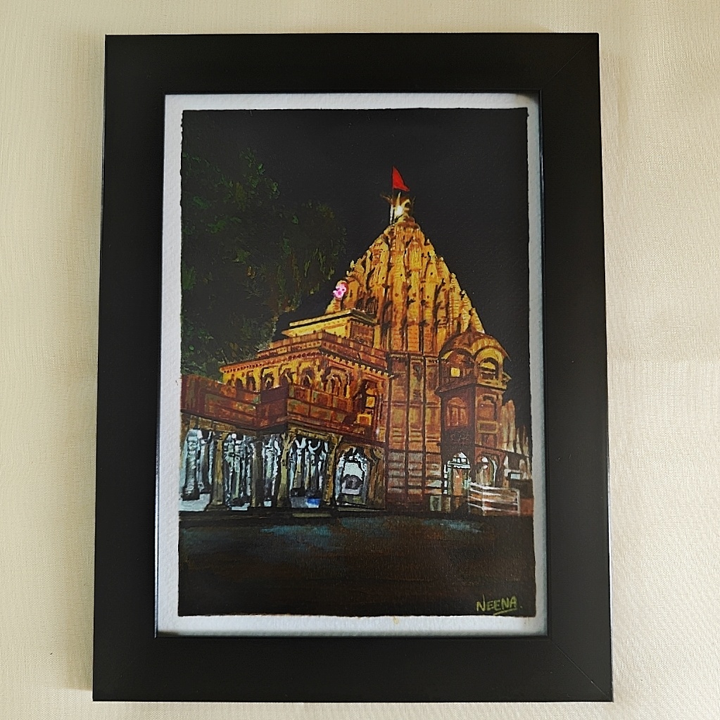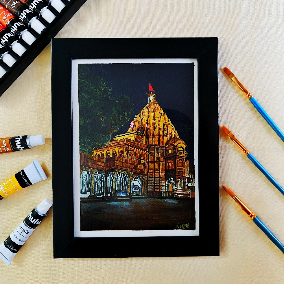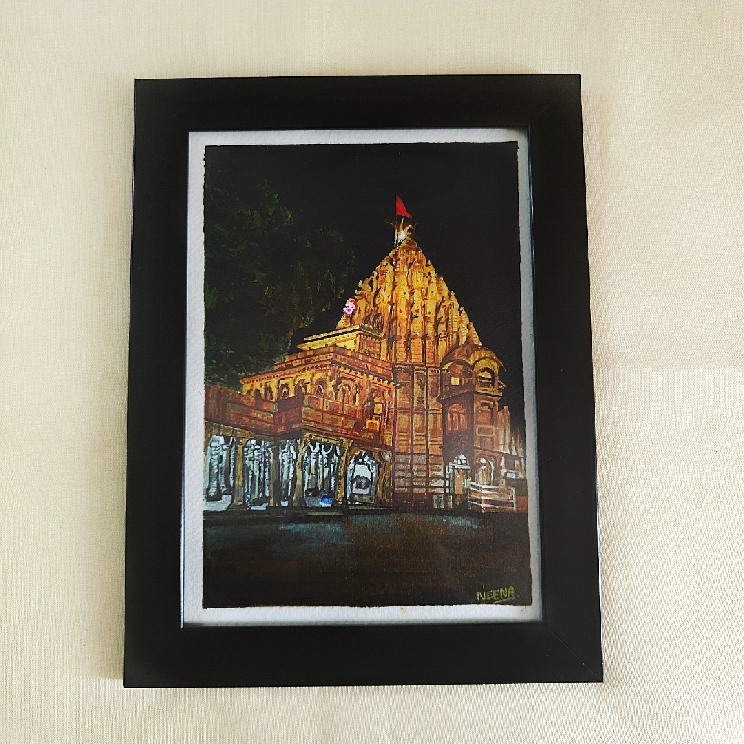 The artwork beautifully portrays the temple’s façade glowing under night light, emphasizing every arch, dome, and sacred sculpture with lifelike accuracy.
