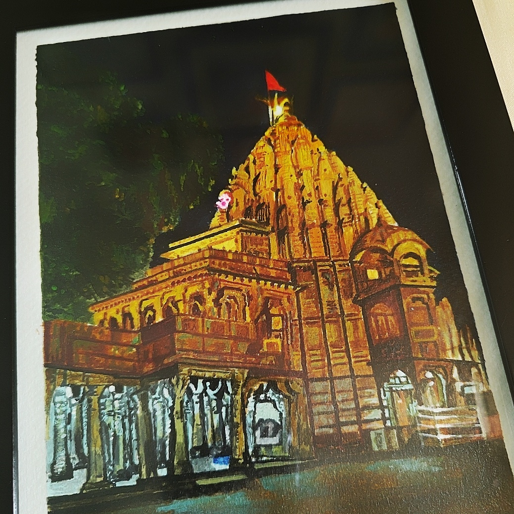 Celebrate one of India’s most revered Jyotirlingas with this stunning hand-painted depiction of the Mahakaleshwar Temple in Ujjain. Rich in detail and bathed in golden hues, this acrylic artwork captures the spiritual magnificence and architectural beauty of the temple during evening hours. Whether placed in your prayer room, hallway, or living space, it channels the divine energy of Lord Shiva’s timeless presence.