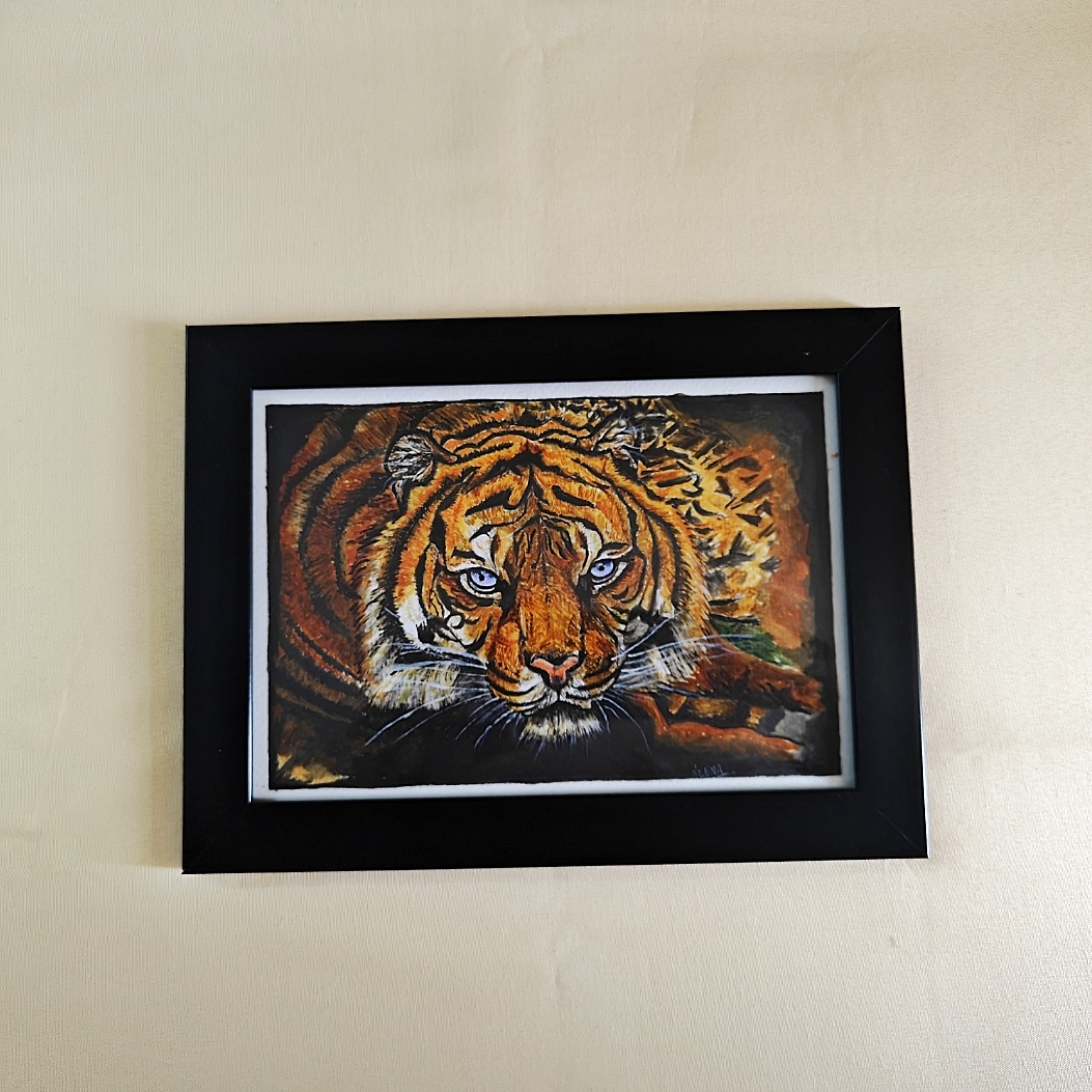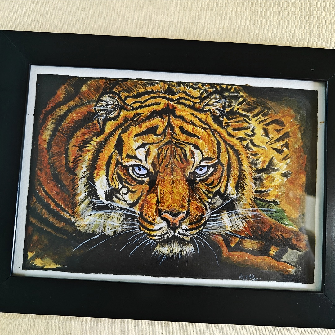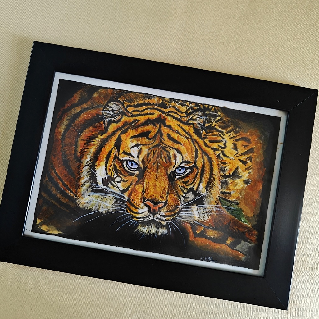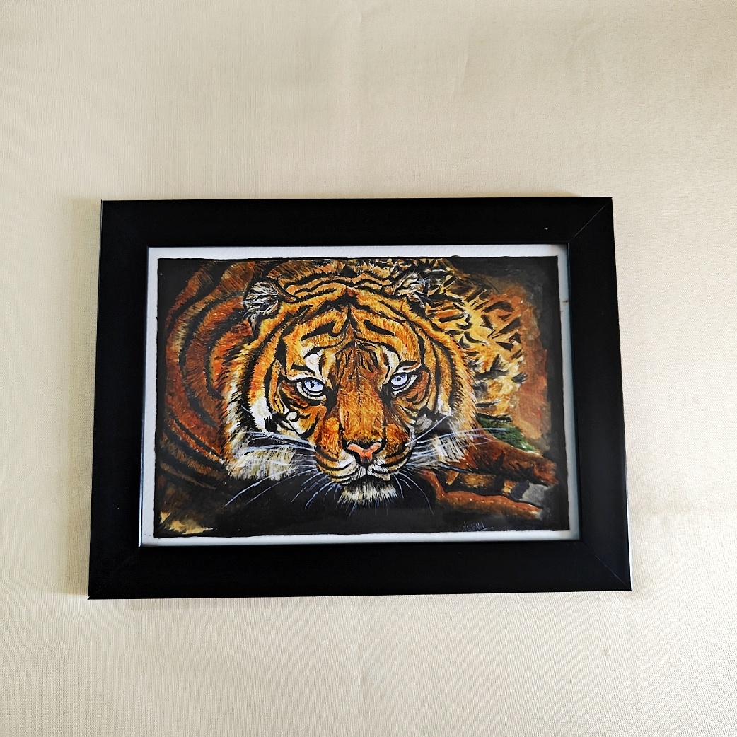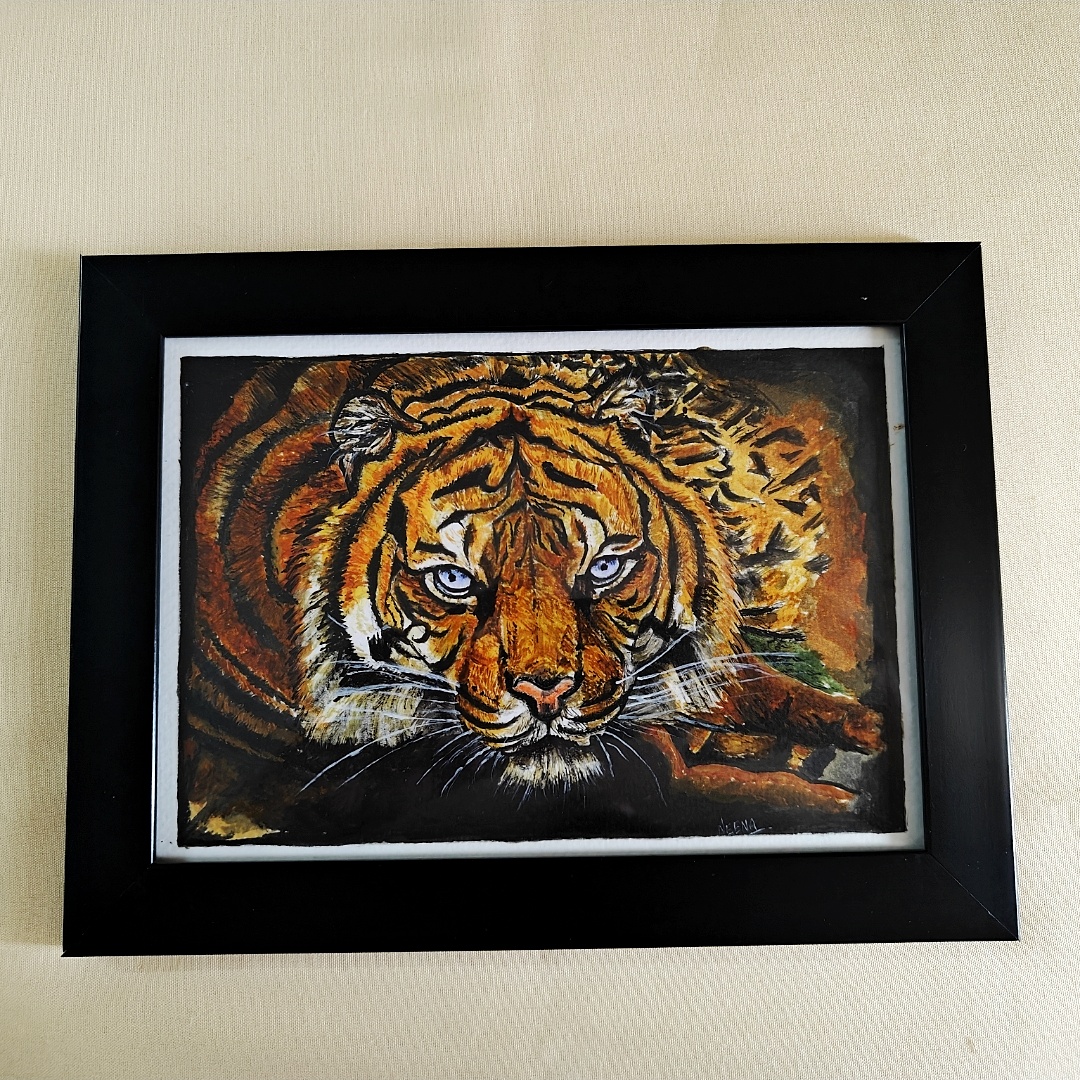 Step into the intense gaze of the wild with this striking acrylic artwork that captures the raw power and piercing beauty of a tiger. With icy blue eyes that seem to lock into your soul, this majestic predator lies poised in its natural grandeur—calm yet commanding. Every stripe and stroke has been rendered with acute realism, bringing out the intricate patterns of its fur and the sheer dominance of its presence. The backdrop of burnt sienna and earthy tones adds a jungle mystique, letting the tiger’s golden-orange coat shine through with dramatic contrast. This framed piece is not just a painting—it’s an experience of eye contact with nature’s most regal beast. Ideal for bold interiors, wildlife lovers, and those who admire strength, clarity, and unspoken power, this artwork becomes a centerpiece that speaks louder than words. Let this tiger guard your space with dignity, stillness, and silent strength.