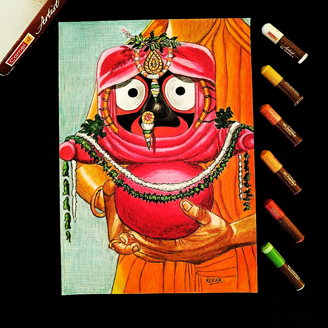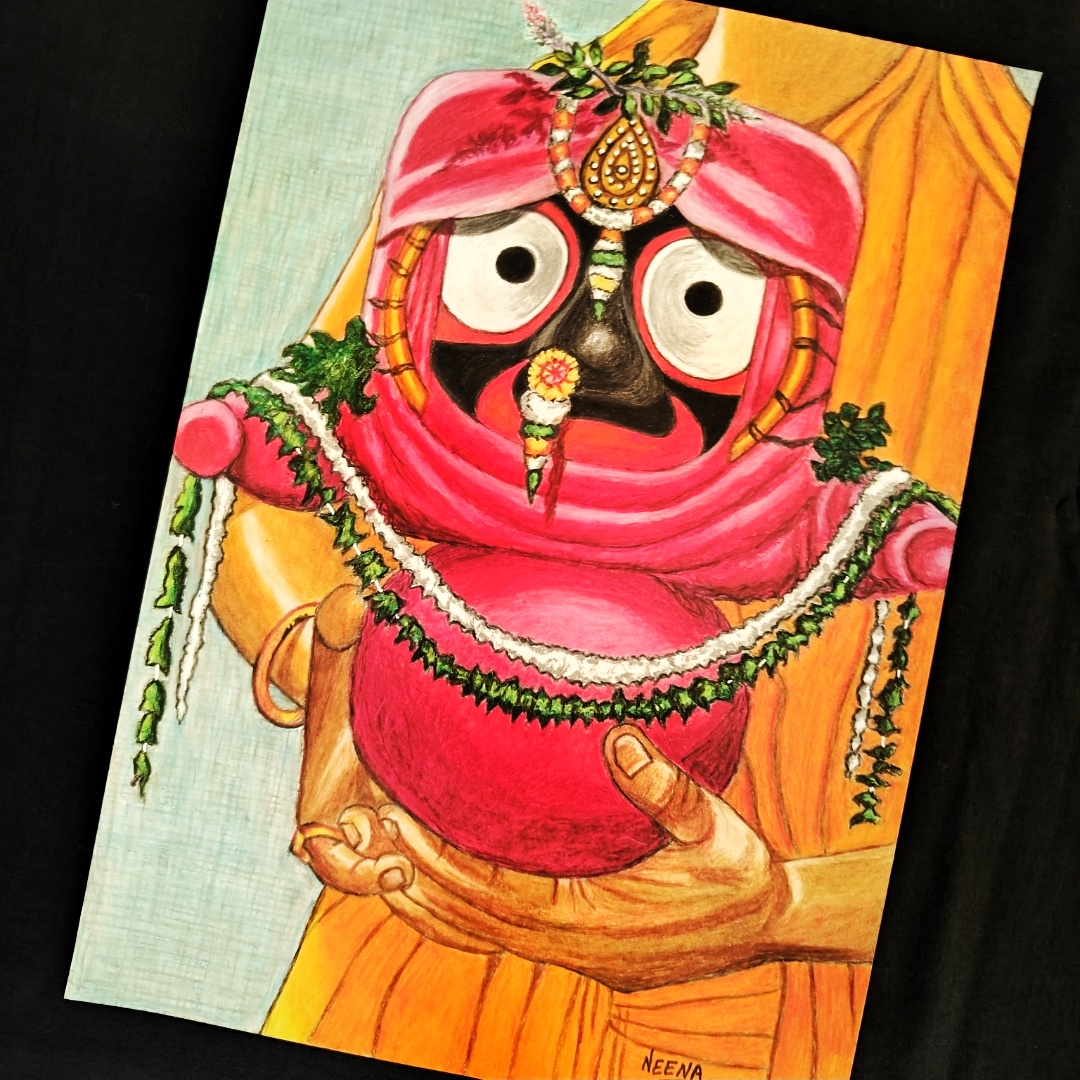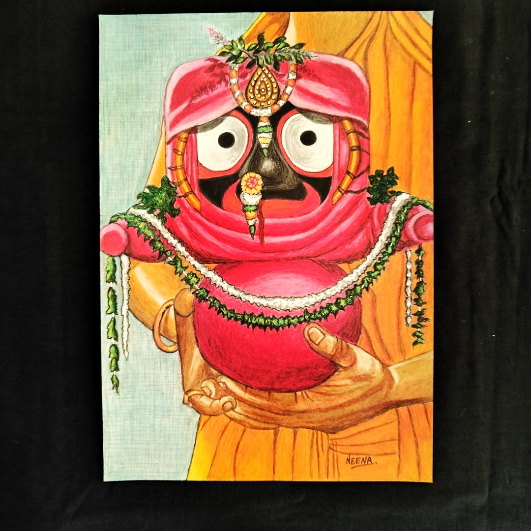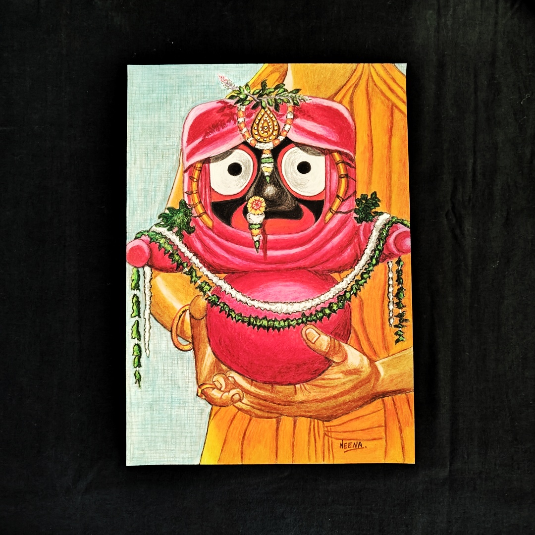 A Divine Embrace – Elegant Handmade Artwork of Lord Jagannath in Vibrant Attire carried with Love (A4 Size)