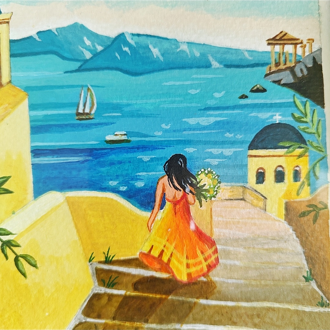 Transport yourself to the sun-kissed shores of the Mediterranean with this vibrant acrylic painting. Featuring a serene coastal scene, a graceful lady in a flowing dress, and bright architecture bathed in golden light, this artwork captures the timeless charm of seaside getaways and slow, meaningful moments.