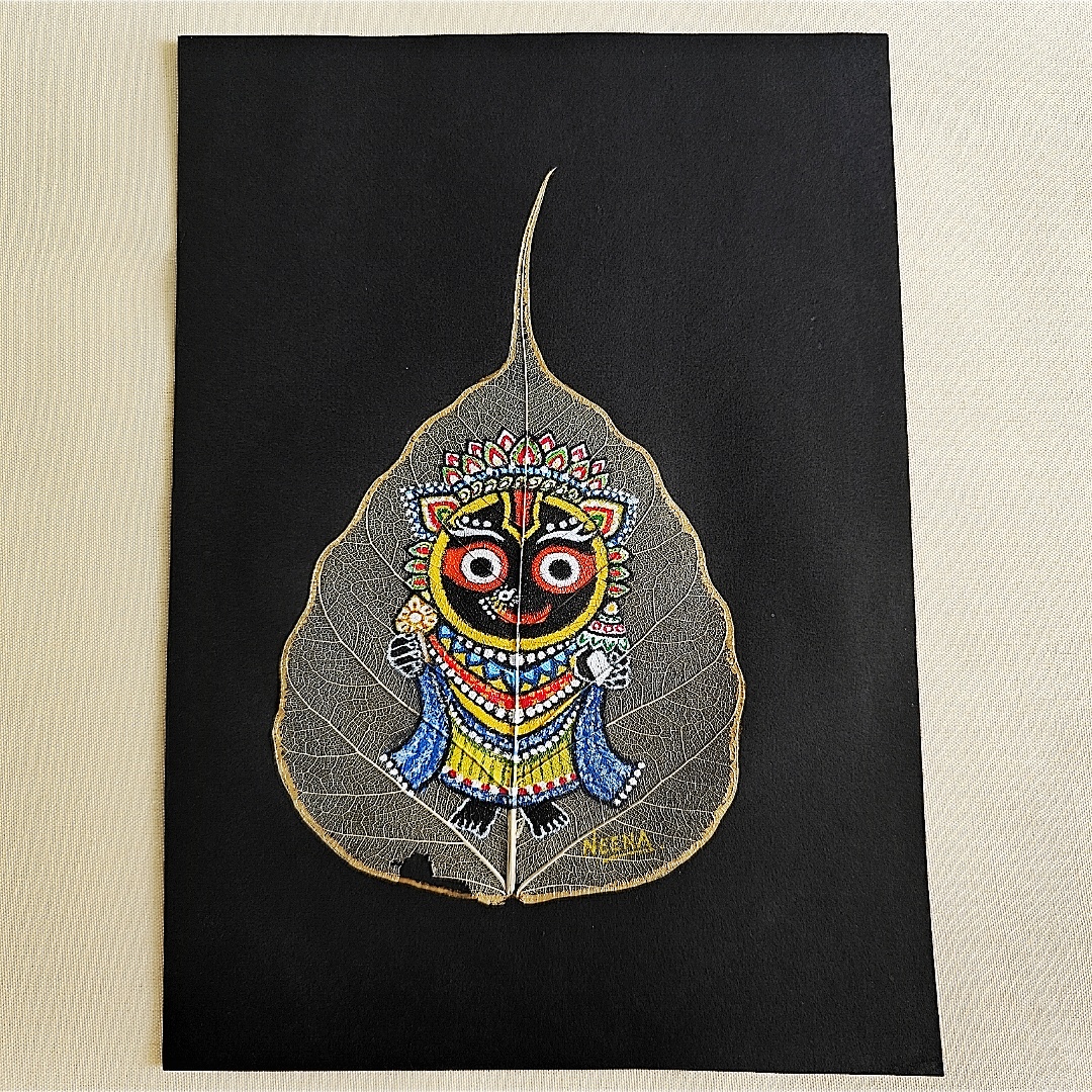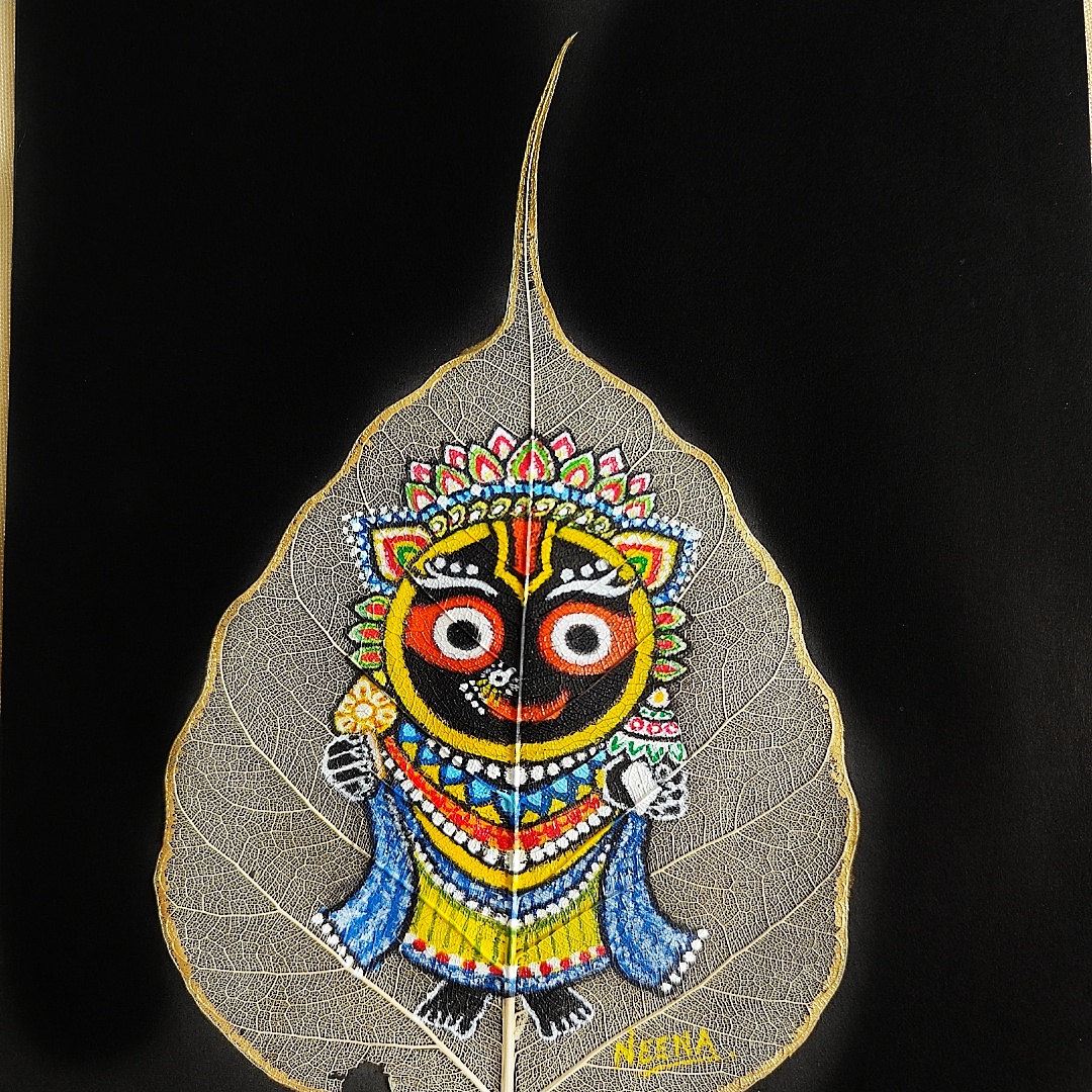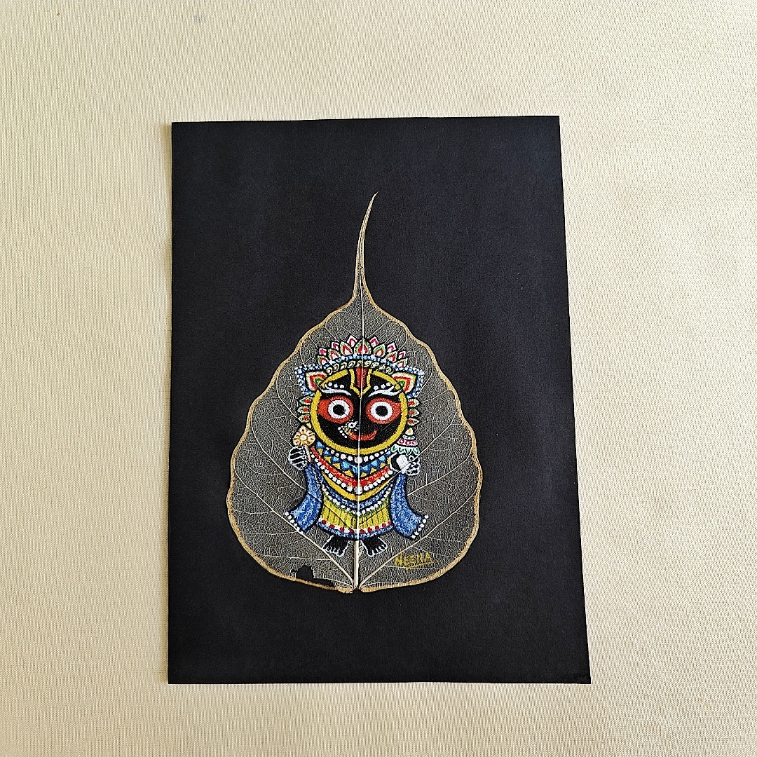 Bring home the sacred charm of Lord Jagannath with this intricate hand-painted artwork created on a natural peepal skeleton leaf. Known as the Lord of the Universe, Jagannath Ji is a powerful symbol of divine love, inclusiveness, and cosmic unity. This vibrant acrylic painting captures the deity’s iconic round eyes and ornate headgear in a mesmerizing style, accentuated by the organic patterns of the leaf. Rooted in devotion and artistry, this piece is a unique blend of nature and spirituality. Ideal for pooja rooms, serene corners, or gifting during auspicious festivals, it carries the divine presence of the Jagannath temple of Puri into your living space.