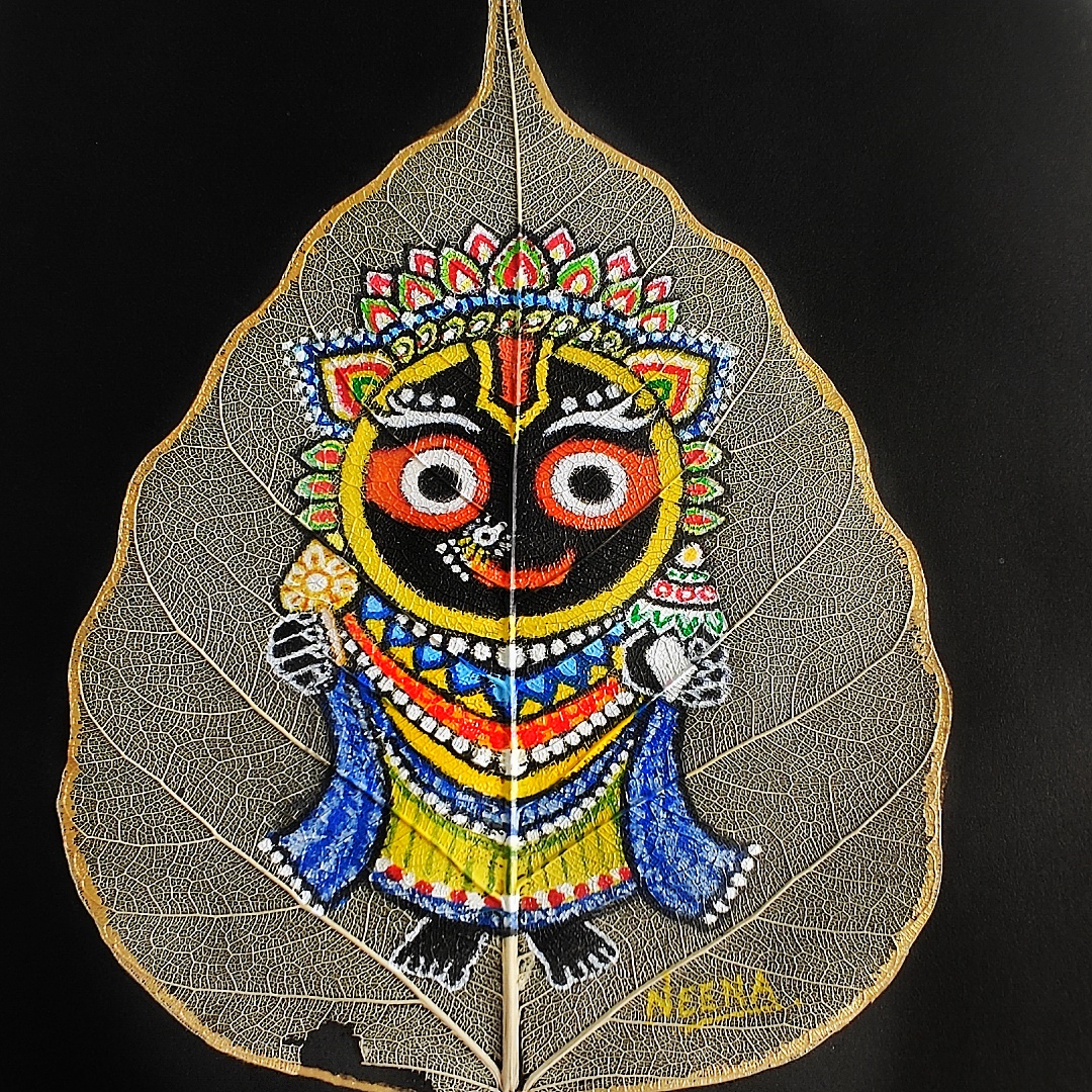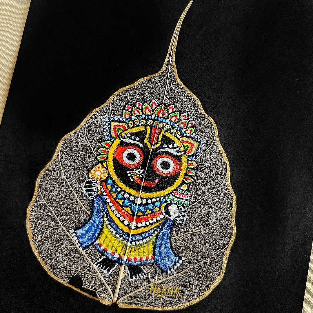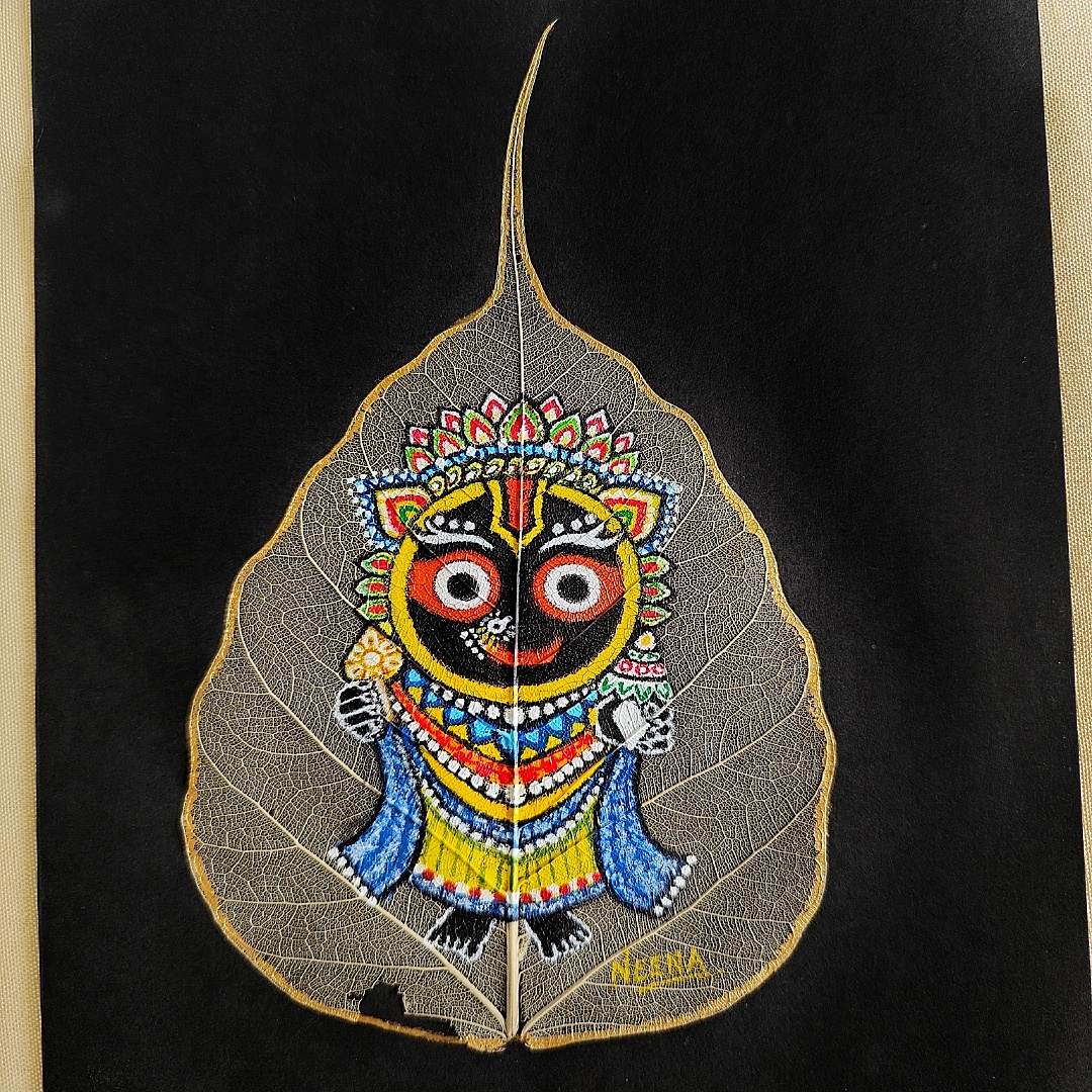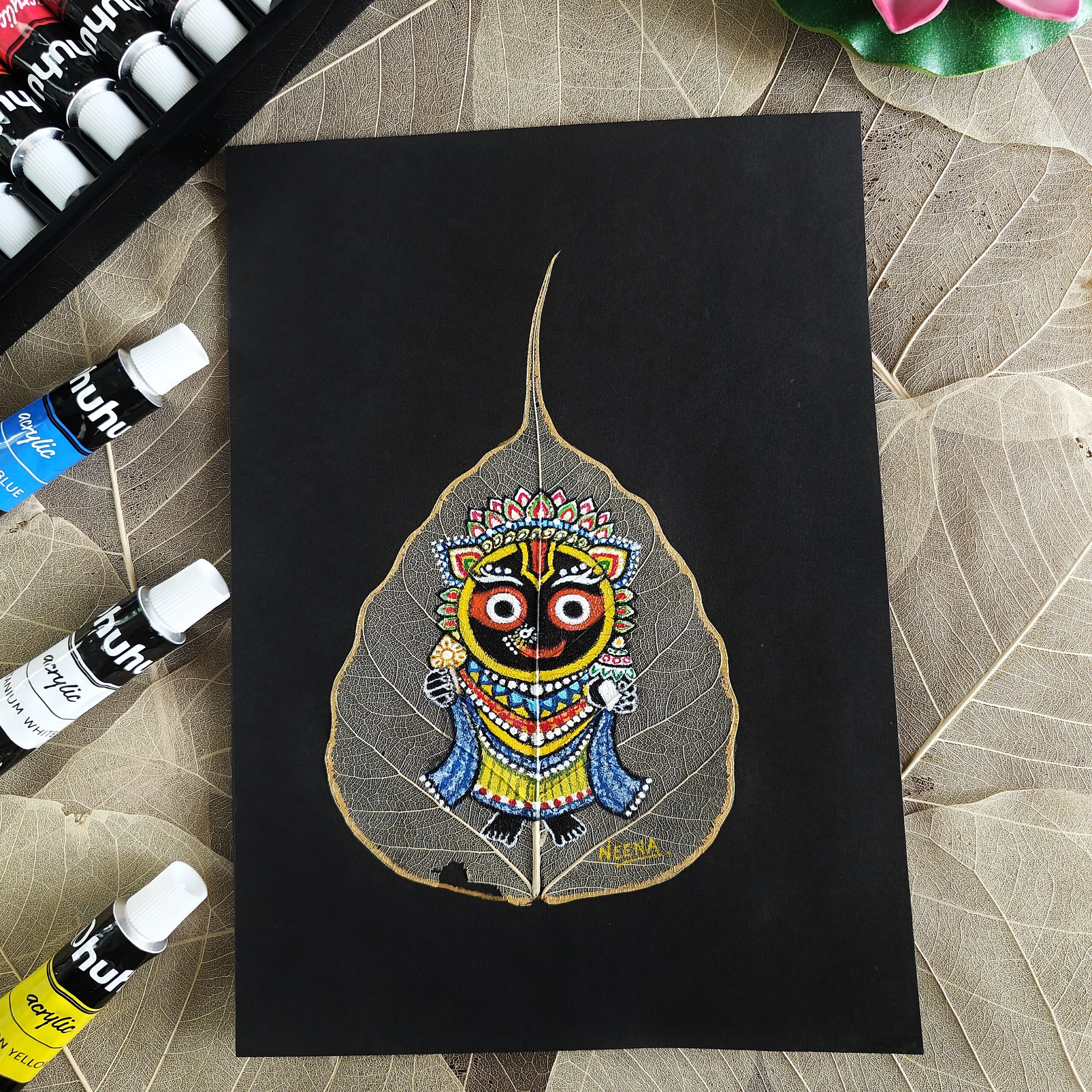 Bring home the sacred charm of Lord Jagannath with this intricate hand-painted artwork created on a natural peepal skeleton leaf. Known as the Lord of the Universe, Jagannath Ji is a powerful symbol of divine love, inclusiveness, and cosmic unity. This vibrant acrylic painting captures the deity’s iconic round eyes and ornate headgear in a mesmerizing style, accentuated by the organic patterns of the leaf. Rooted in devotion and artistry, this piece is a unique blend of nature and spirituality. Ideal for pooja rooms, serene corners, or gifting during auspicious festivals, it carries the divine presence of the Jagannath temple of Puri into your living space.