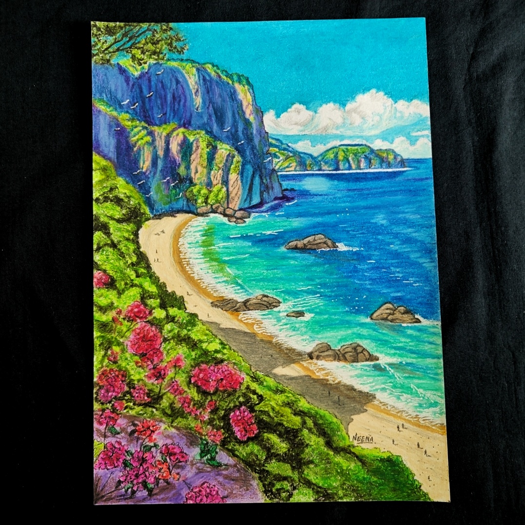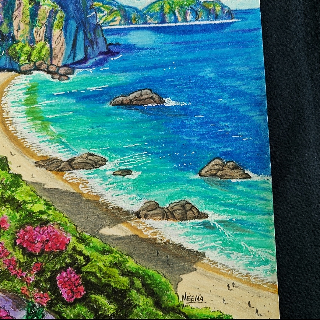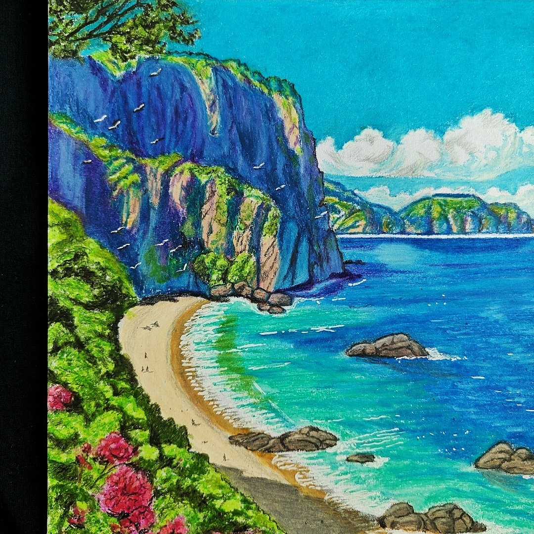 Crafted with oil pastels and colored pencils, every texture—from the delicate petals to the shimmering sea—feels alive and expressive.