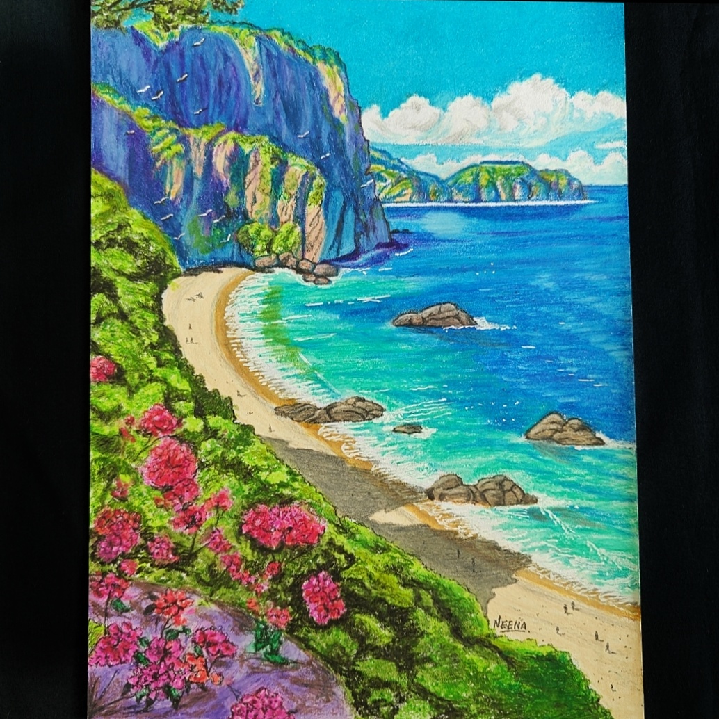 Escape into a coastal paradise with Blossoms to Waves, a breathtaking A4-sized artwork that merges the vivid beauty of seaside cliffs with a lush bloom of vibrant flowers. This hand-drawn mixed media painting captures the peaceful dance between land and sea—where magenta blossoms flourish over green hillsides and soft waves crash gently onto sandy shores. In the background, majestic cliffs rise boldly against the turquoise sea, while flocks of birds soar through the serene sky. Created with artist-grade oil pastels and color pencils, this piece brings out deep tones, layered textures, and a sense of limitless freedom. It’s a visual vacation wrapped in color—perfect for ocean lovers, nature enthusiasts, and seekers of calm.