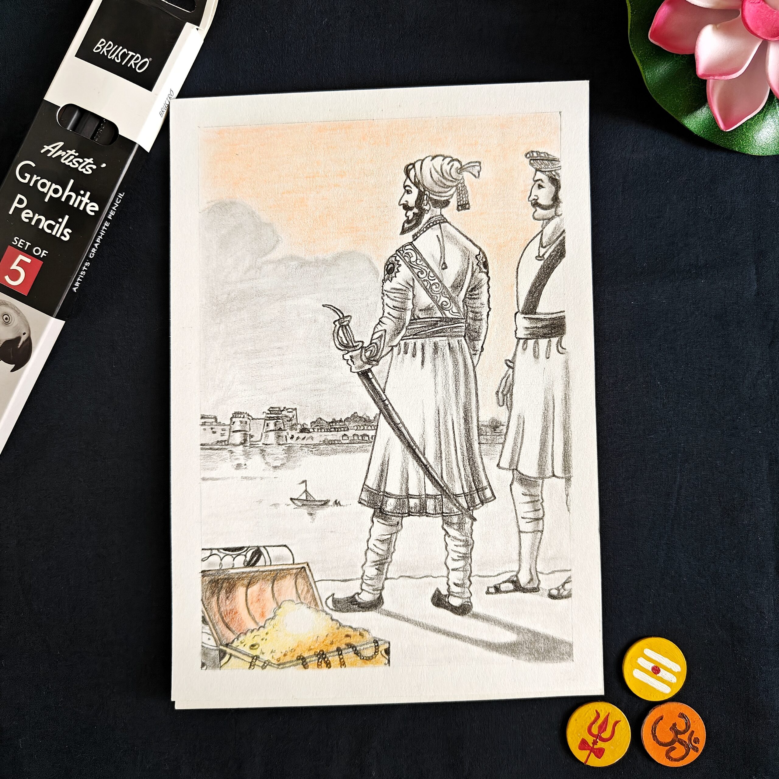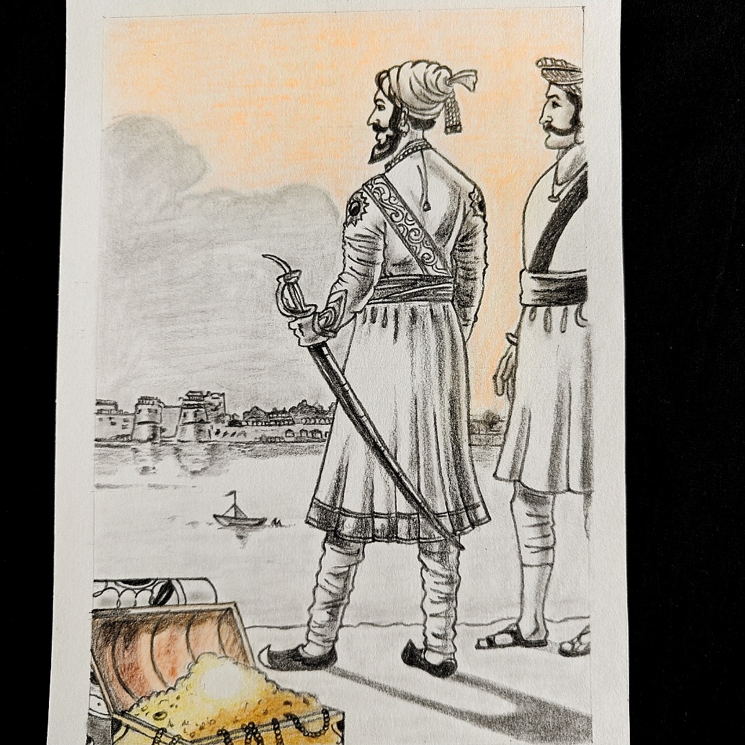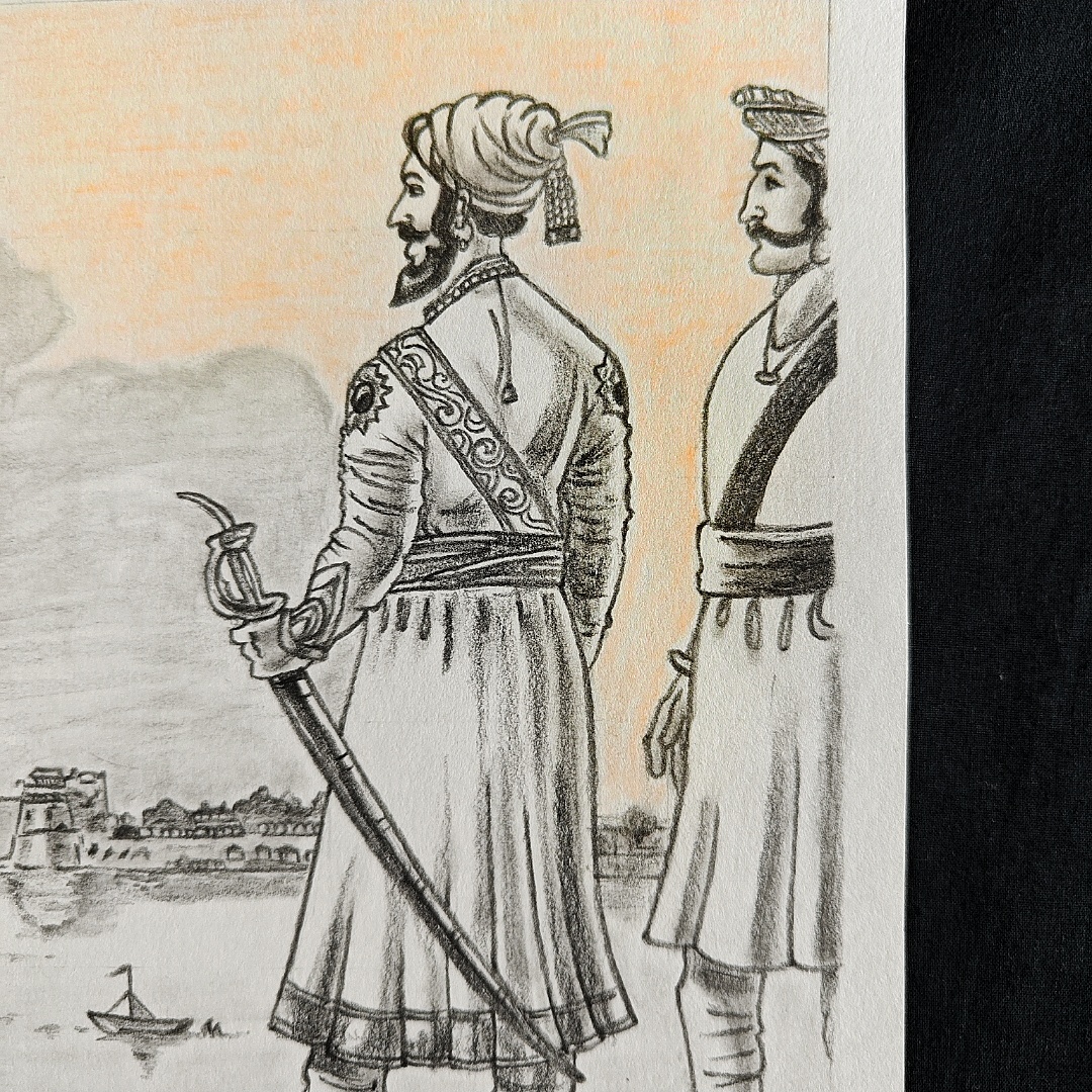 This portrait honors the Maratha king’s spirit and legacy, portraying his strategic gaze over his empire with expressive pencil shading and posture.