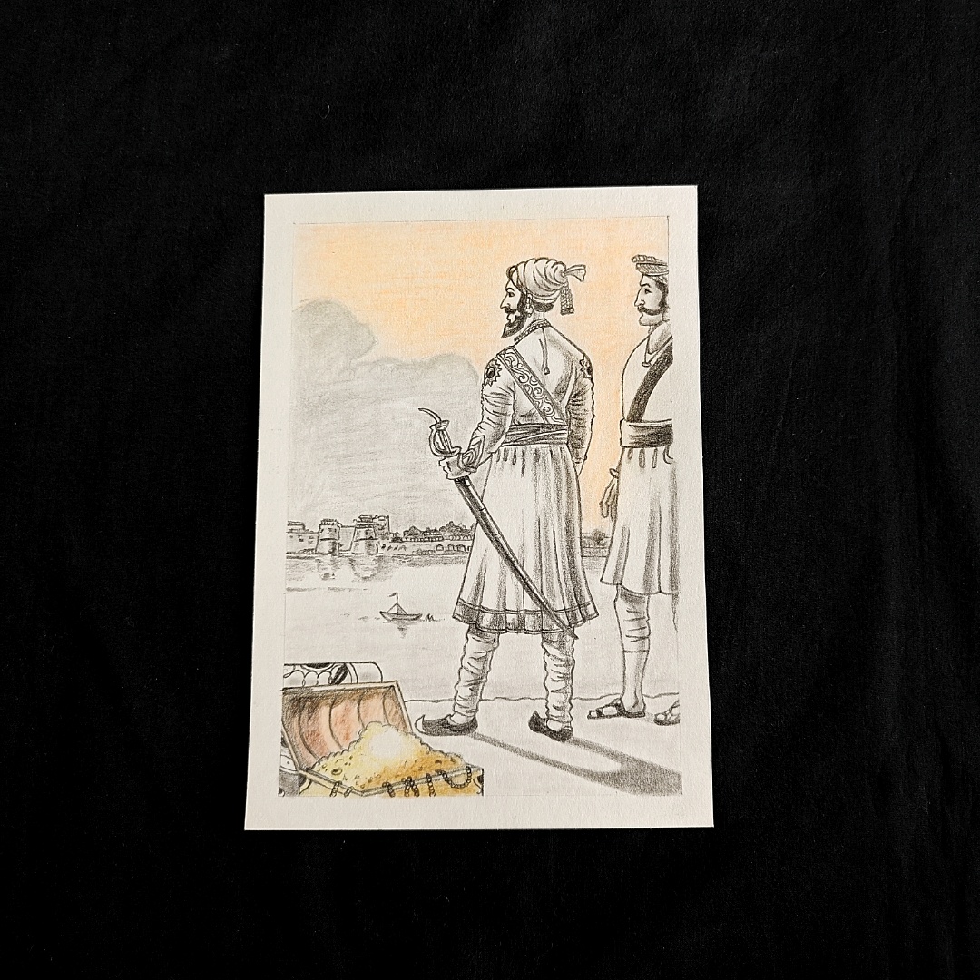 Immerse yourself in a historic moment captured through the delicate strokes of pencil and subtle hues of orange and yellow. This evocative sketch pays tribute to the legendary Maratha warrior, Chhatrapati Shivaji Maharaj, standing tall with resolute pride beside his trusted commander. Facing the sea and forts beyond, the artwork symbolizes his far-sighted vision, courage, and unbreakable commitment to Swarajya. A treasure chest in the foreground and softly colored skies elevate the narrative, making this a soulful and respectful representation of India’s glorious heritage. Compact yet commanding, this A5 artwork brings both reverence and inspiration into any space.