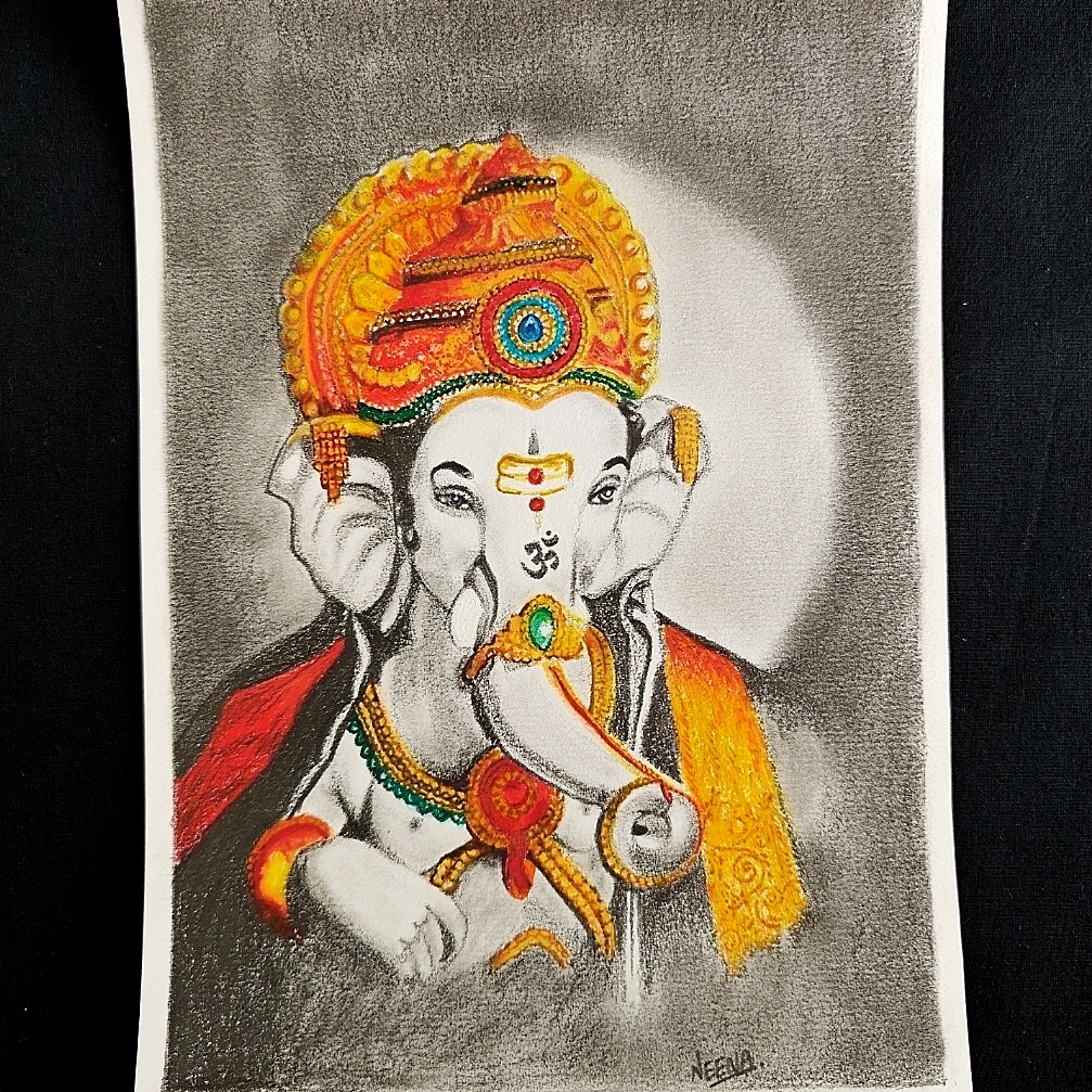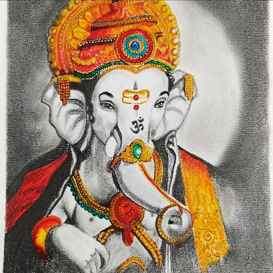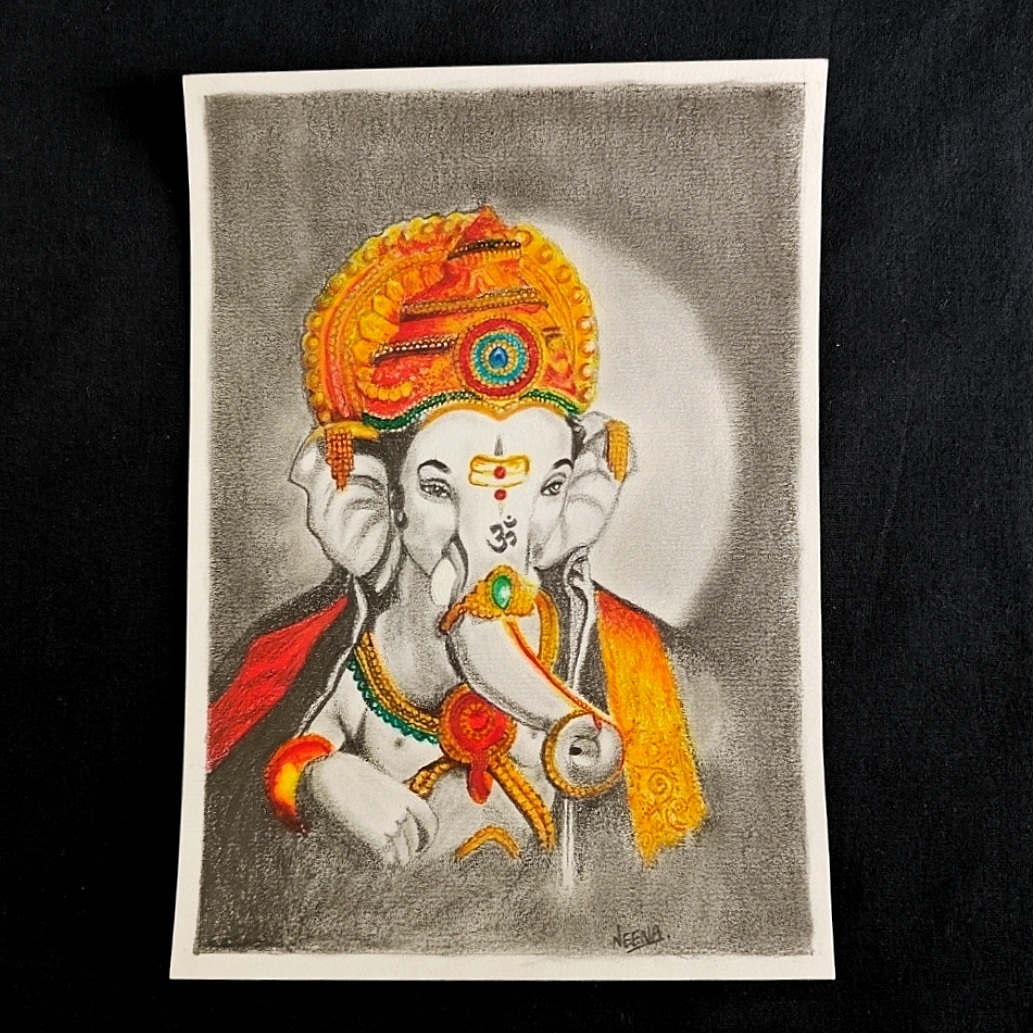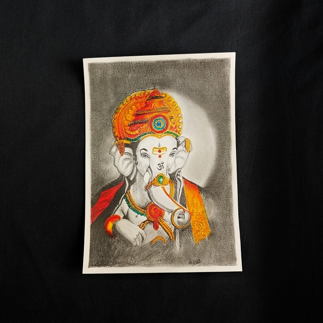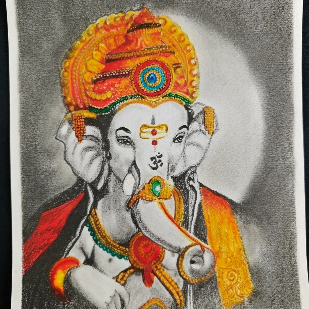 Invoke divine blessings with this exquisite Elegant Shri Ganesh Portrait, a soulful A5-sized mixed media artwork of Lord Ganpati crafted using oil pastels and pencil shading. The vibrant orange, yellow, and red hues of Bappa’s embellished crown and ornaments beautifully contrast the calm monochrome tones of his divine form. This sacred depiction radiates both serenity and strength—perfect for adorning your mandir corner, study desk, or gifting during festive occasions like Ganesh Chaturthi or housewarmings. It’s not just a painting, but a spiritual expression brought to life with color and grace.