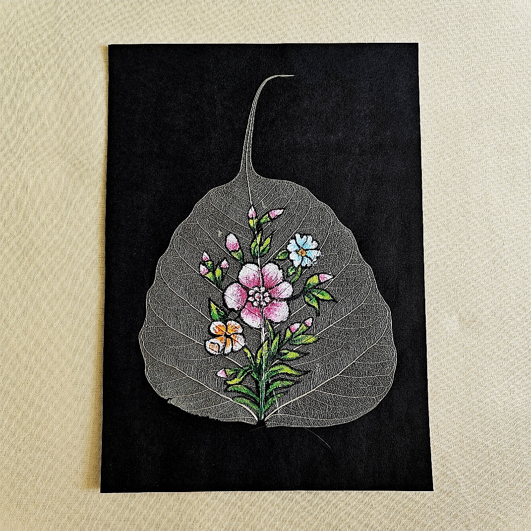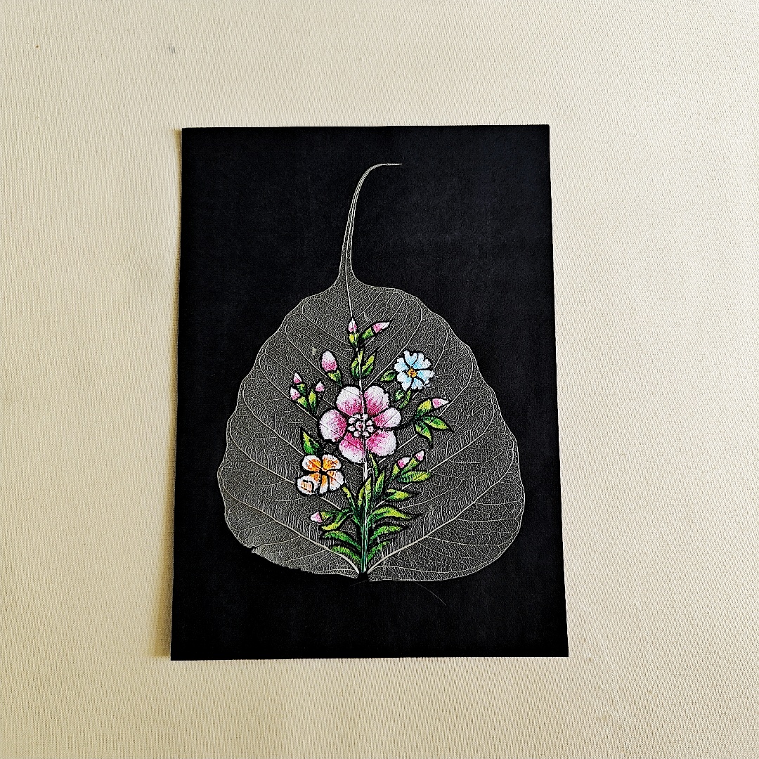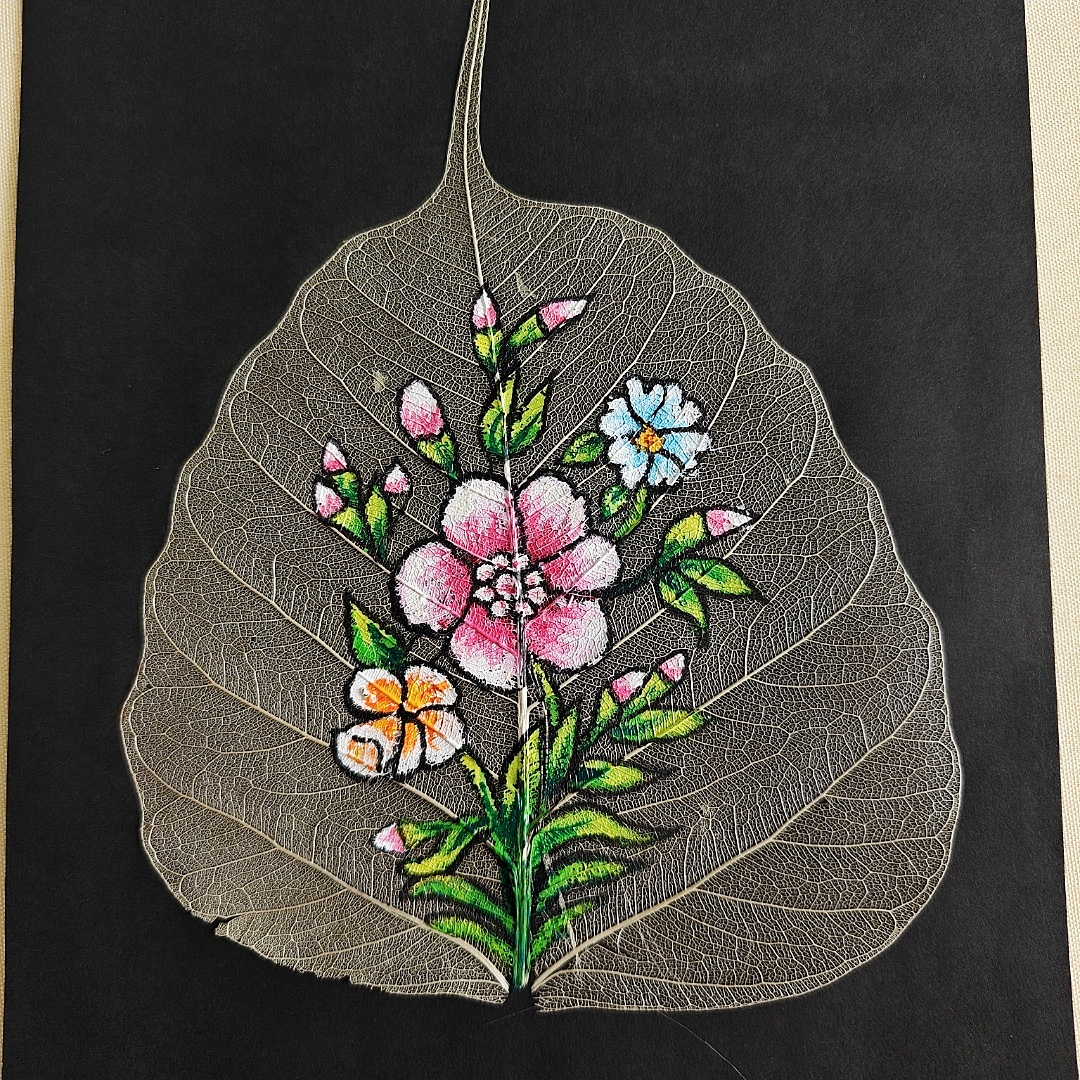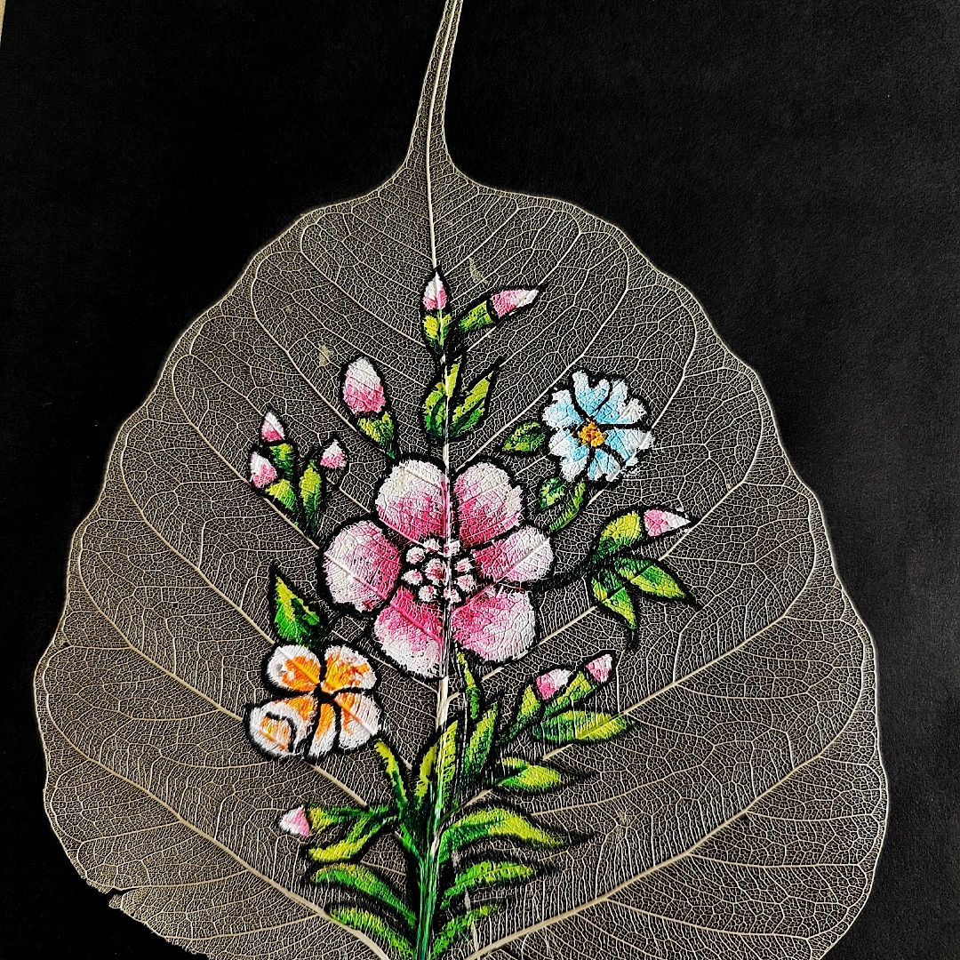 Celebrate the charm of nature with this elegant hand-painted floral bouquet on a delicate peepal skeleton leaf. Bursting with soft pinks, whites, yellows, and greens, this miniature artwork captures the joy and simplicity of blooming flowers in a serene and mindful style. The transparent veins of the natural leaf form a graceful backdrop, adding texture and authenticity to the composition. Whether you’re decorating a cozy corner, gifting someone special, or simply adding color to your desk, this piece brings freshness, vibrance, and natural elegance into any space. Perfect for nature lovers and art enthusiasts alike.