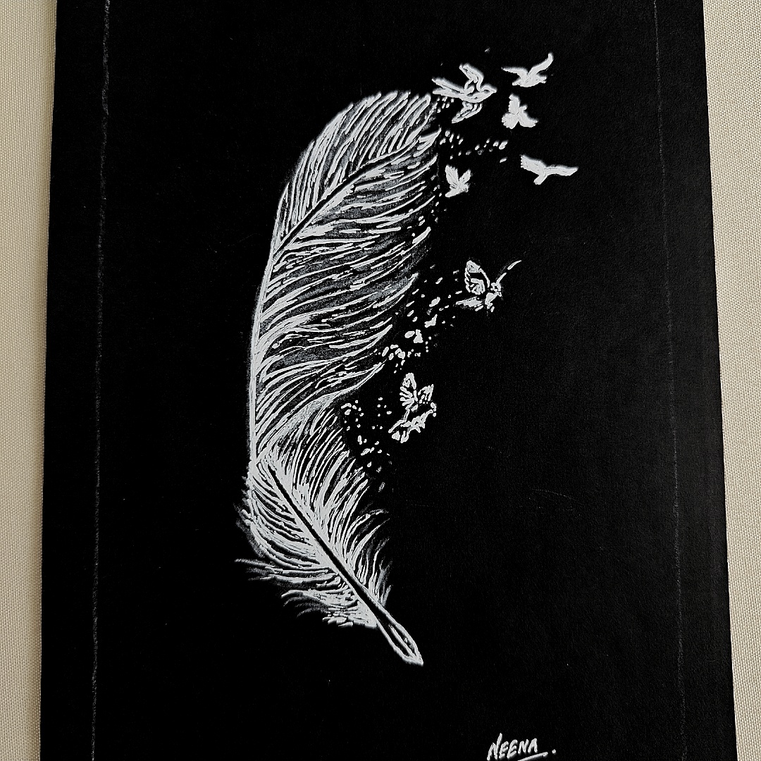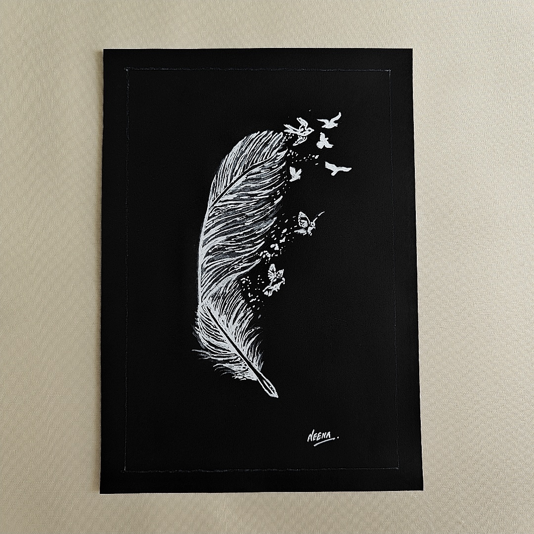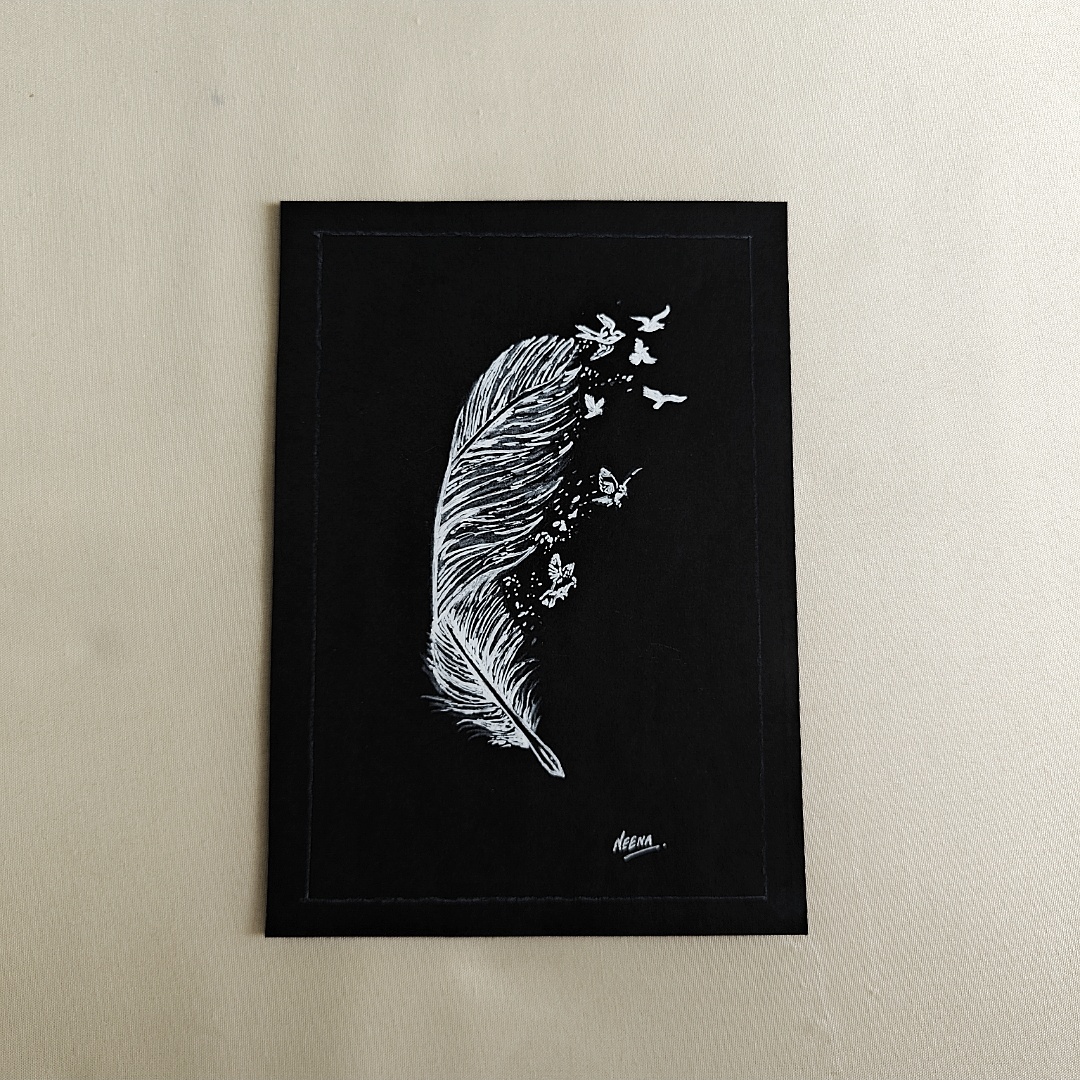 Unleash your spirit with this enchanting A5-sized black sheet artwork that poetically captures the essence of transformation and freedom. A single delicate feather unravels into a flurry of fluttering butterflies and soaring birds, symbolizing the journey of the soul from stillness to motion, from thought to liberation. Sketched in radiant white on a deep black backdrop, this minimalistic piece speaks volumes in silence—perfect for those who find meaning in the simple and profound. It’s an ideal choice for dreamers, creatives, and anyone who believes in growth, change, and the beauty of taking flight.