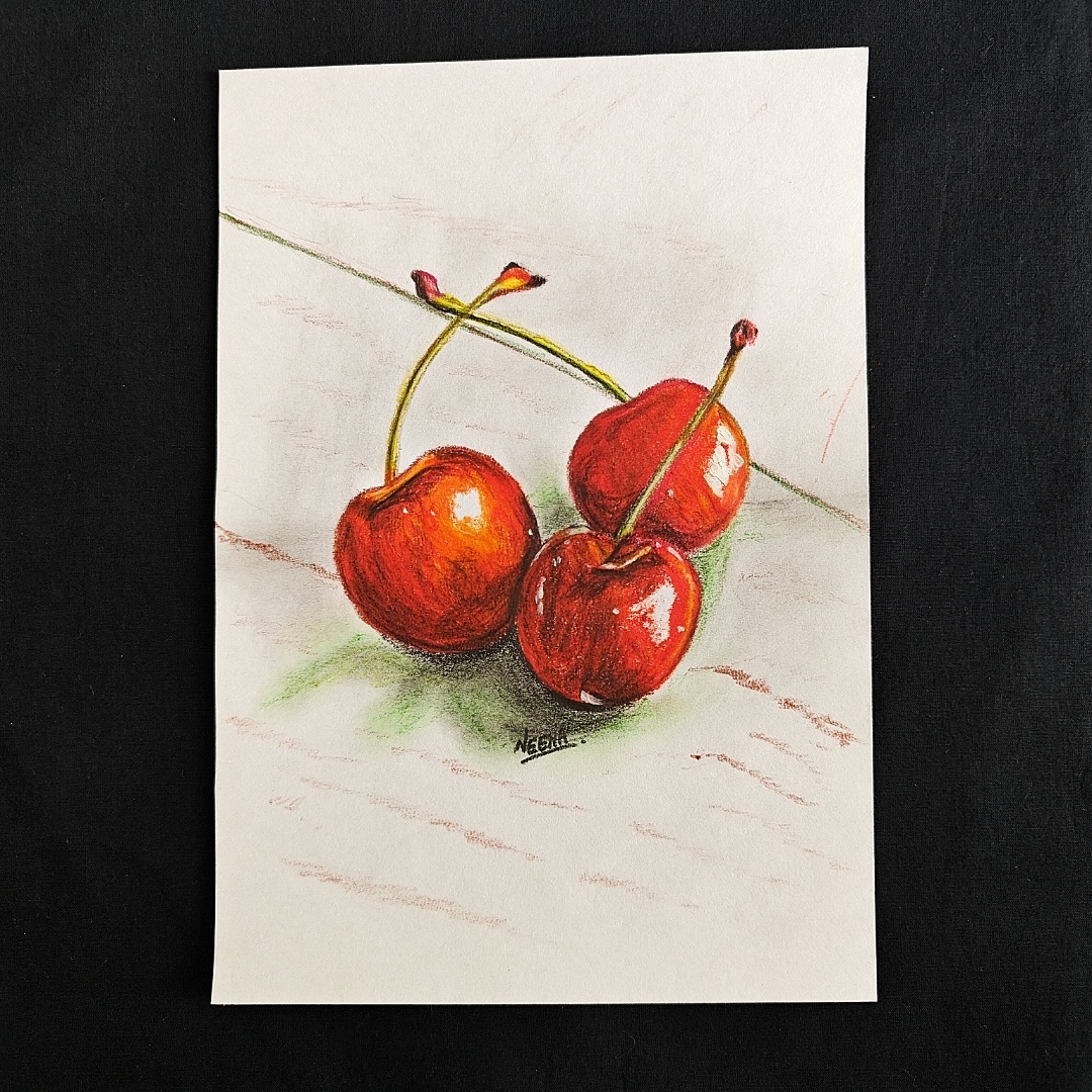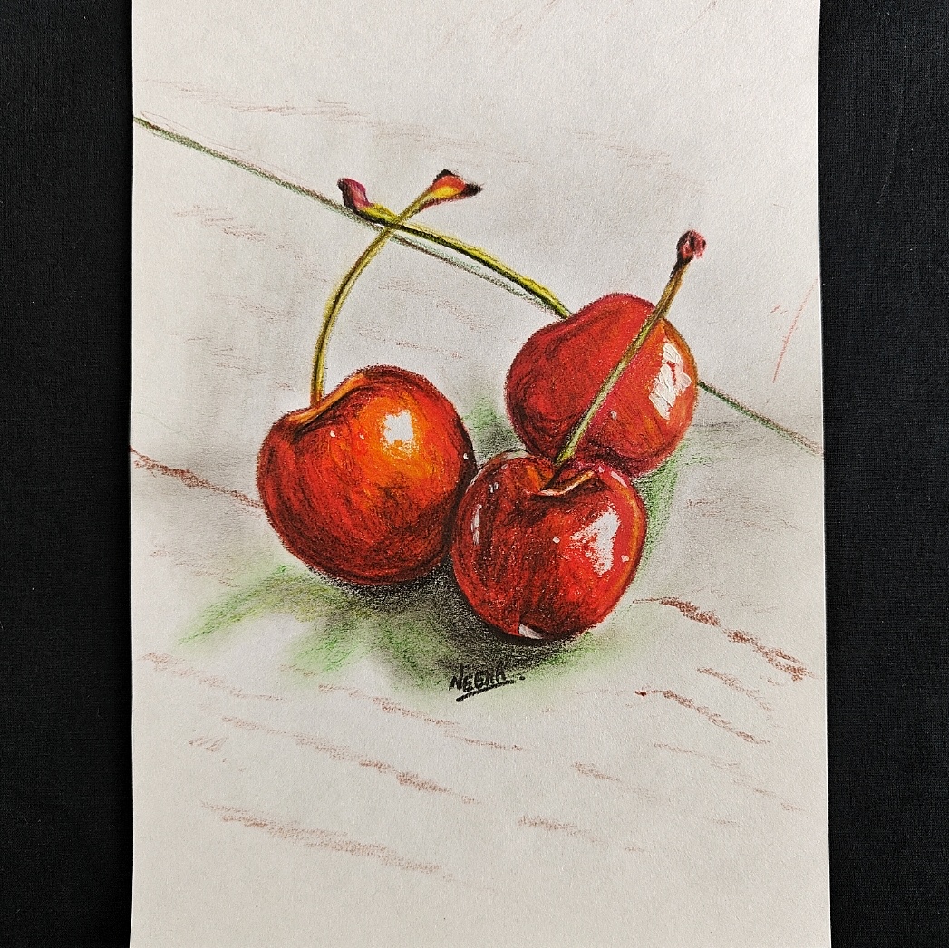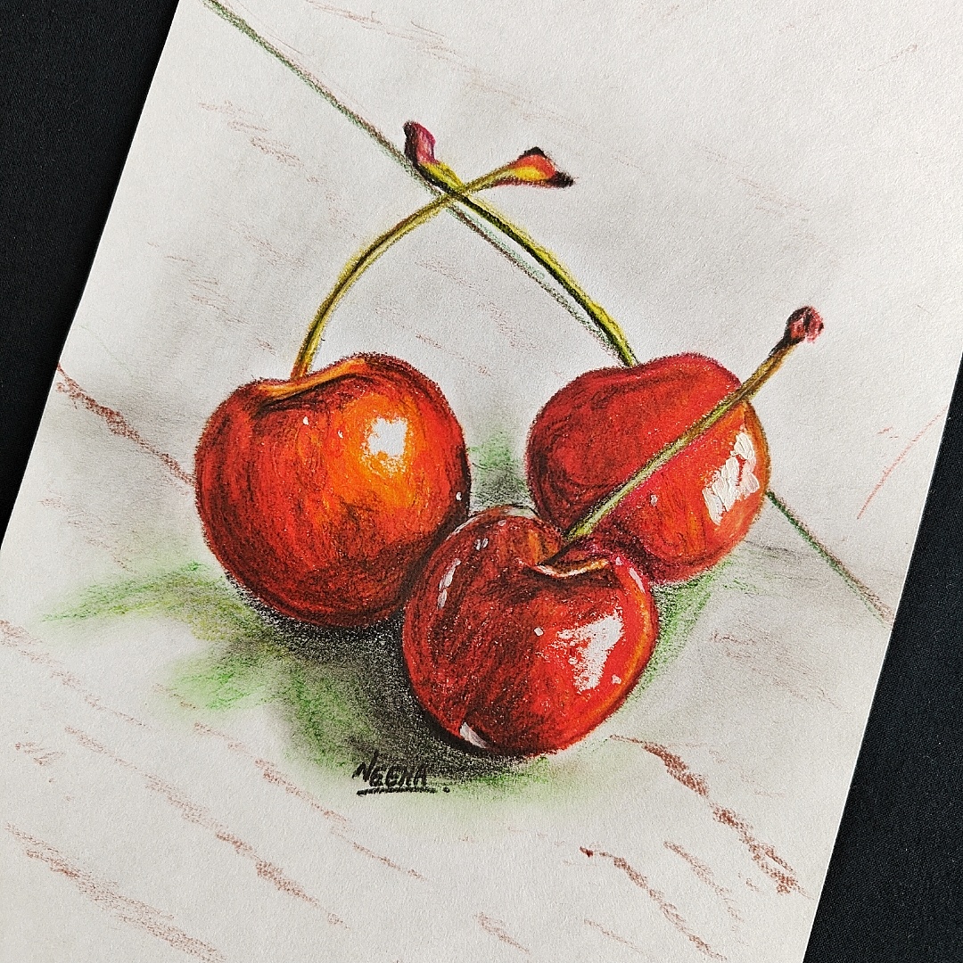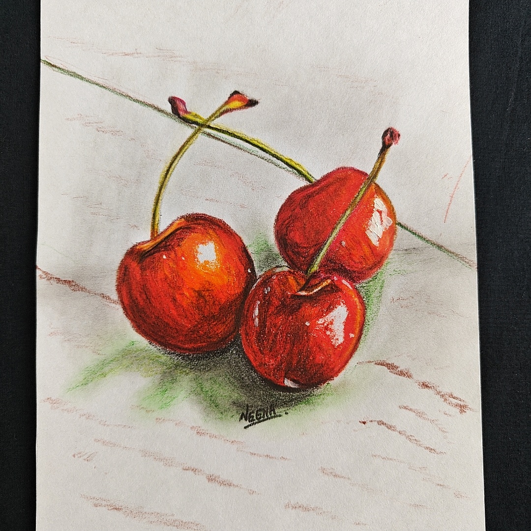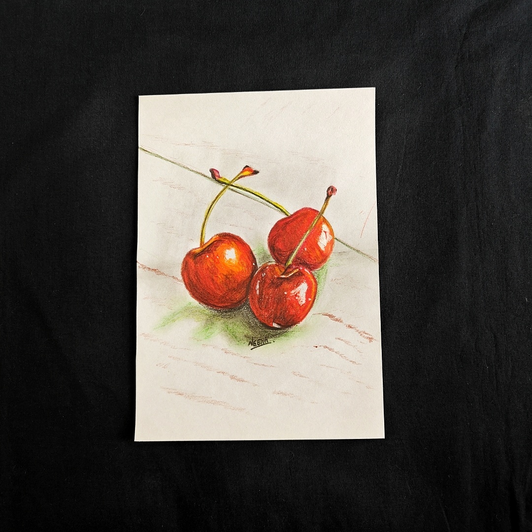 Celebrate the charm of nature’s sweetest bounty with Fruitful Beauty, a hyper-realistic A5 artwork that brings vibrant cherries to life on paper. Crafted meticulously with oil pastels and colored pencils, the glistening surface of the cherries, the interplay of light and shadow, and the delicate stems capture a juicy ripeness that feels almost touchable. The minimal white background ensures the trio of cherries takes center stage, making this piece a delightful accent for kitchen corners, cafes, or fruit-themed gallery walls.