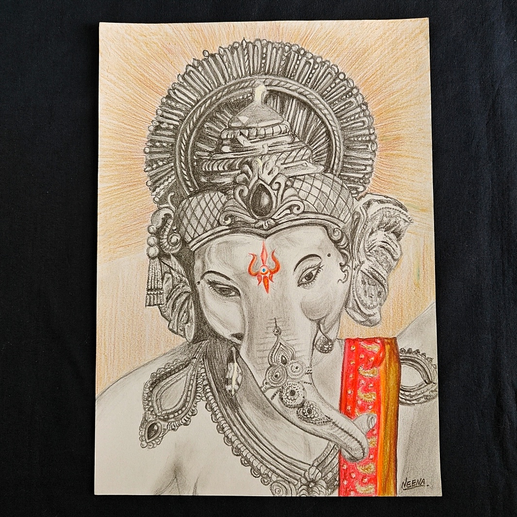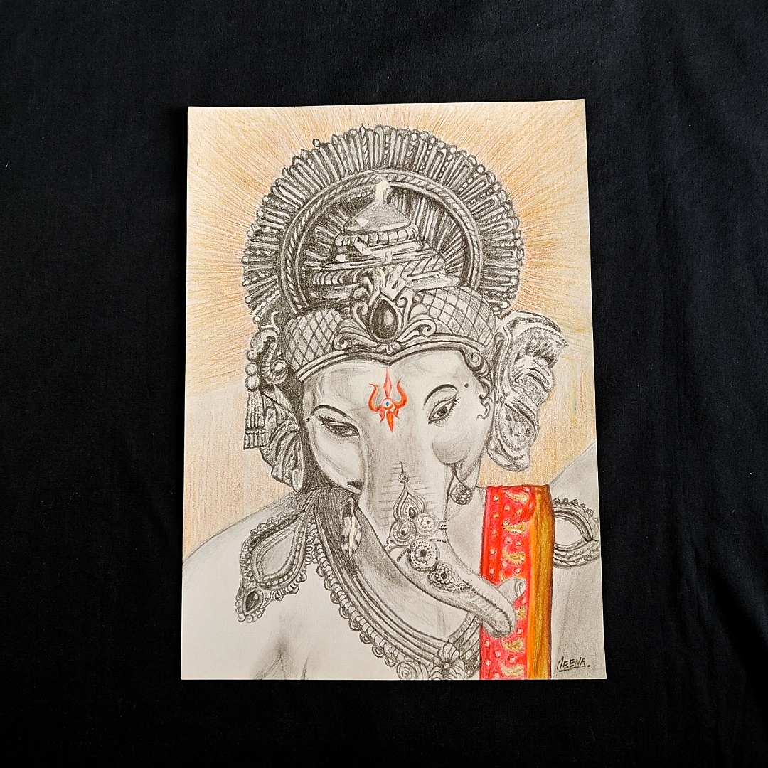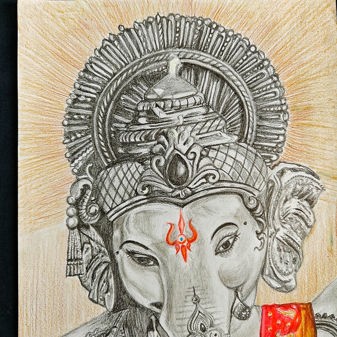 From Ganesha’s divine eyes to His regal headgear, every element is drawn with spiritual significance, capturing the essence of Indian tradition and devotion.