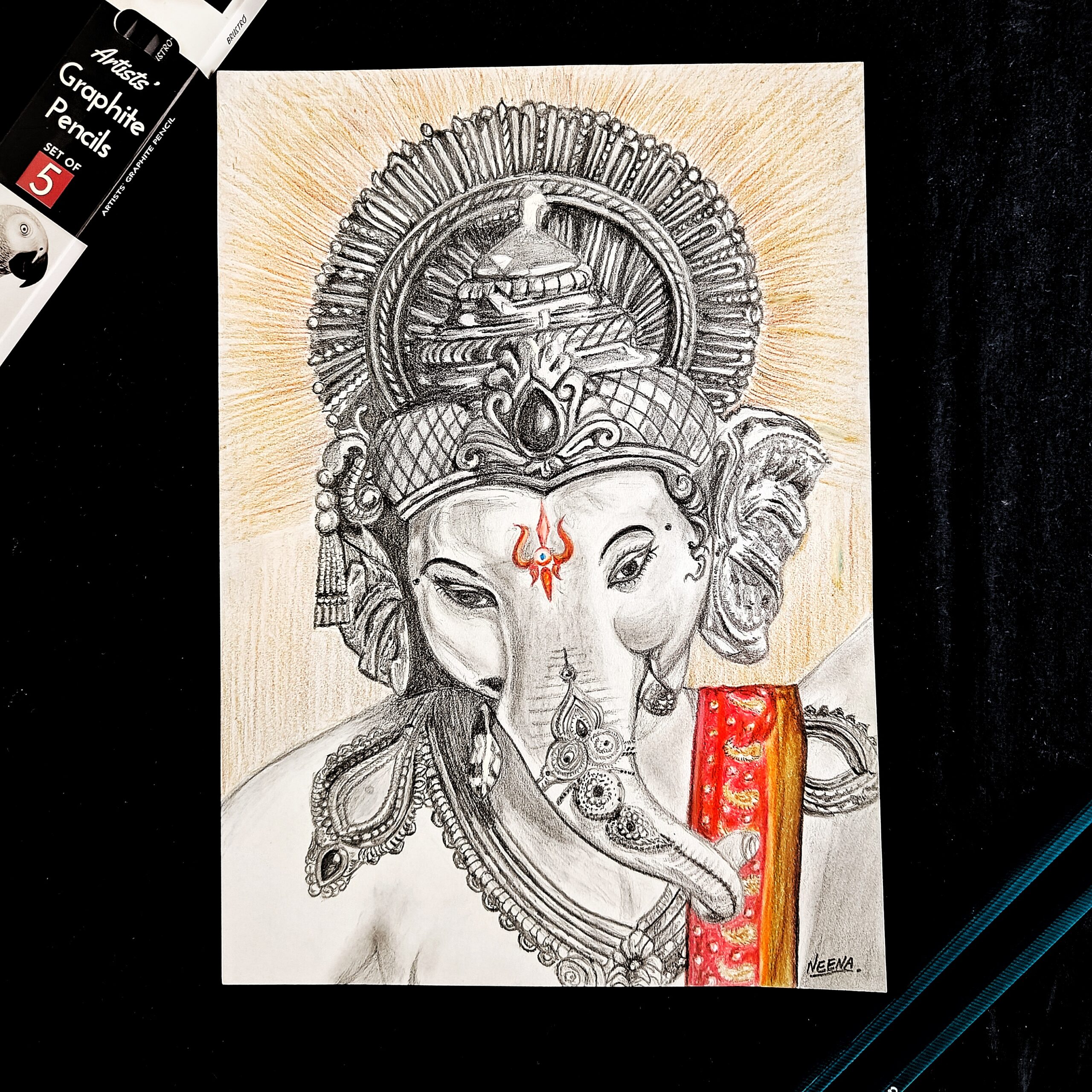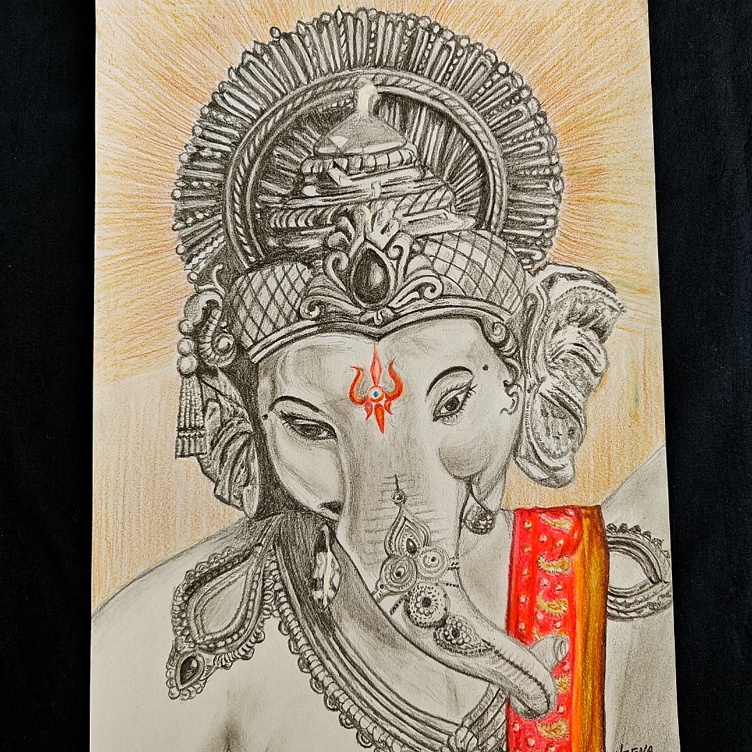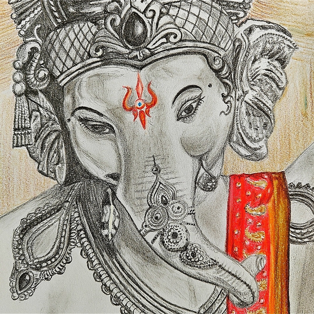 From Ganesha’s divine eyes to His regal headgear, every element is drawn with spiritual significance, capturing the essence of Indian tradition and devotion.