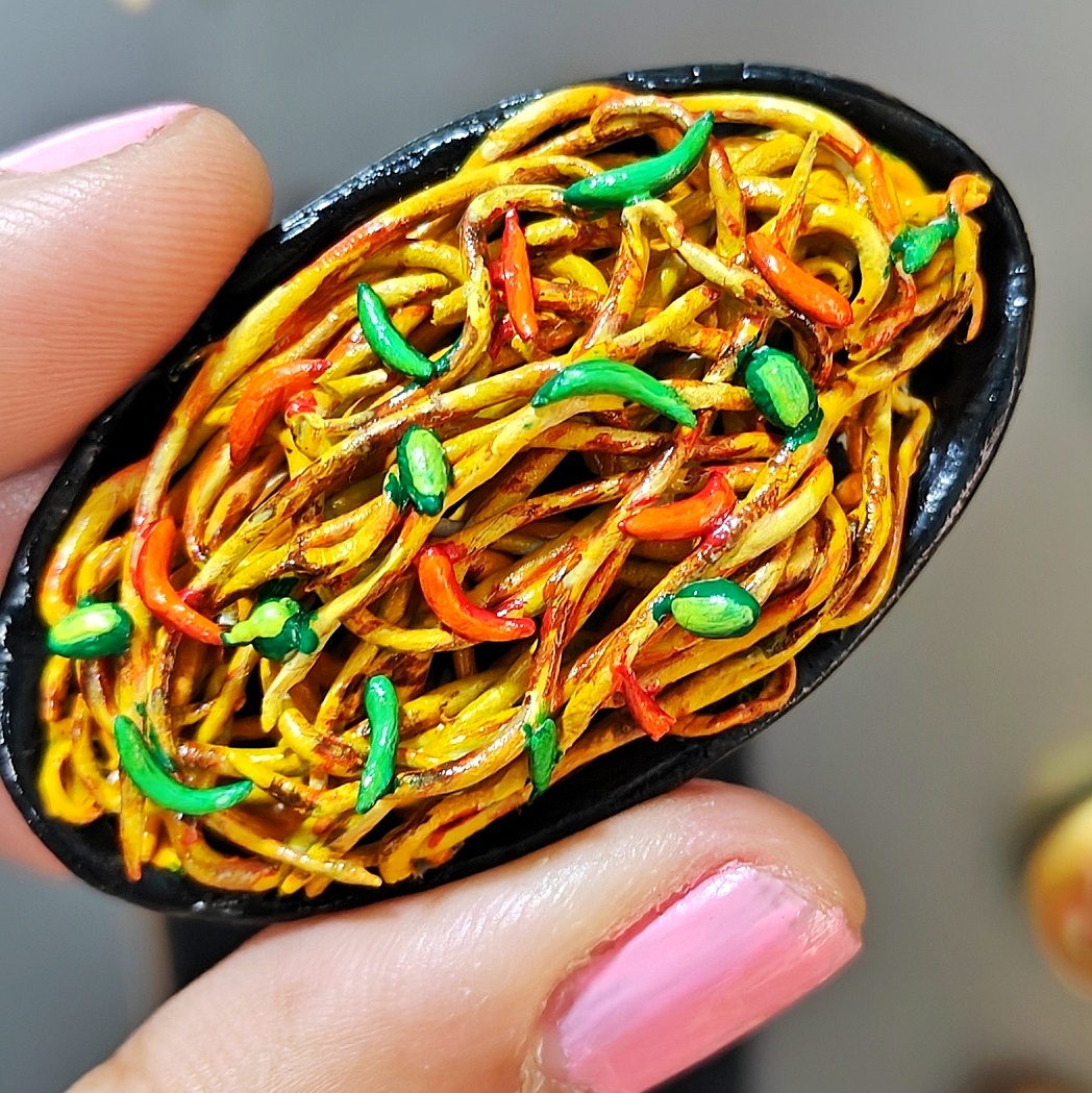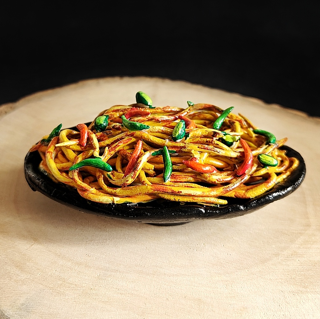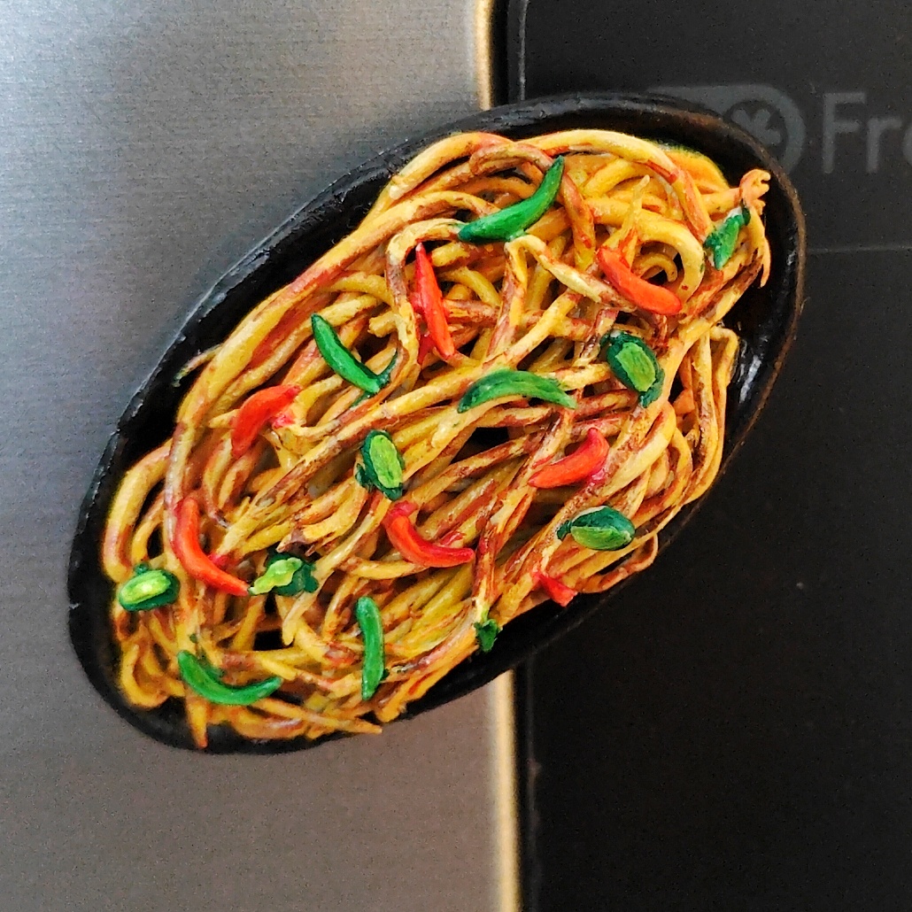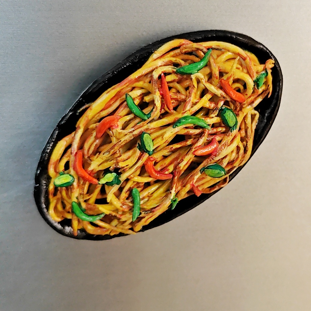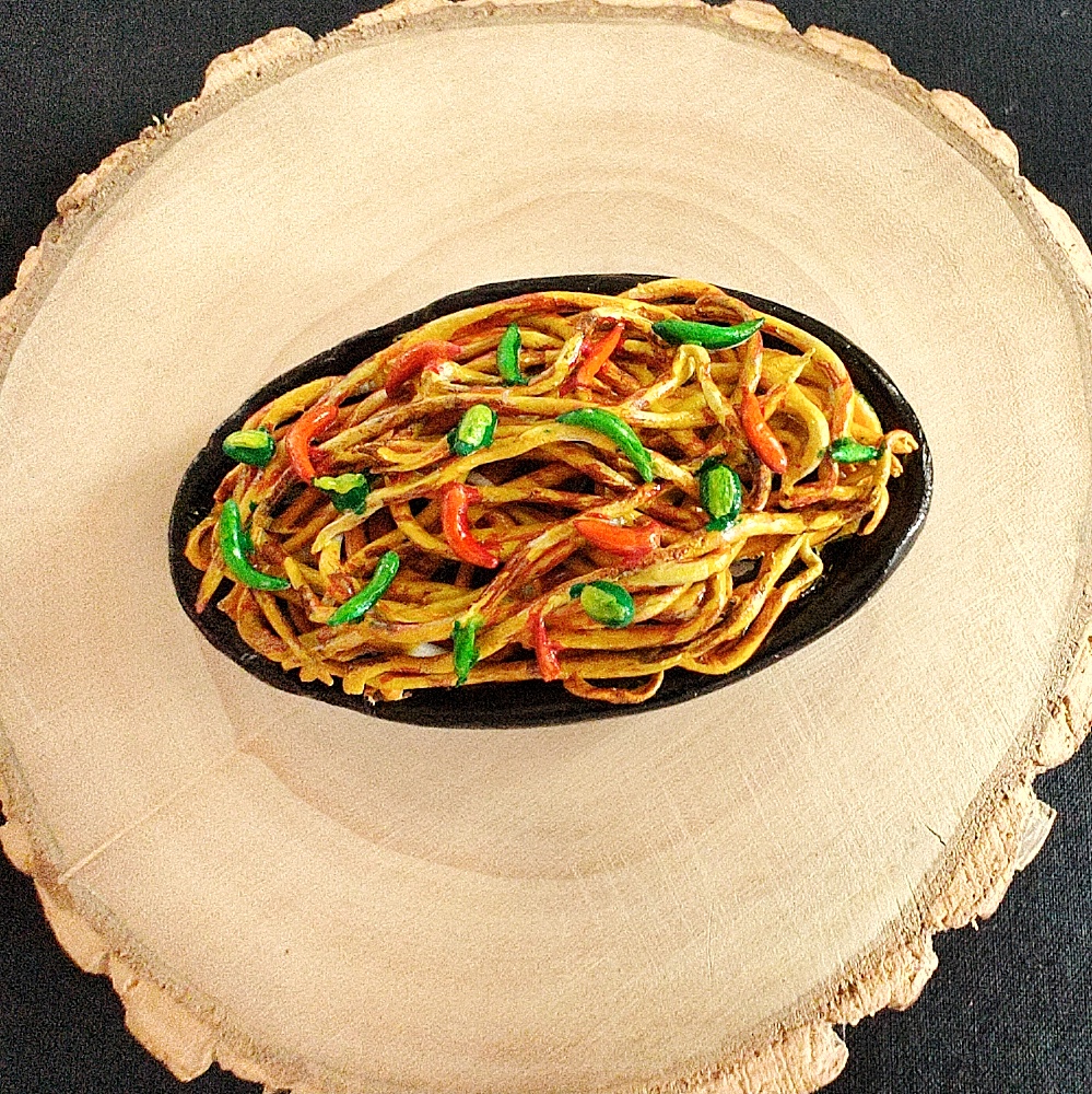 Add a dash of street food magic to your space with this handcrafted Chowmein fridge magnet. Featuring perfectly tossed noodles with vibrant peppers, carrots, and spring onions, this miniature captures the essence of hot, wok-fried Indian-Chinese chowmein served fresh at roadside stalls. A playful yet elegant piece for kitchen décor, foodies, and miniature art lovers.