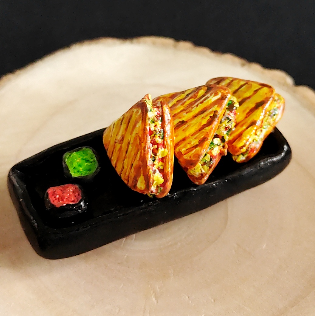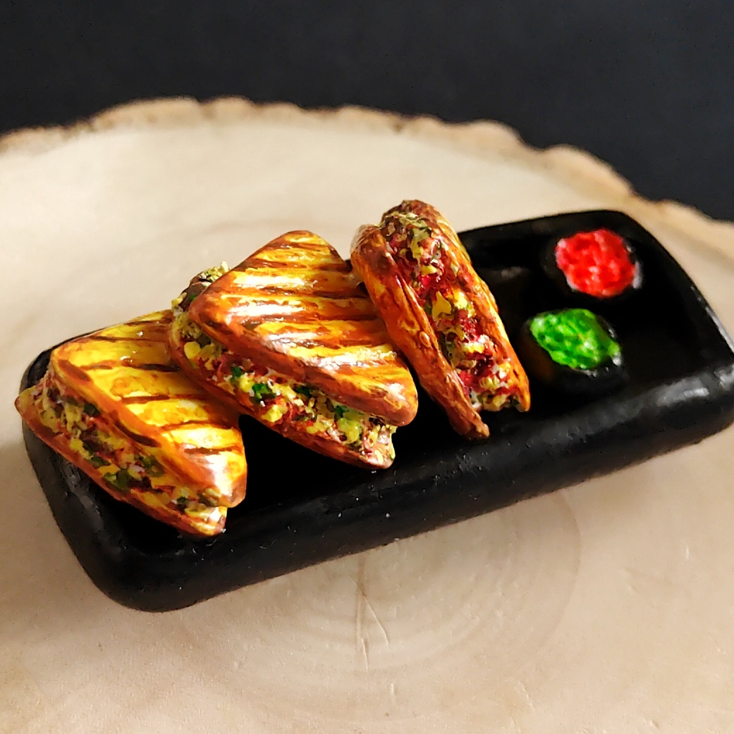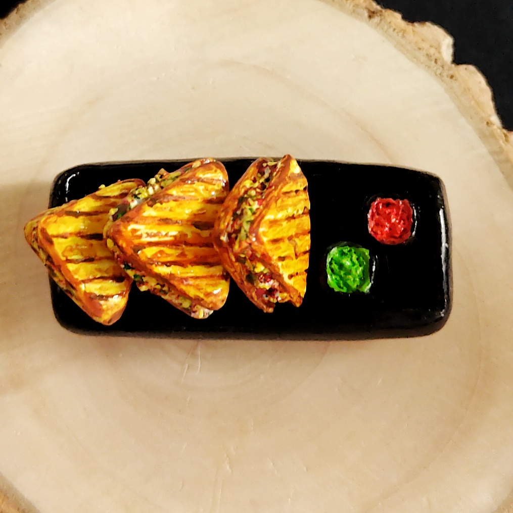 Bring café vibes straight to your fridge with this handcrafted grilled sandwich plate fridge magnet. Featuring three perfectly toasted, golden-brown sandwiches filled with colorful stuffing, served on a sleek black plate alongside vibrant green chutney and tangy red sauce, this miniature captures the irresistible charm of a classic Indian-style sandwich platter. Perfect for kitchen décor, collectors, and food lovers.