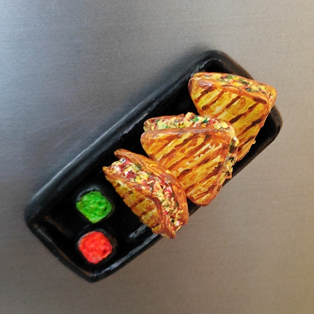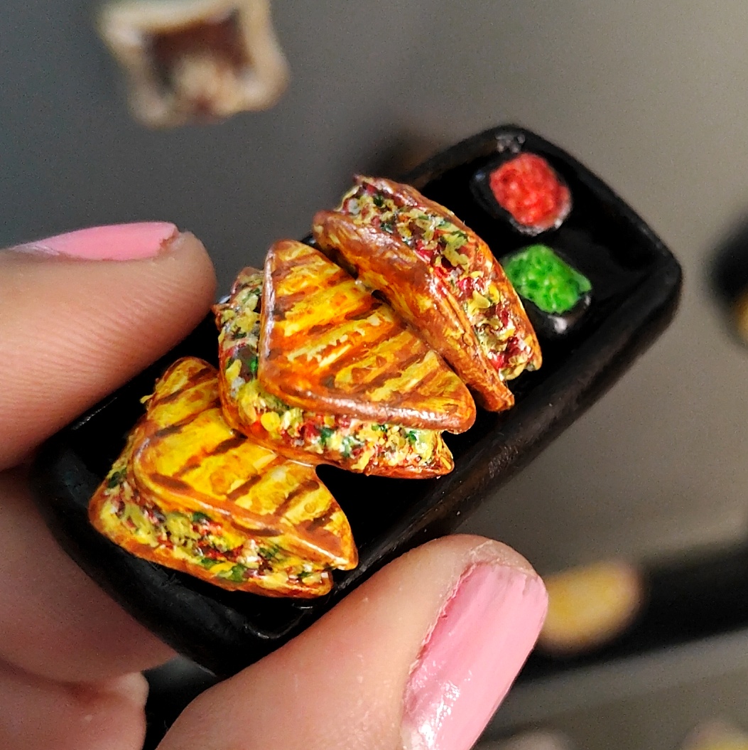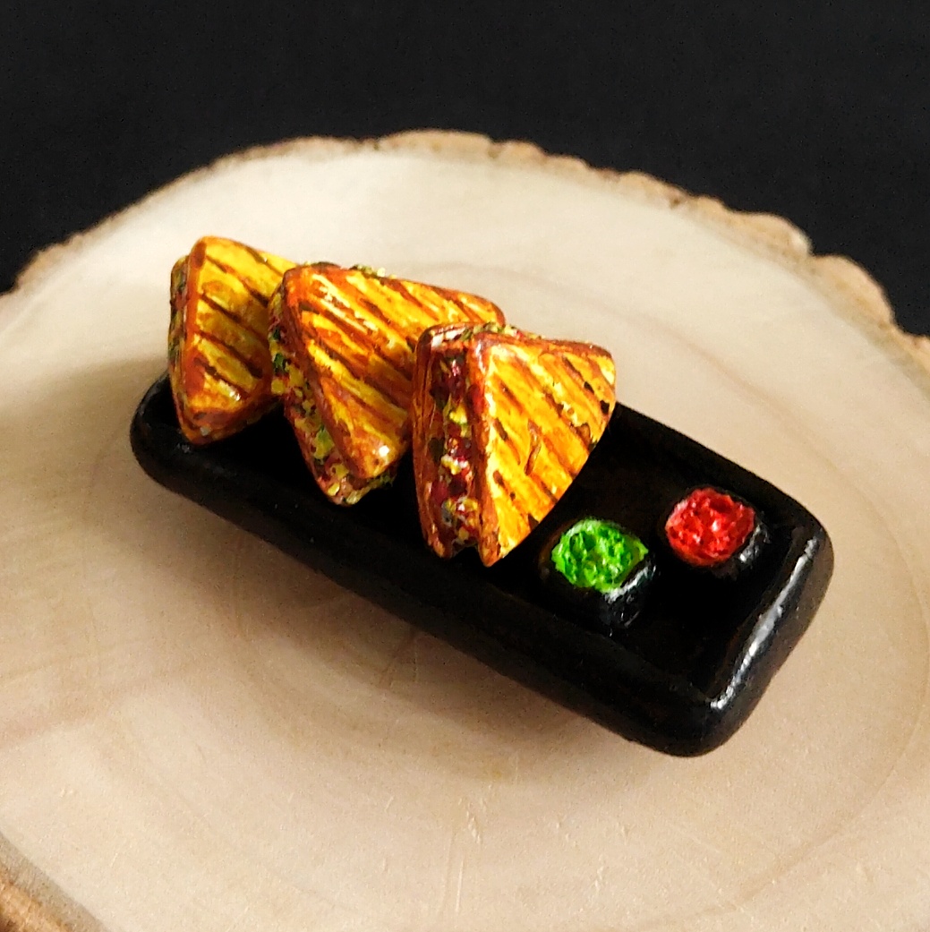Bring café vibes straight to your fridge with this handcrafted grilled sandwich plate fridge magnet. Featuring three perfectly toasted, golden-brown sandwiches filled with colorful stuffing, served on a sleek black plate alongside vibrant green chutney and tangy red sauce, this miniature captures the irresistible charm of a classic Indian-style sandwich platter. Perfect for kitchen décor, collectors, and food lovers.