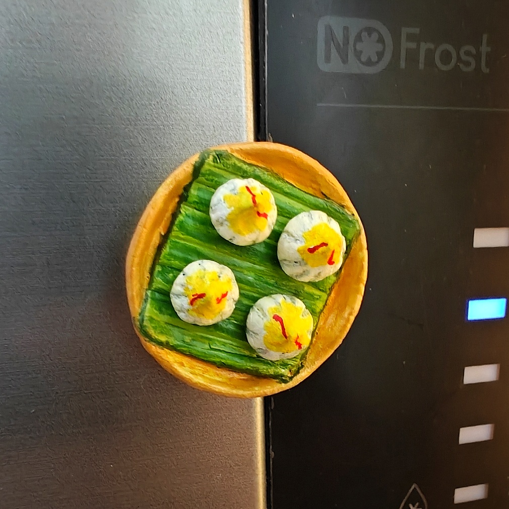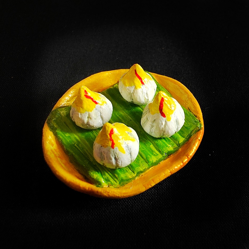 Celebrate the sweetness of Indian traditions with this handcrafted Modak Plate fridge magnet. Featuring four perfectly shaped modaks, delicately painted in white with golden-yellow highlights and a touch of saffron red, this miniature sits beautifully on a banana leaf placed over a golden-rimmed plate. A charming reminder of festive treats, especially loved during Ganesh Chaturthi.