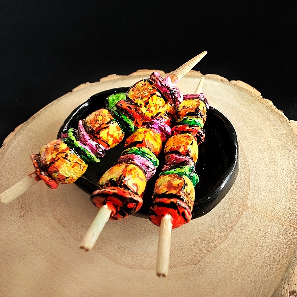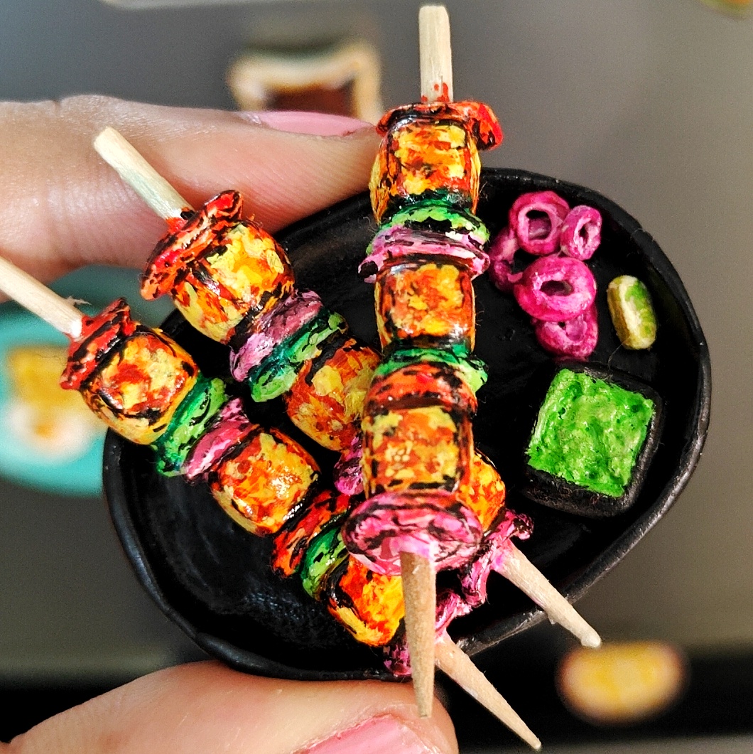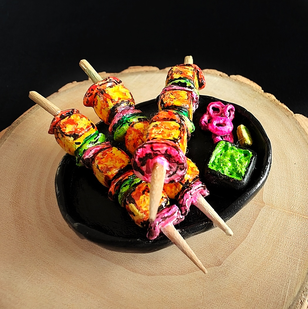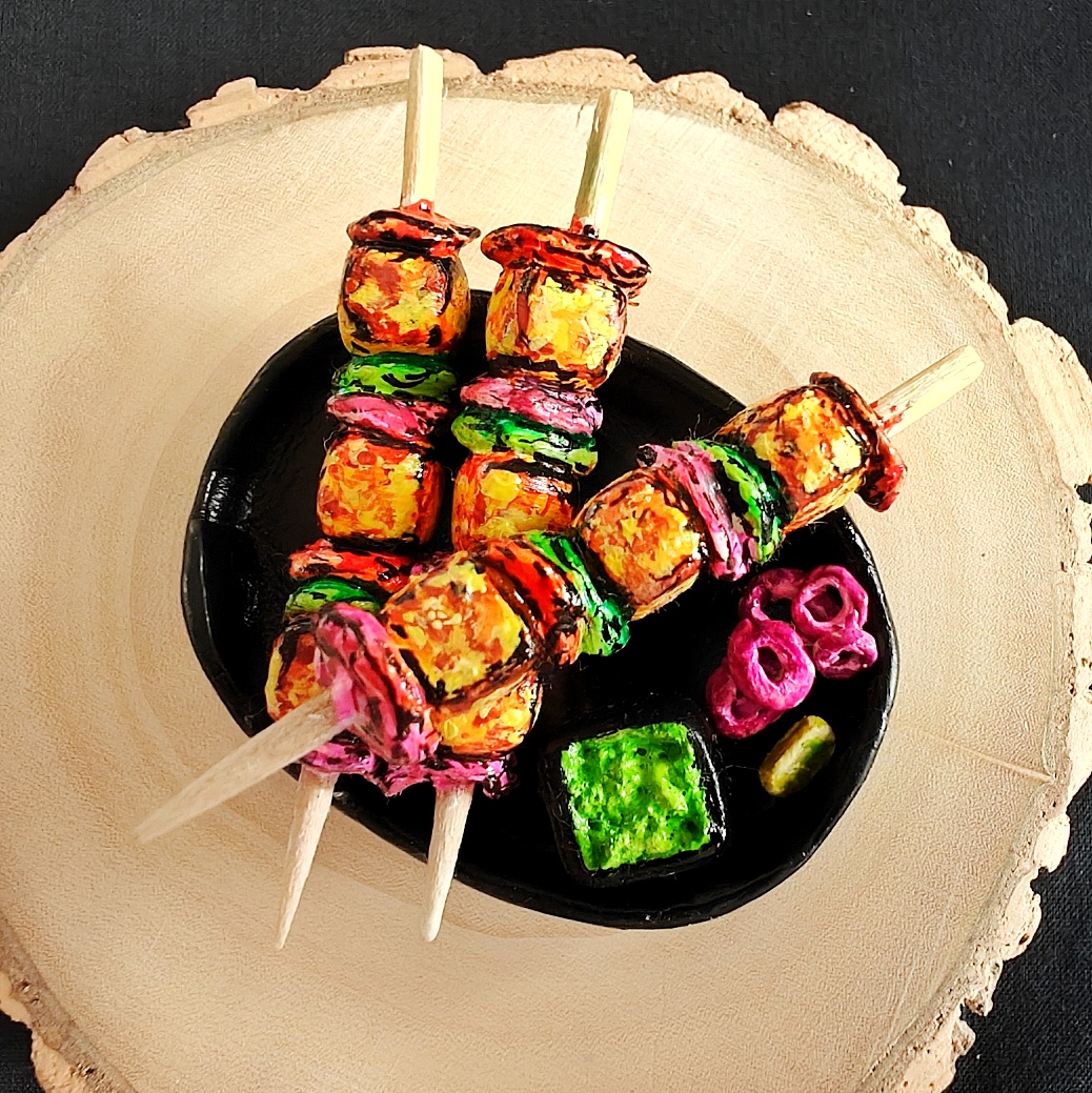 Realistic Miniature Art – Skewers with paneer, onion, capsicum, chutney, and pickled onion.
