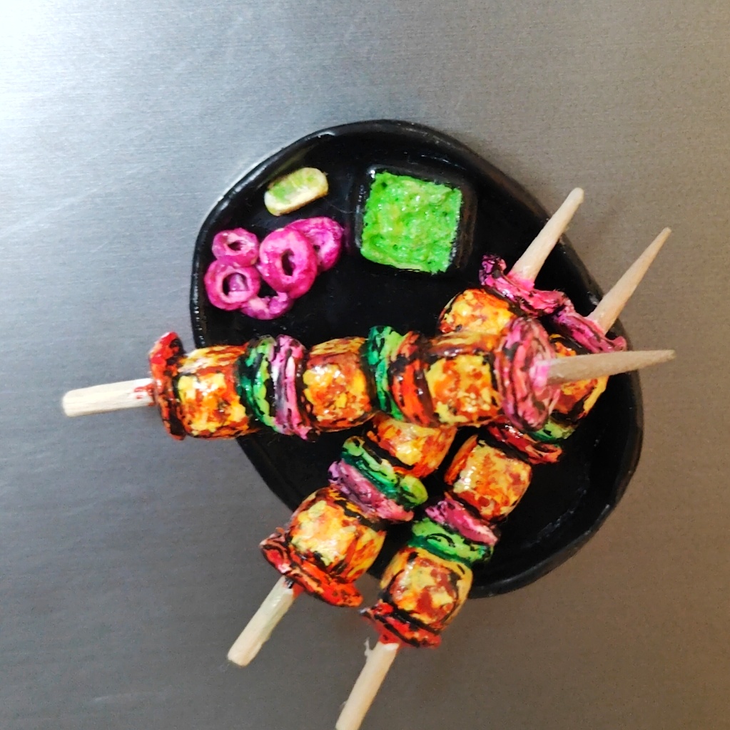 Bring home the smoky charm of a North Indian BBQ with this vibrant, handmade paneer tikka fridge magnet!