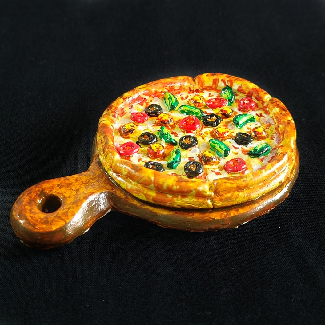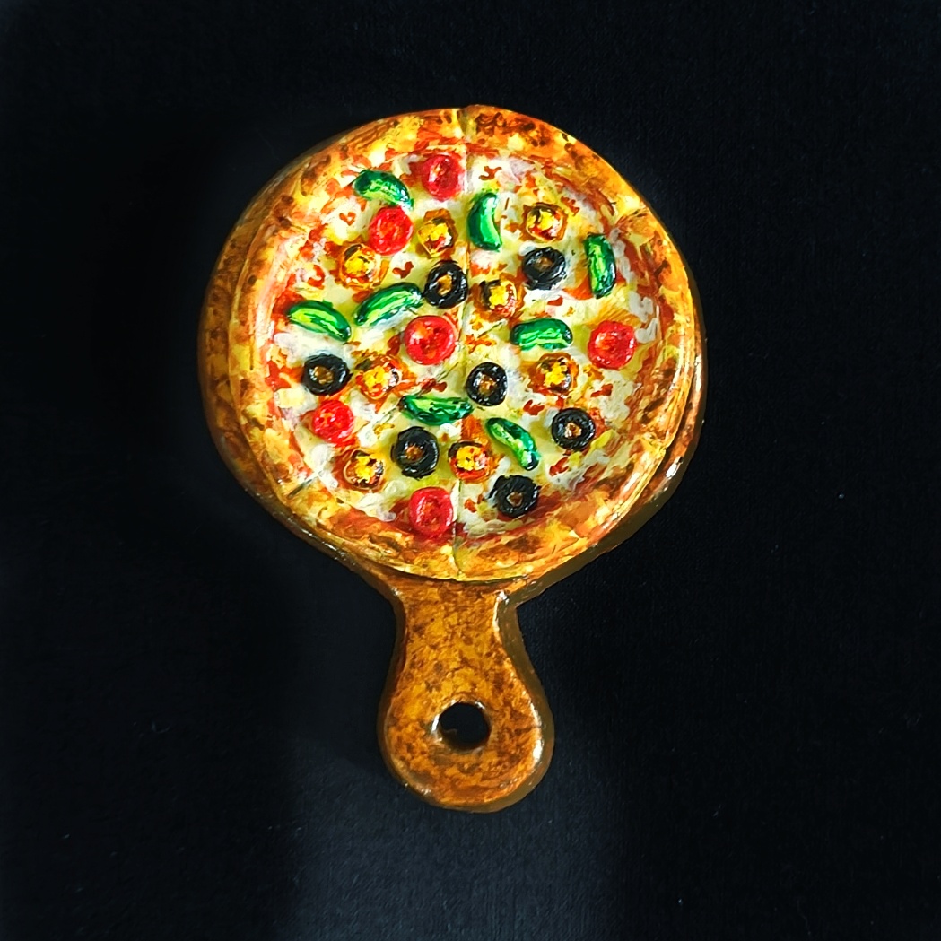 Add a slice of delicious charm to your home décor with this handcrafted wooden base vegetable pizza fridge magnet. Topped with realistic paneer cubes, fresh capsicum slices, juicy cherry tomatoes, and black olives, this miniature captures the mouthwatering appeal of a freshly baked pizza straight from the oven. Perfect for pizza lovers, kitchen décor enthusiasts, or anyone who enjoys quirky handmade art.