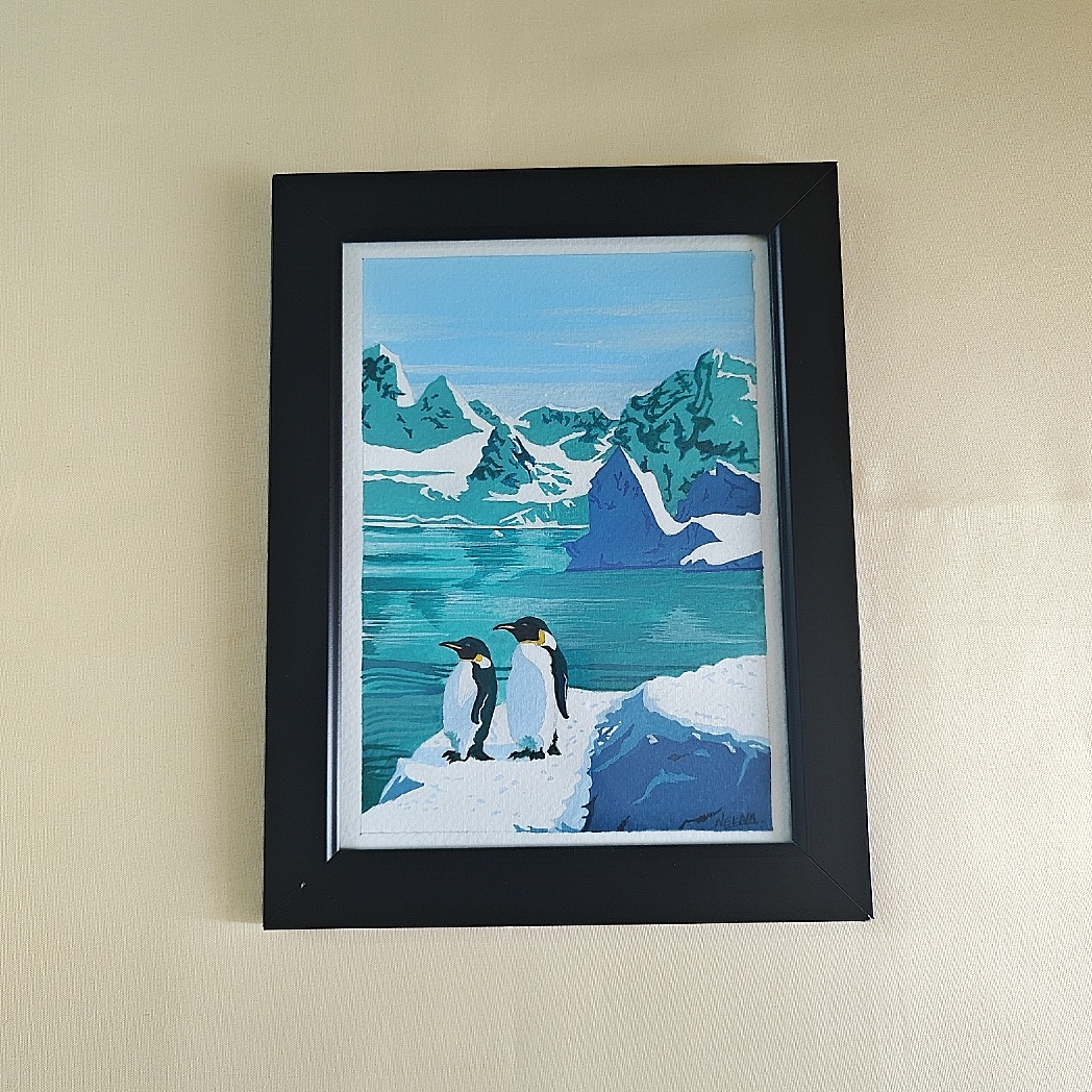 This A5 painting comes framed in a sleek black synthetic wood frame, providing the perfect contrast to the icy tones of the artwork. The frame is durable, lightweight, and ready to hang or place on desks, shelves, or side tables. Its compact size allows it to seamlessly fit into both small and large spaces, adding a touch of Arctic elegance without overwhelming your decor.
