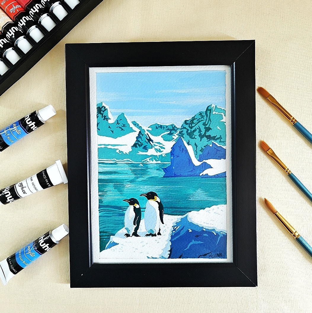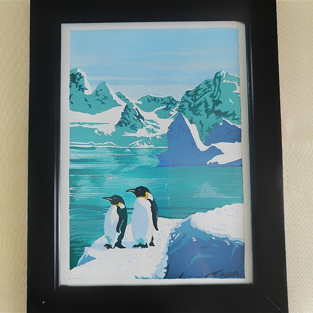 Penguins Acrylic Landscape Painting is more than just a decorative piece—it is a handcrafted artwork that brings the serene beauty of the Arctic directly into your home. This A5 framed painting captures the stillness of snow-covered mountains, the crystal-clear icy waters, and the heartwarming presence of two adorable penguins. Every brushstroke has been carefully applied with premium acrylic paints to convey not only the visual charm but also the emotional warmth and companionship these birds symbolize. It is perfect for nature enthusiasts, wildlife lovers, or anyone seeking a calming, uplifting atmosphere in their living space.