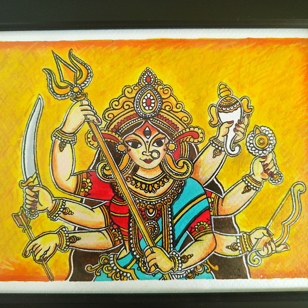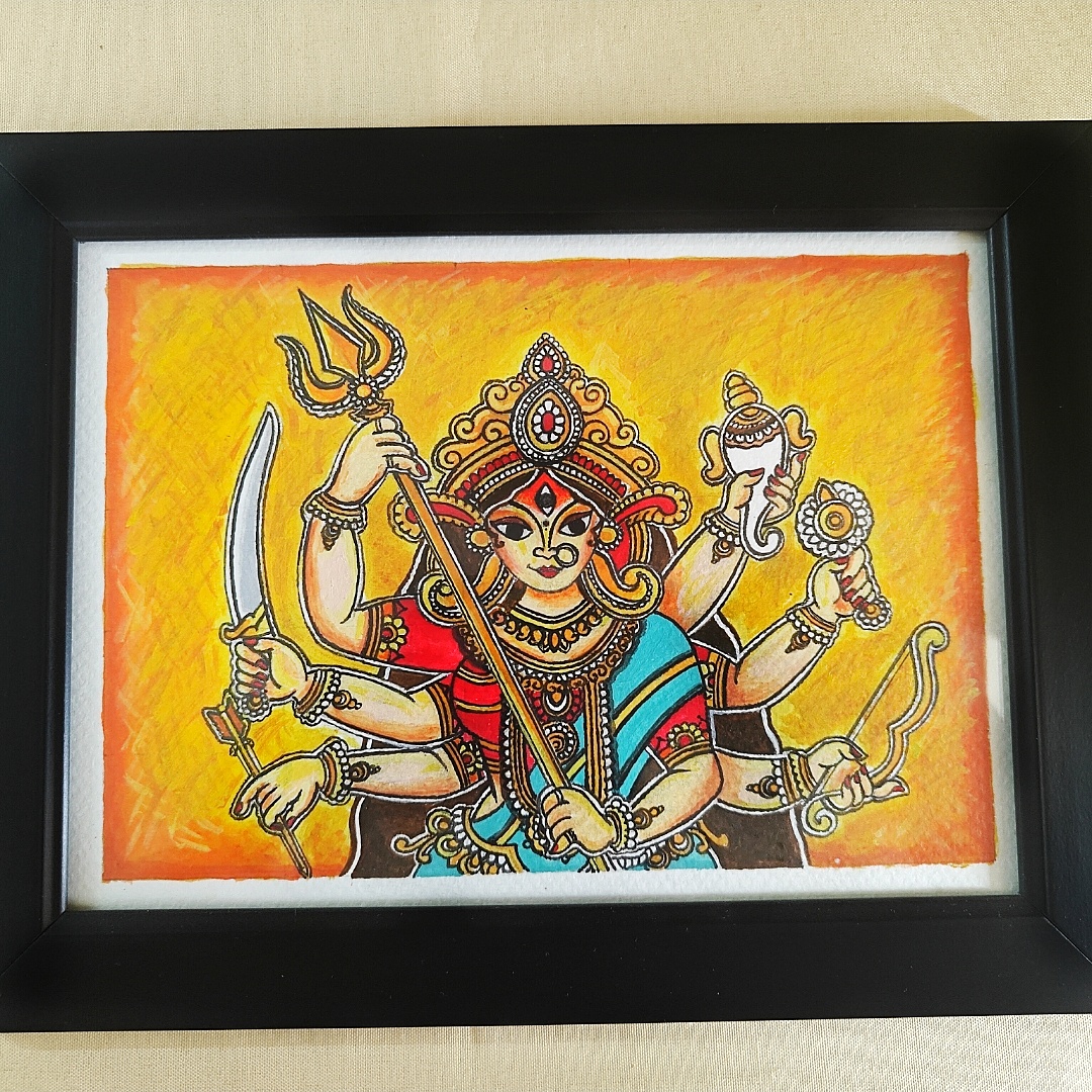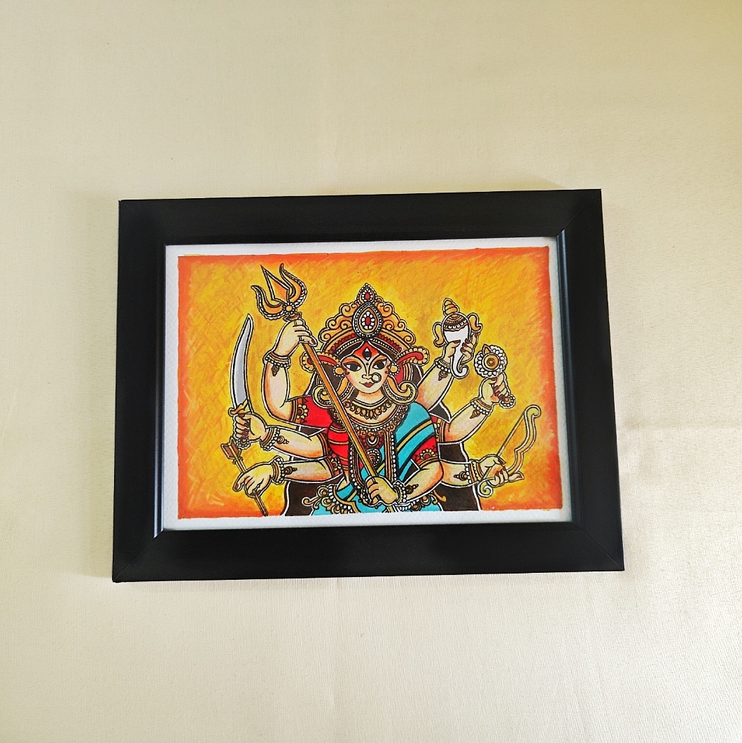 Channel the divine energy of Shakti into your space with this vivid acrylic painting of Maa Durga in her most powerful form. Depicted with ten arms holding sacred weapons, the goddess radiates strength, fearlessness, and maternal grace, all set against a fiery orange background symbolizing transformation and cosmic energy. Her third eye, red bindi, and serene yet fierce expression remind devotees of her boundless protective power. The use of bold strokes and vibrant hues makes this artwork not only devotional but also a visually arresting masterpiece. Perfectly framed and ready to uplift your sacred space, this painting invokes blessings, protection, and the fearless strength of Maa in every corner.