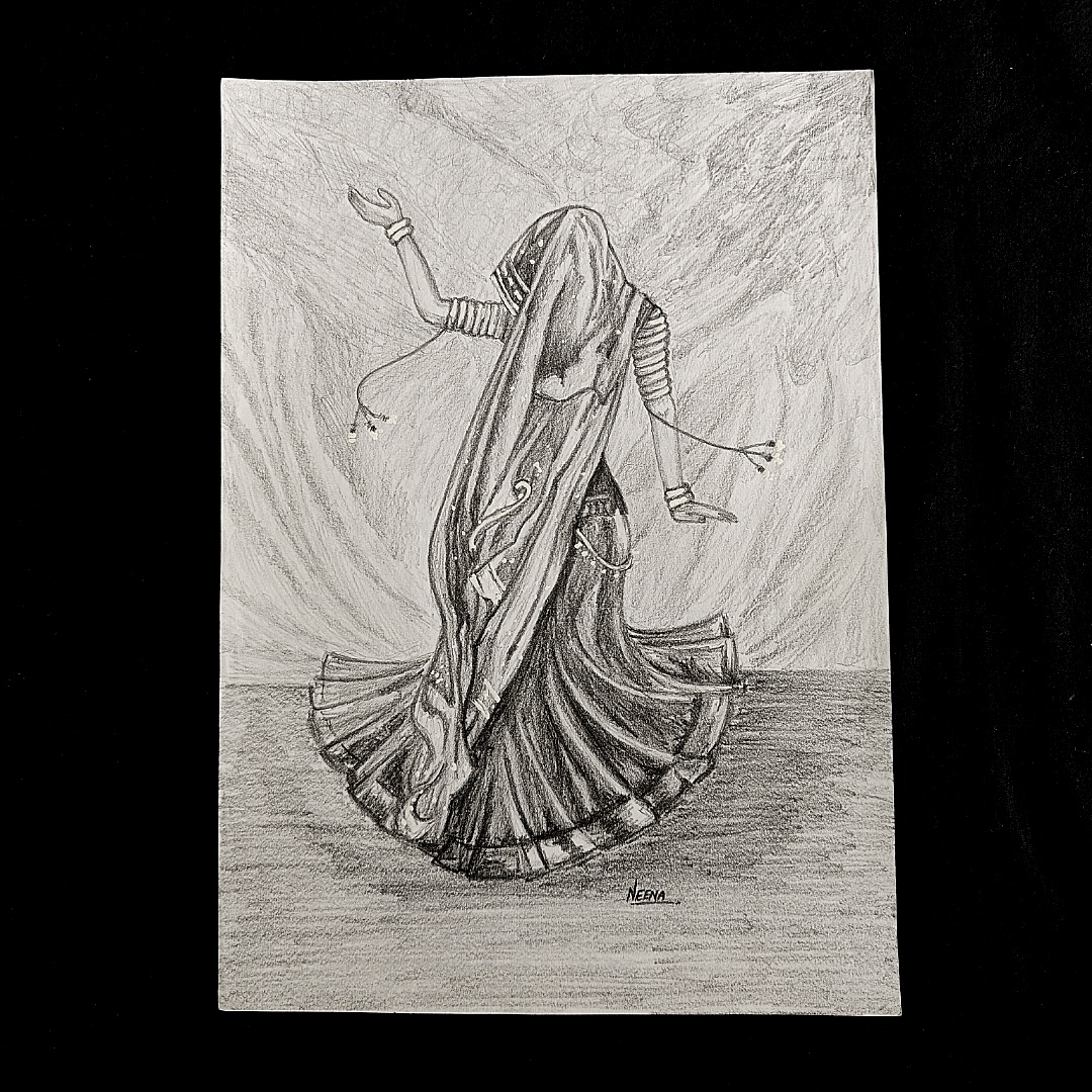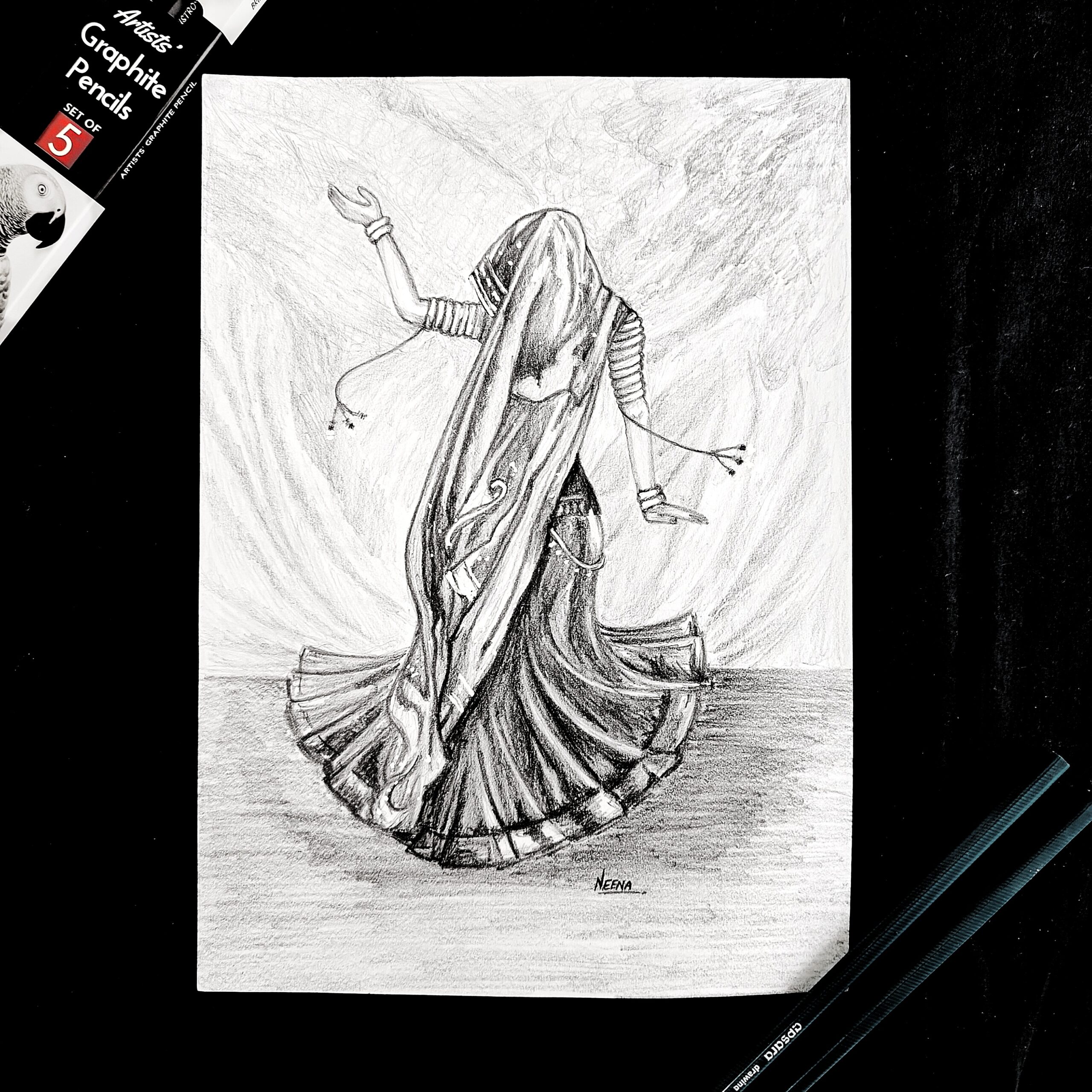 Crafted with patience and precision, this Realistic Ethnic Dance Sketch beautifully illustrates the grace of traditional Indian dance. The flowing garments and dynamic posture capture movement in stillness, making it feel as though the dancer is twirling before your eyes. The monochrome medium allows the viewer to focus on textures, shadows, and intricate detailing, highlighting the expertise involved in capturing both motion and emotion. Unlike prints or digital reproductions, this hand-drawn sketch carries the authenticity and soul of artisanal craftsmanship, giving your walls a unique story of heritage and elegance.