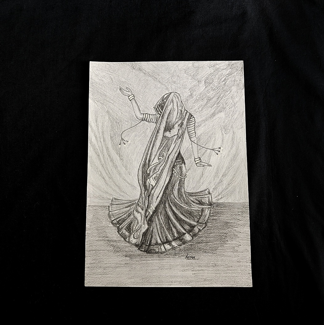 Realistic Ethnic Dance Sketch – Graceful Indian Woman in Traditional Attire Twirling (A4 Size)