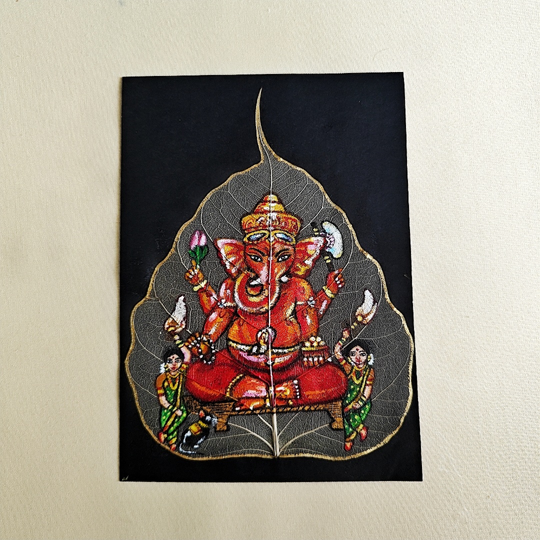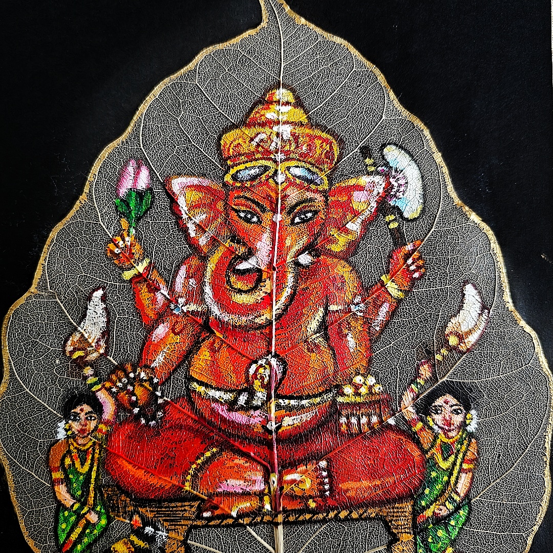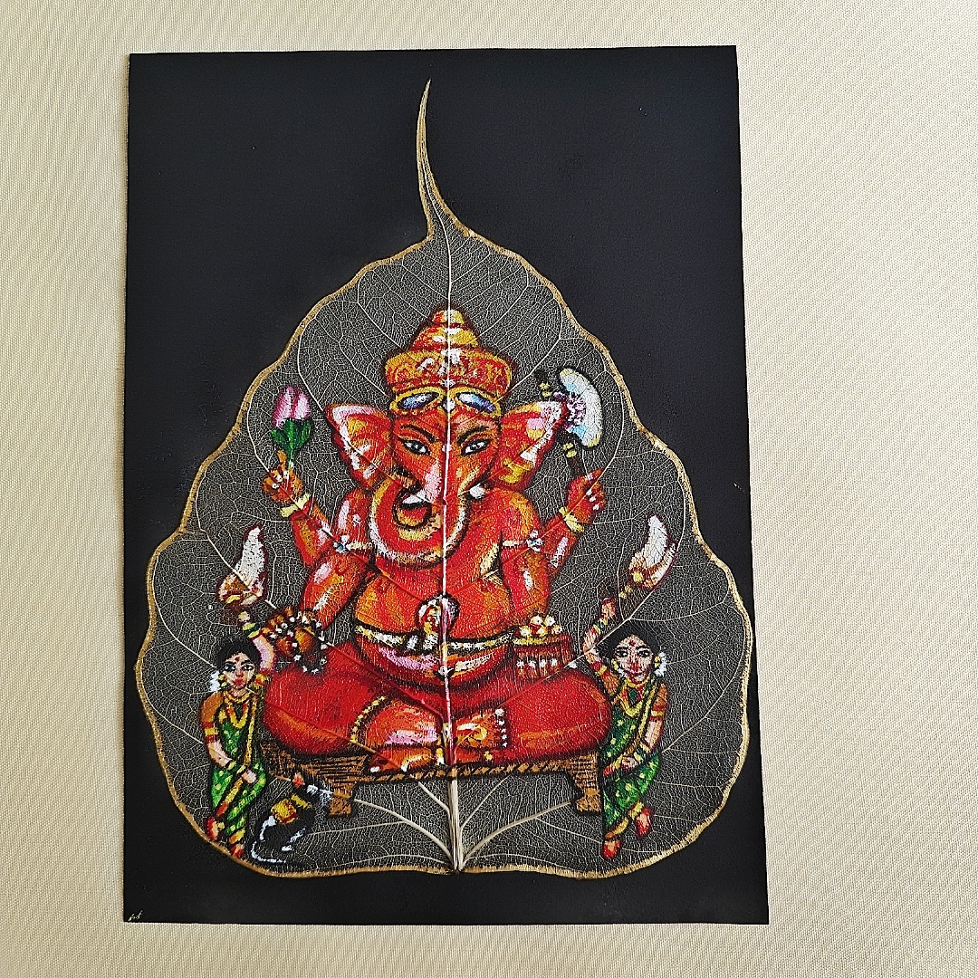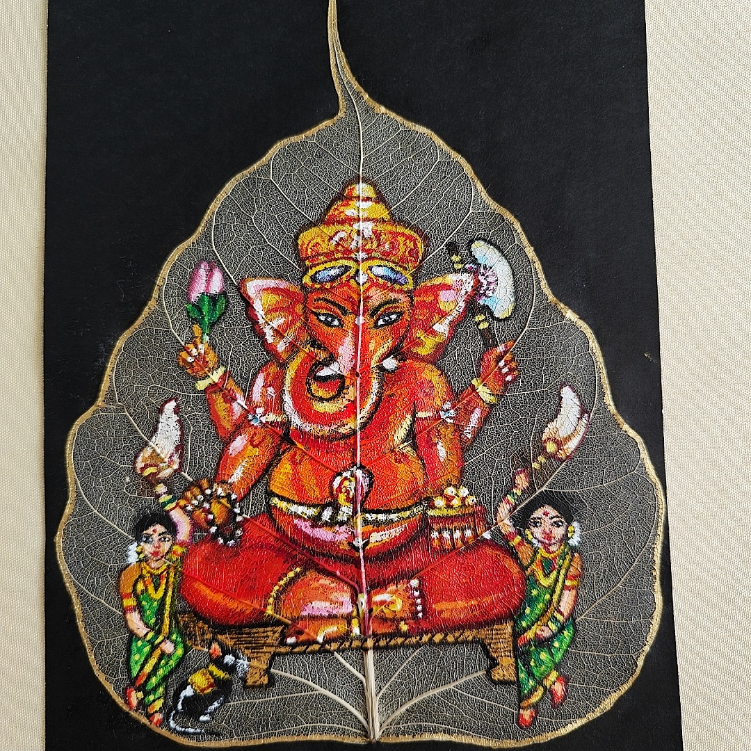 Siddhivinayak Acrylic Painting on Peepal Skeleton Leaf – A Unique Handcrafted Artwork (A5 Size)