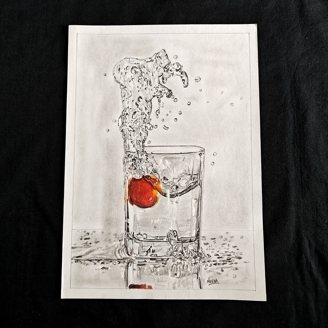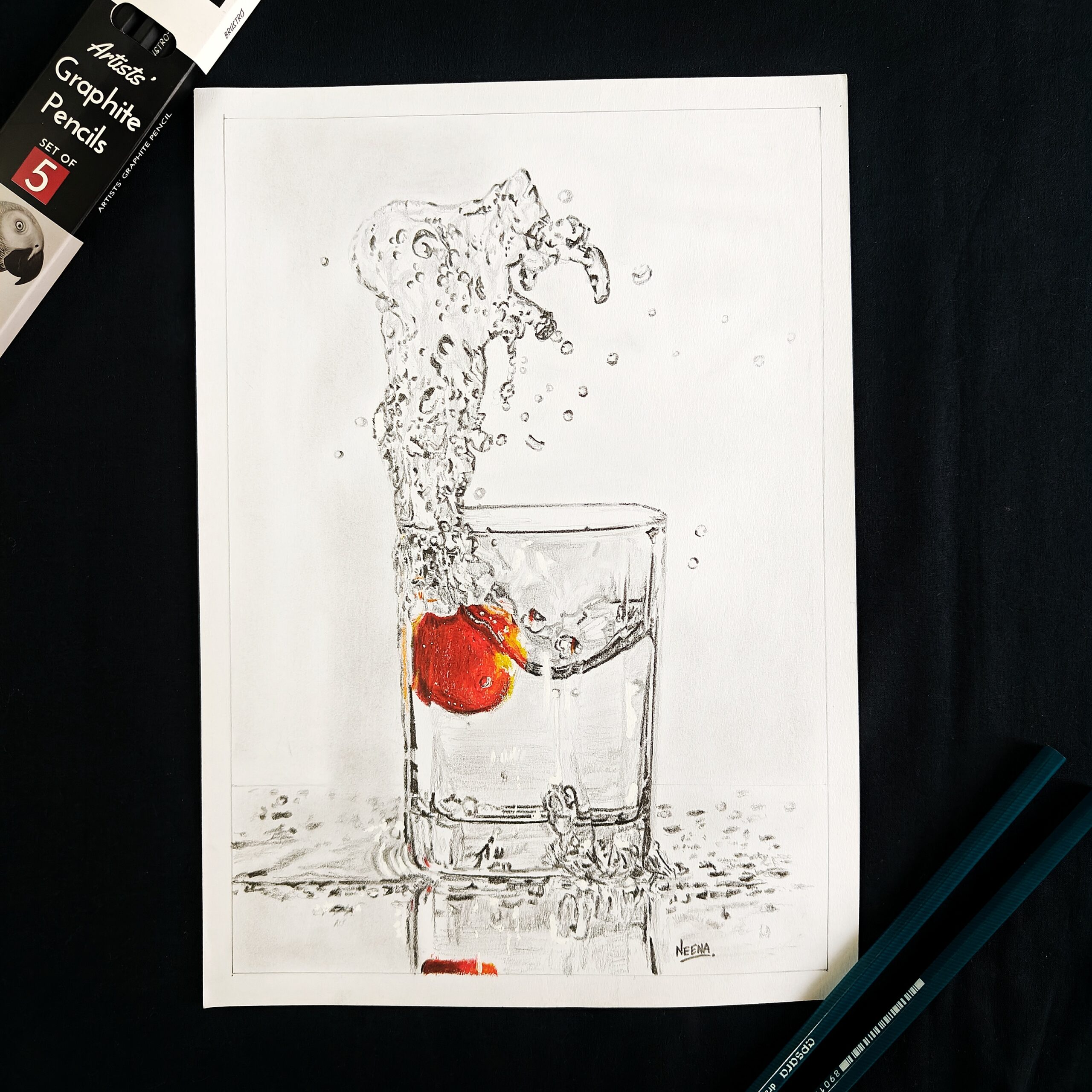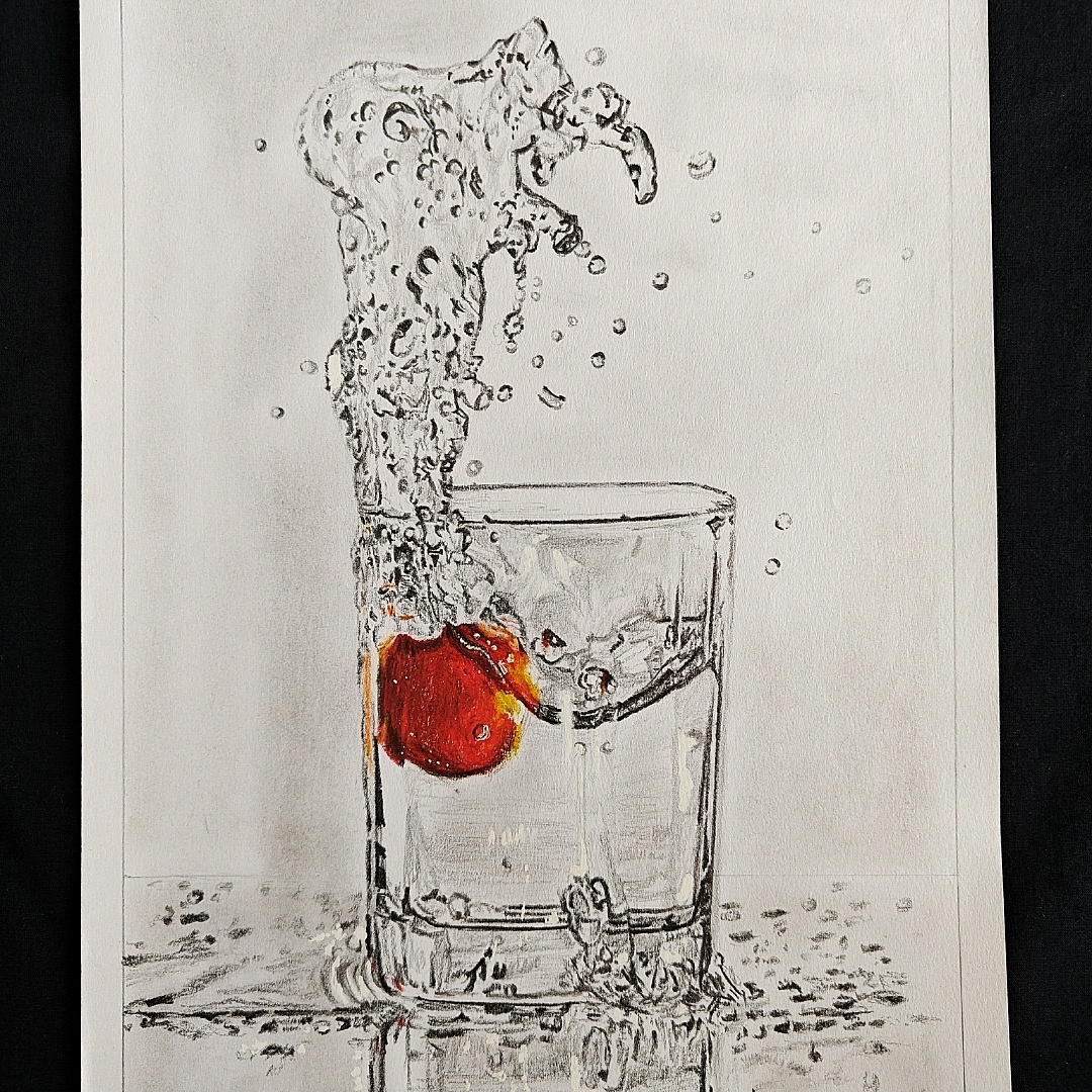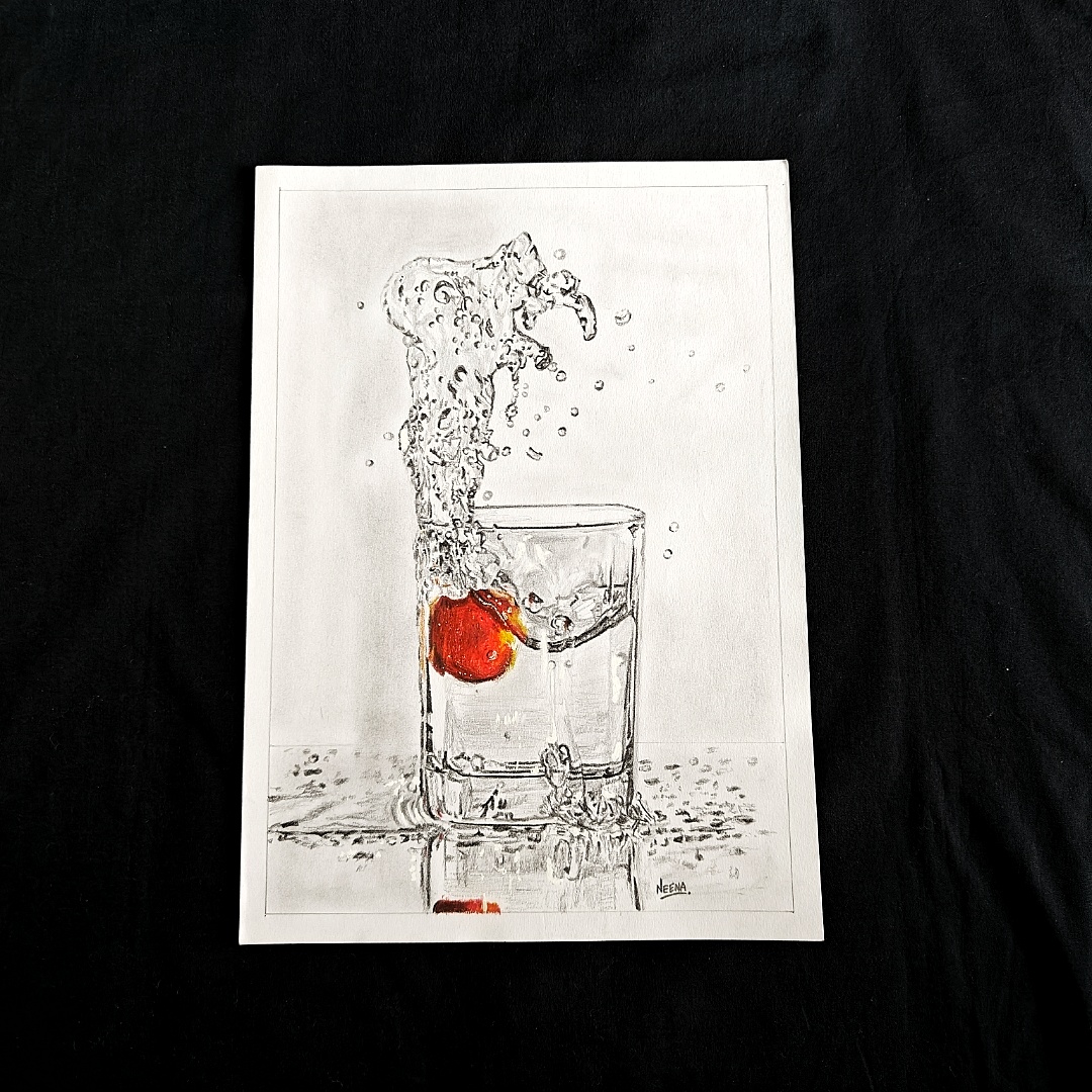 Witness the magic of realism in motion with this breathtaking pencil sketch that captures the very moment a fruit plunges into a glass of water. This A4-sized artwork freezes time as droplets rise mid-air, dancing with the burst of energy and motion. Rendered in graphite with a pop of red to highlight the fruit, the sketch delivers a photorealistic effect that’s both dynamic and deeply artistic. Perfect for modern decor or as a showpiece of technical artistry, this drawing is a true tribute to patience, precision, and perspective.