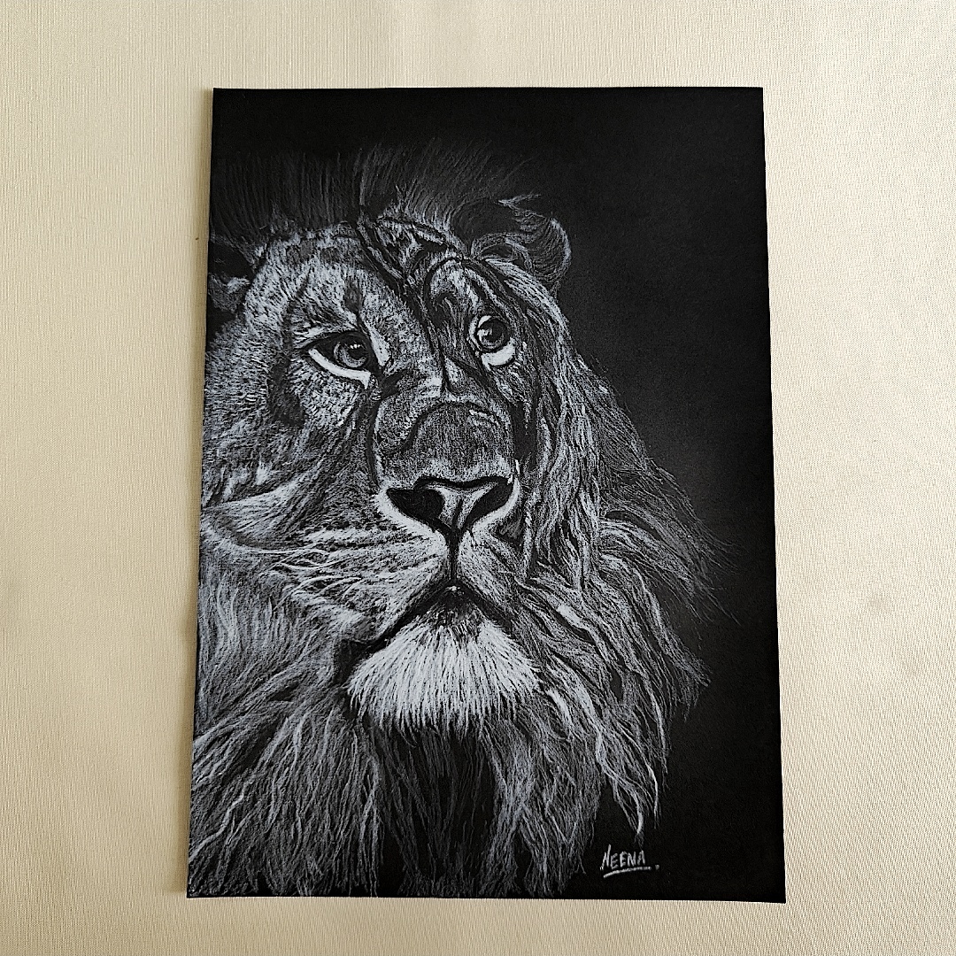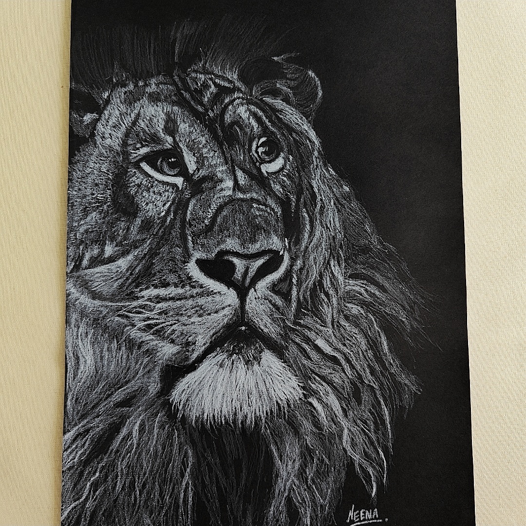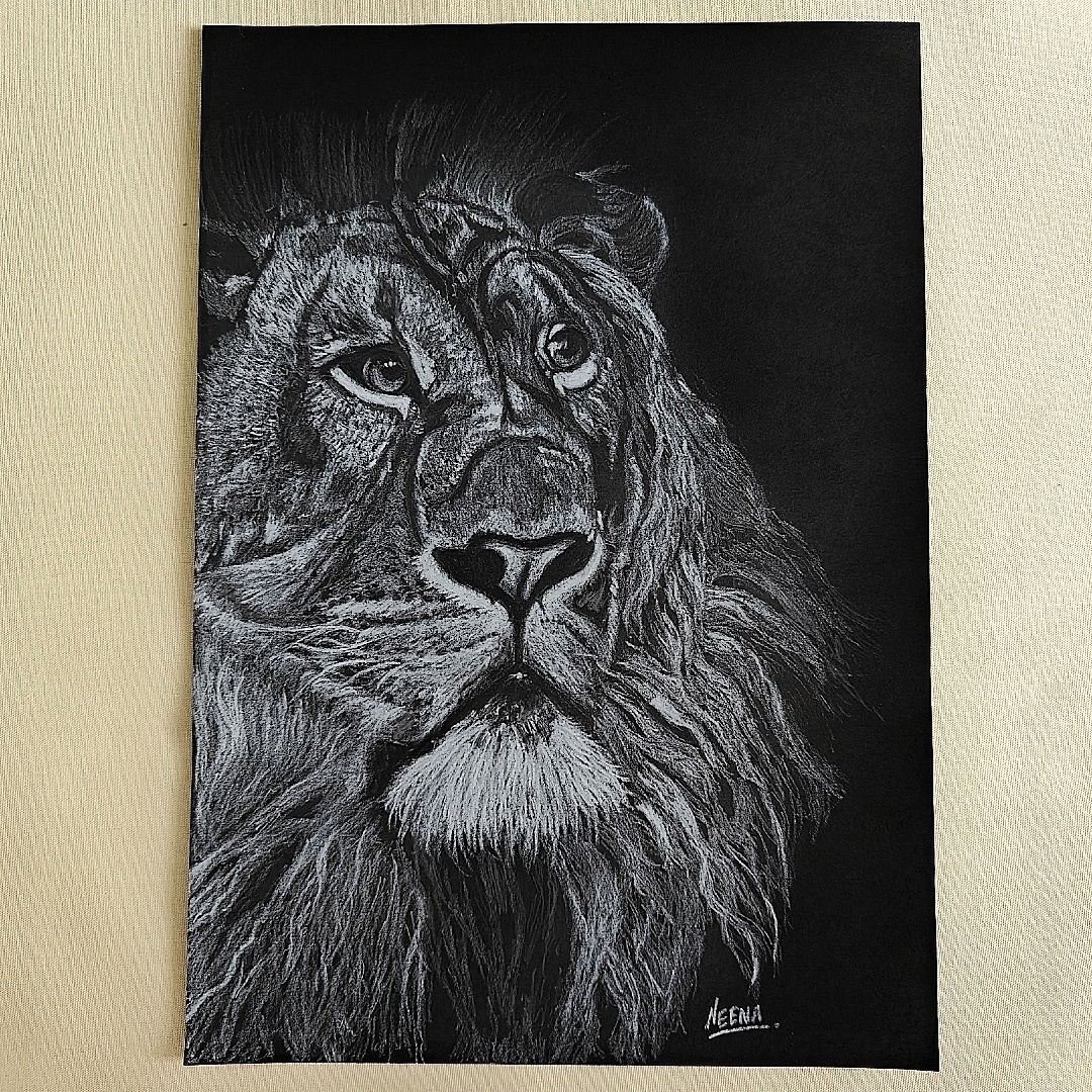 Unleash the power and poise of the wild with this stunning pencil shading portrait of a lion—etched in striking detail on a bold black background. Every line in this A4 masterpiece radiates dominance and dignity, from the fierce intensity in the lion’s eyes to the regal flow of its thick mane. The use of white pencil creates a dramatic contrast that heightens the depth and realism of the sketch, capturing not just the face, but the fearless spirit of the jungle king. This artwork is a statement piece, perfect for interiors that seek to inspire strength, focus, and quiet authority.