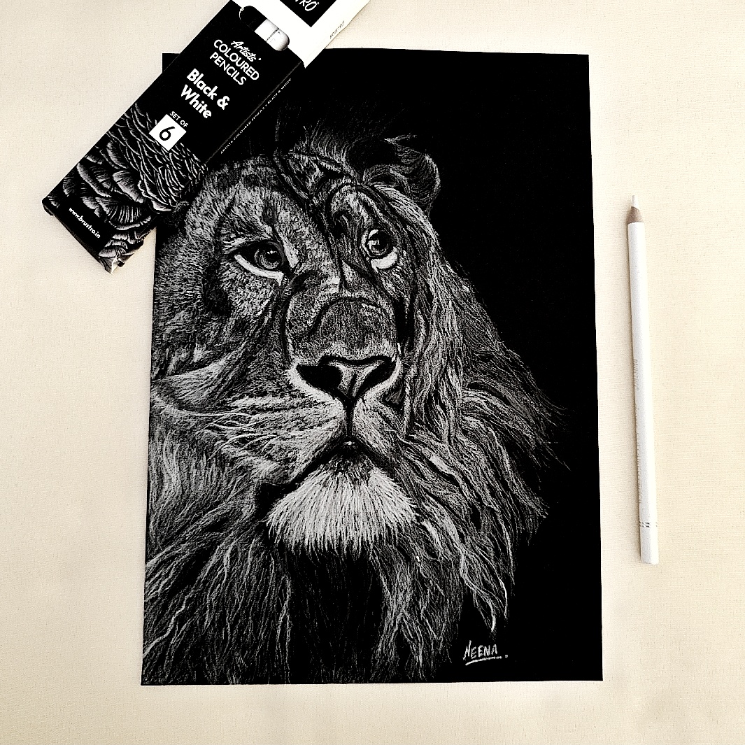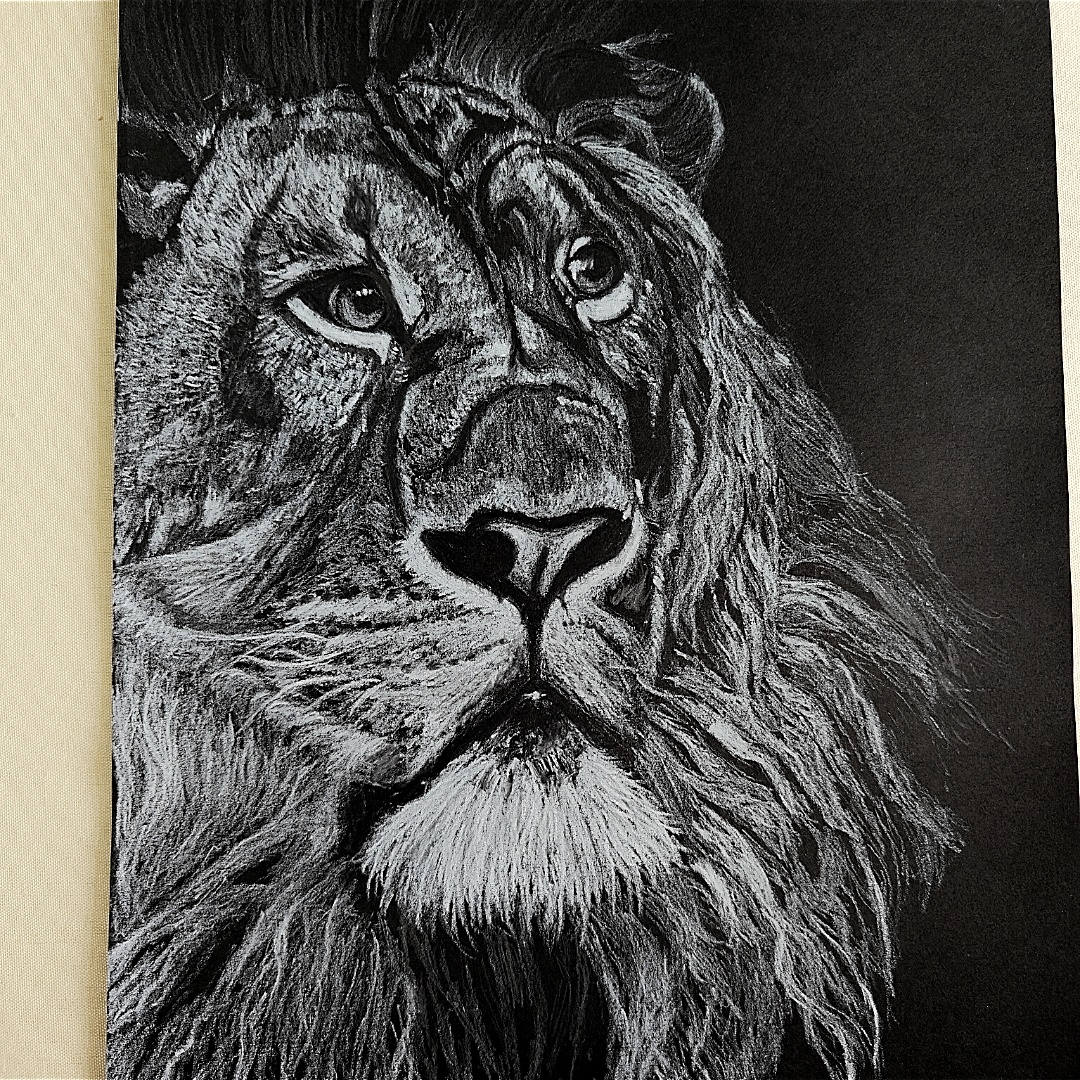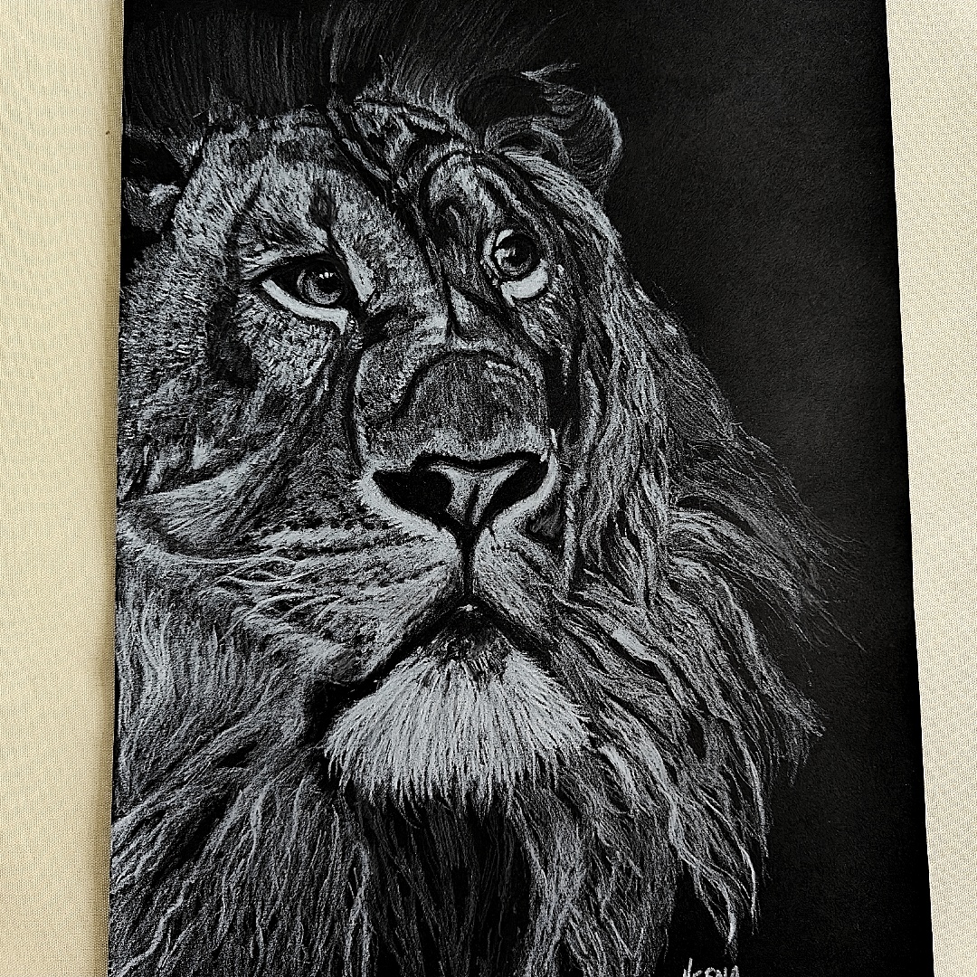 Unleash the power and poise of the wild with this stunning pencil shading portrait of a lion—etched in striking detail on a bold black background. Every line in this A4 masterpiece radiates dominance and dignity, from the fierce intensity in the lion’s eyes to the regal flow of its thick mane. The use of white pencil creates a dramatic contrast that heightens the depth and realism of the sketch, capturing not just the face, but the fearless spirit of the jungle king. This artwork is a statement piece, perfect for interiors that seek to inspire strength, focus, and quiet authority.