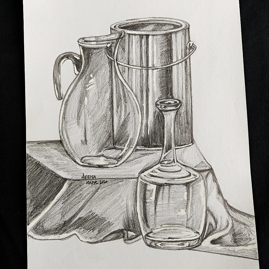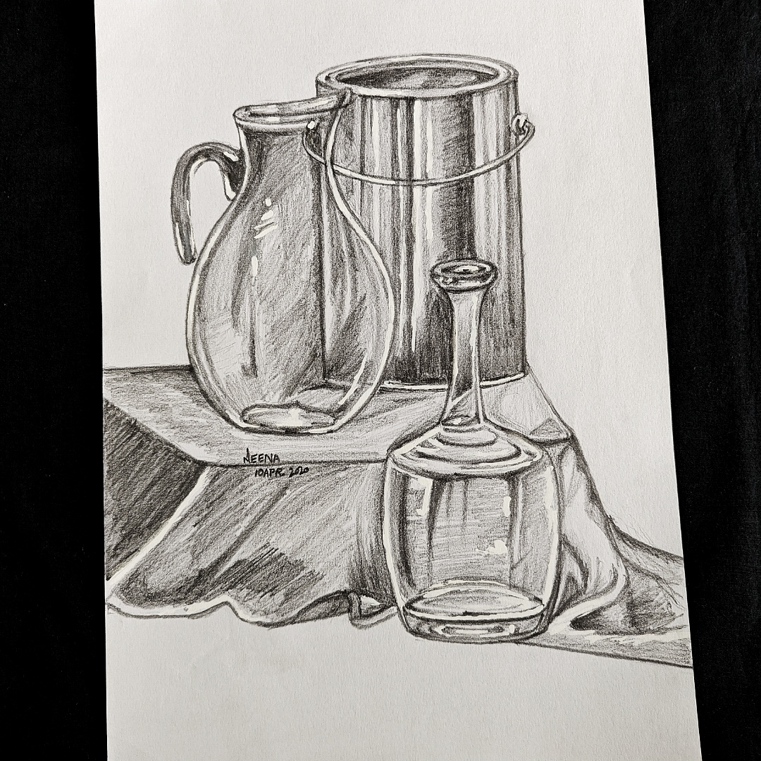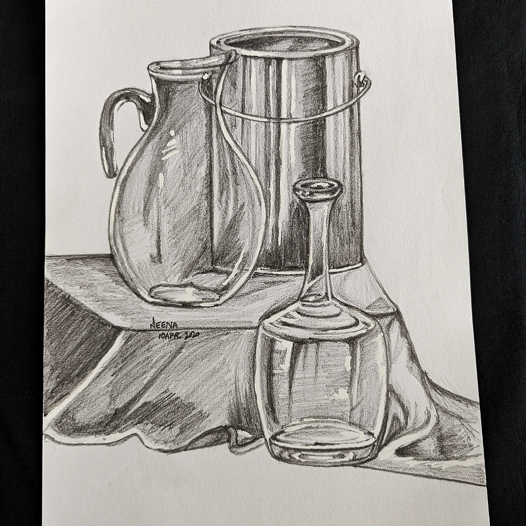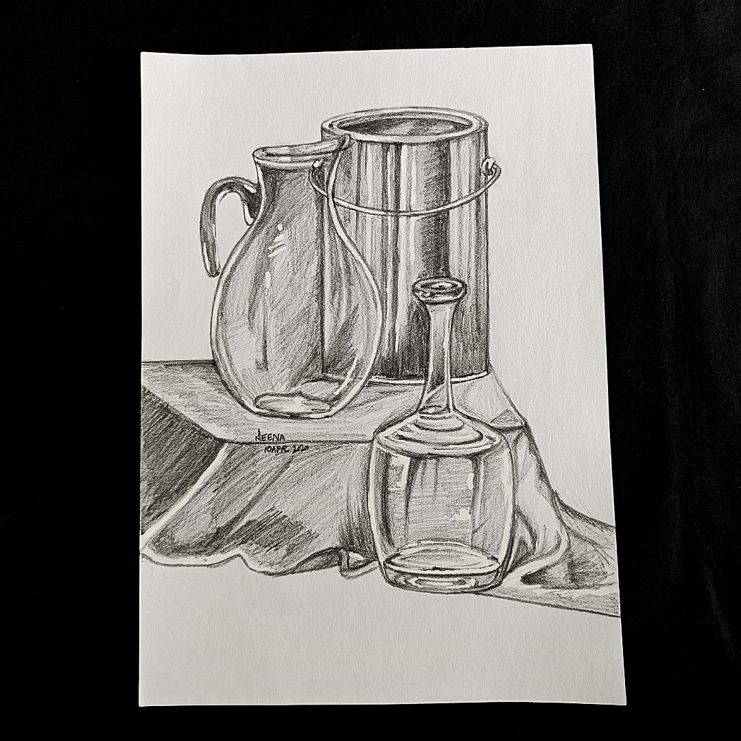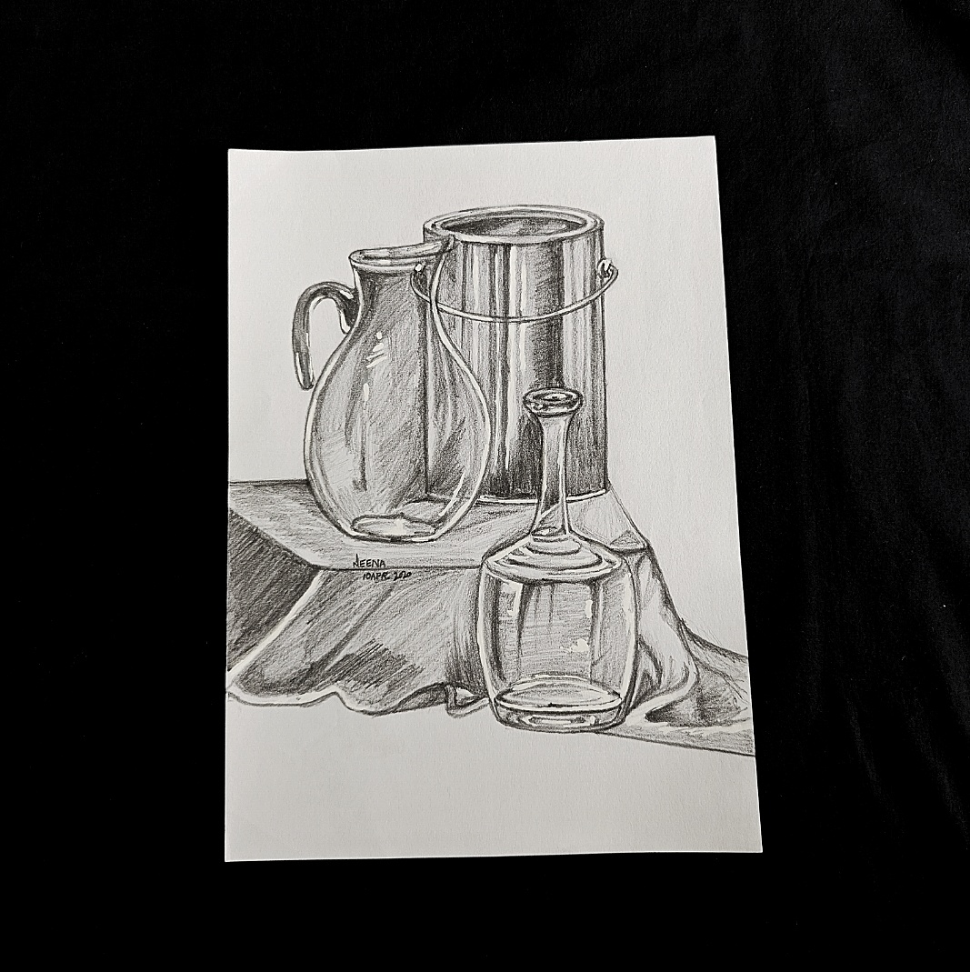 Step into the quiet poetry of everyday life with this intricately shaded still life pencil drawing. Crafted on an A4 sheet, this artwork beautifully captures the play of light and shadow across a jug, bottle, and tin, placed thoughtfully over draped fabric. With stunning reflections, textures, and depth, the drawing evokes a sense of calm elegance—inviting the viewer to appreciate the grace of ordinary objects. A timeless piece that celebrates artistic precision and visual balance, it’s a sophisticated addition to living rooms, study areas, or art-inspired spaces.
