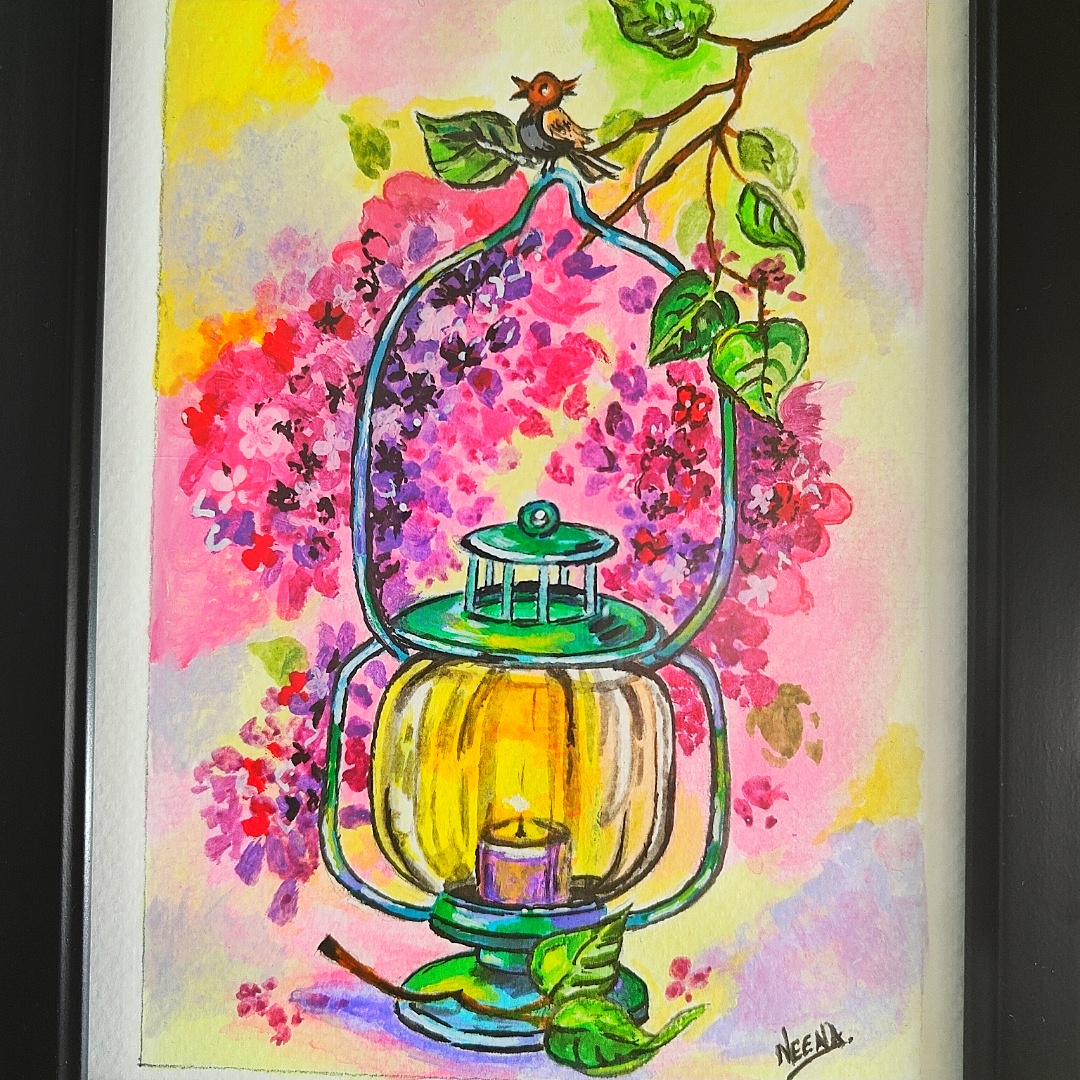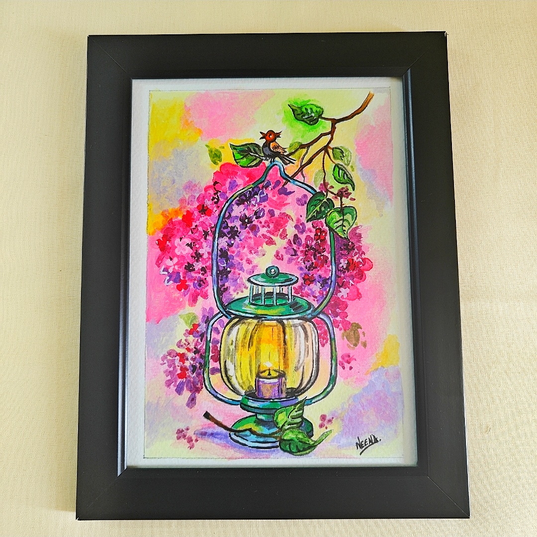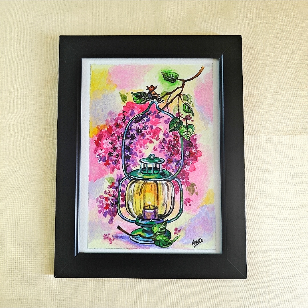 Vintage Lantern Acrylic Painting is a handcrafted artwork that brings rustic charm, floral elegance, and a gentle sense of serenity into any space. This A5 framed painting captures a glowing vintage lantern embraced by blooming pink and purple blossoms, set against a dreamy pastel backdrop. Every brushstroke has been carefully applied using high-quality acrylic paints to convey warmth, light, and delicate artistic detail, making this painting a perfect addition to your home décor or a thoughtful gift for loved ones.